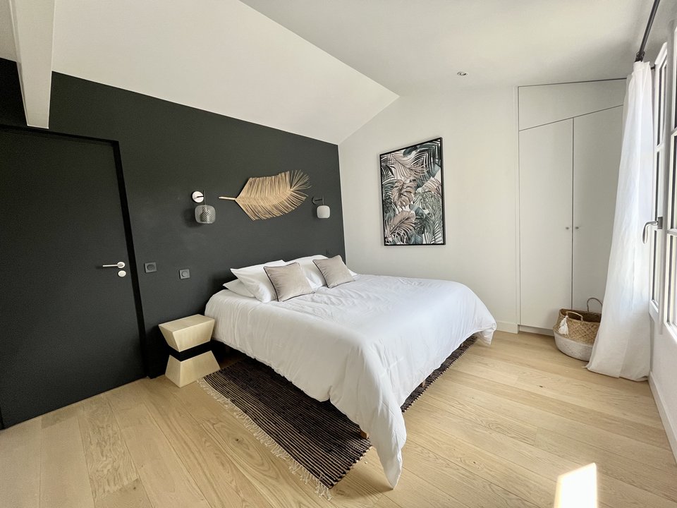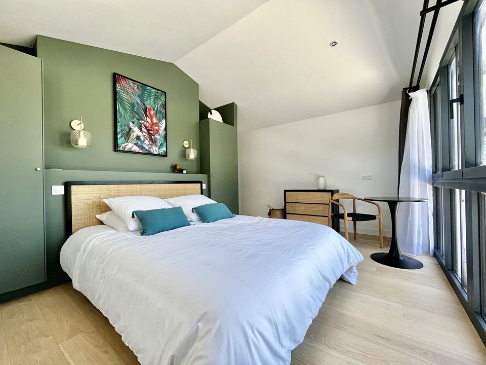 The master bedroom of 17.5m² has a shower room and toilet. It offers a view of the swimming pool with its large bay window. The second suite has a bathroom and an office fitted out for telecommuting (fiber access).