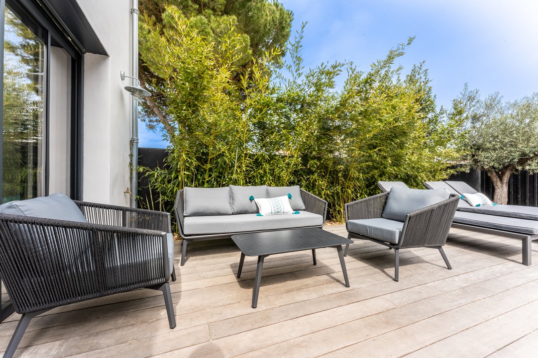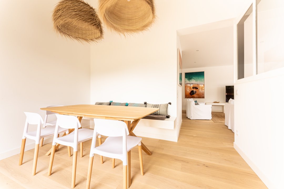 The room is open to the terrace and the swimming pool. The dining room has a small wooden terrace equipped with a plancha.