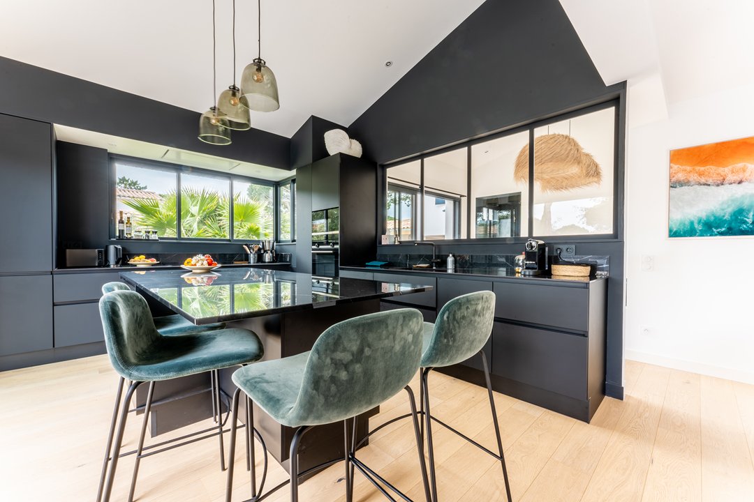 It consists on the ground floor of a large living room of 62m² composed of a living room, a dining room and a kitchen equipped with a central island.