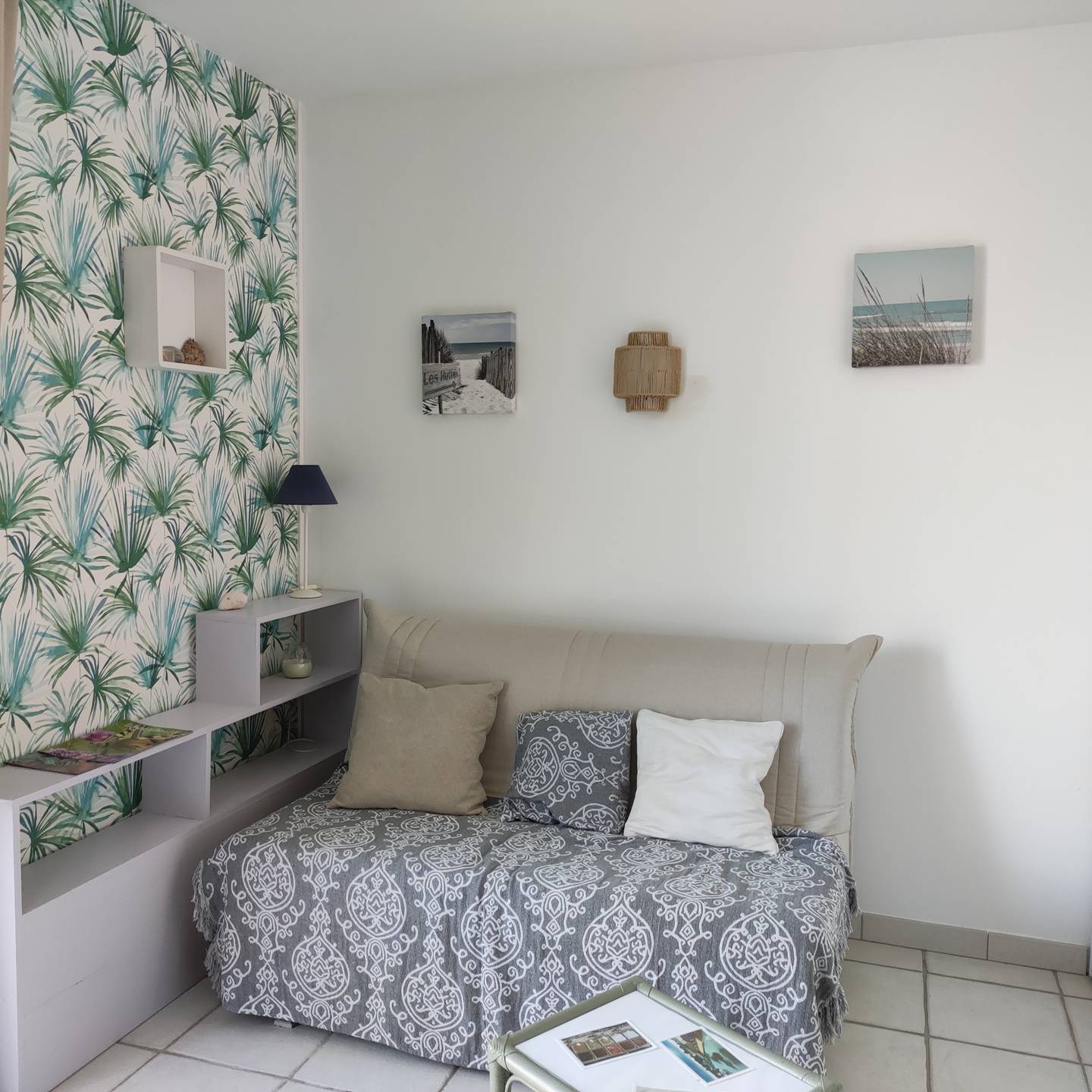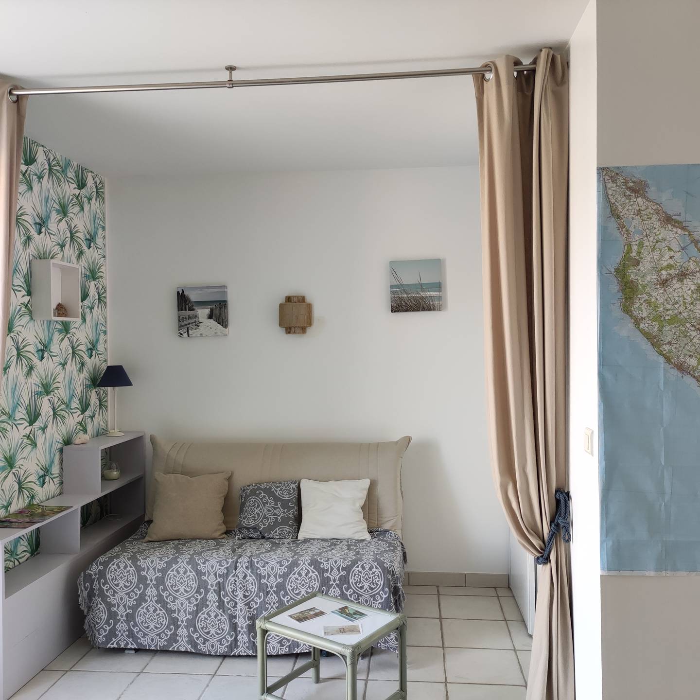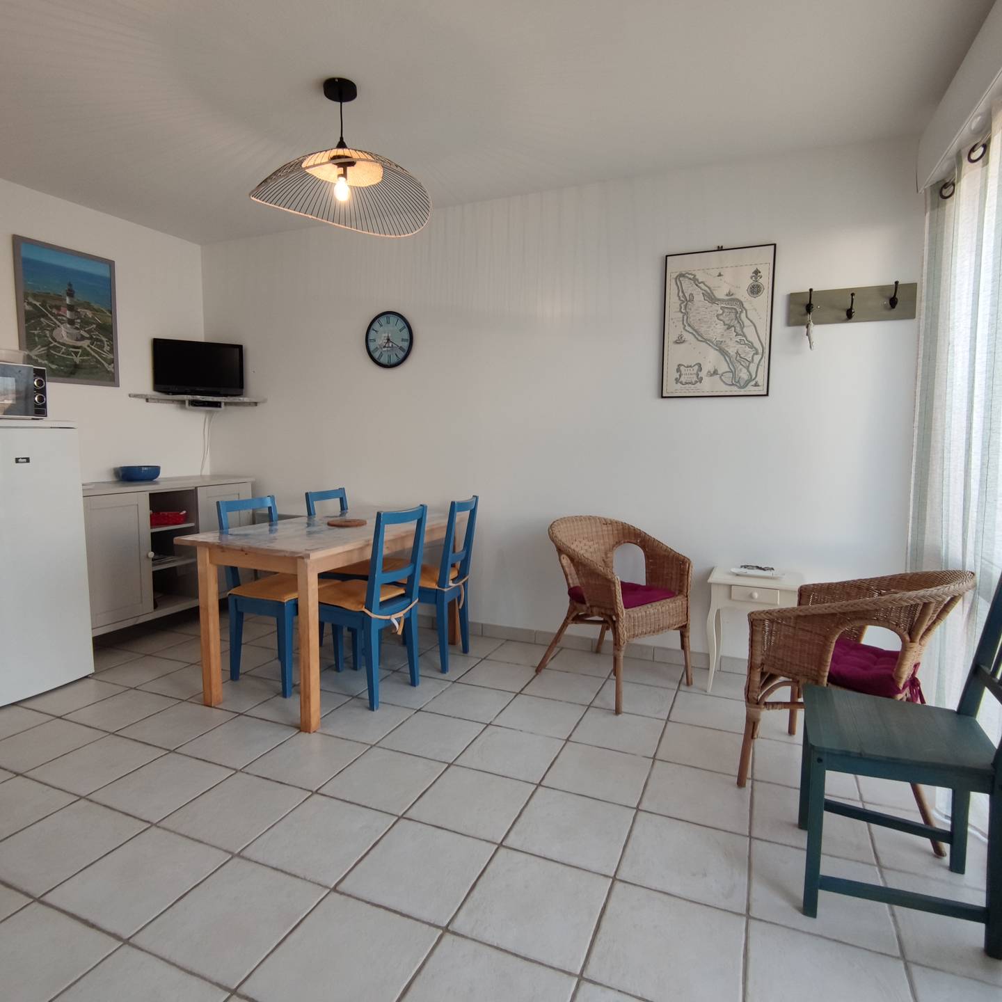 Saint Georges d'Oleron - Chéray 2-room apartment - approximately 30 m² - up to 4 people Apartment in a quiet residence with communal swimming pool (open between mid-June and mid-September) consisting of a living room with sofa bed for two beds (140), television, fitted kitchen with two induction hobs, fridge/freezer, washing machine, dishwasher, mini oven, microwave, one bedroom for two beds (bed 140) with cupboard/wardrobe, a bathroom with shower, towel dryer, wc. Outside, a courtyard enclosed by walls with garden furniture, parasol, sun loungers, barbecue. The advantage of this rental by the sea: Quiet apartment, a few meters from the market and shops. Swimming pool in the residence. Cleaning with disinfection included.