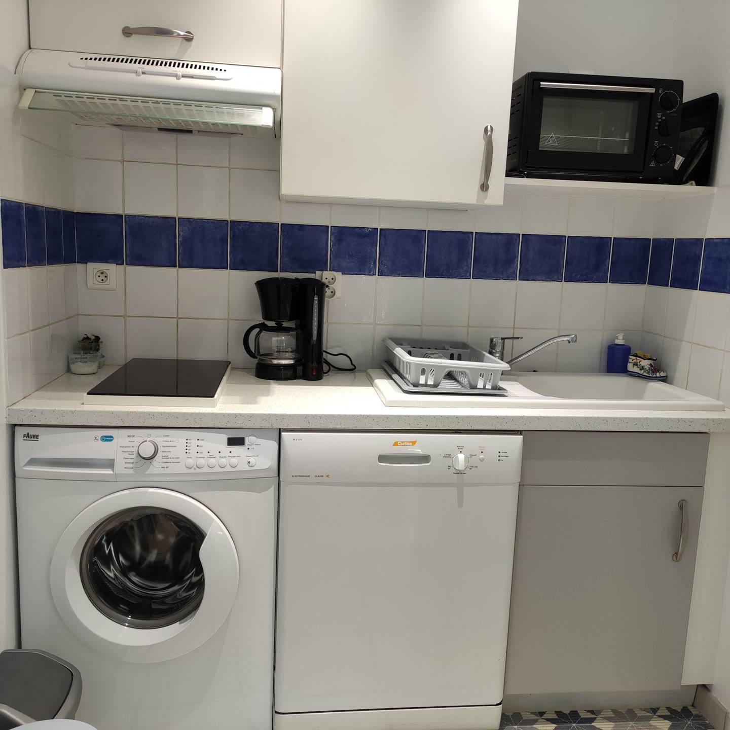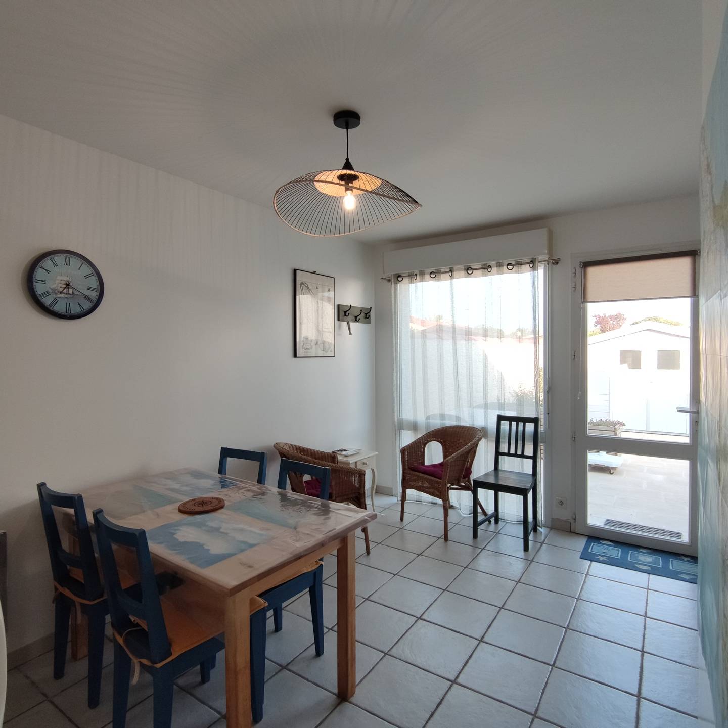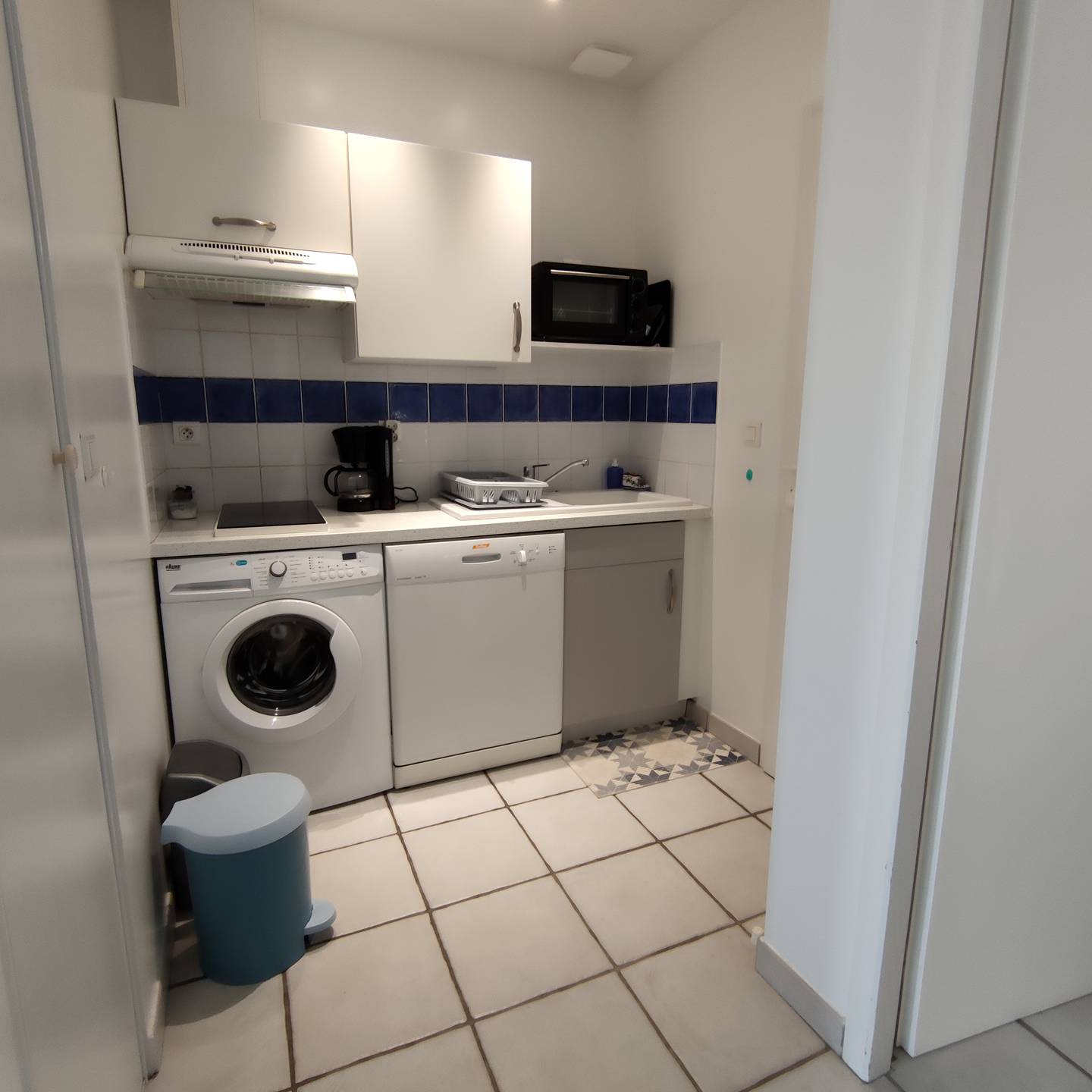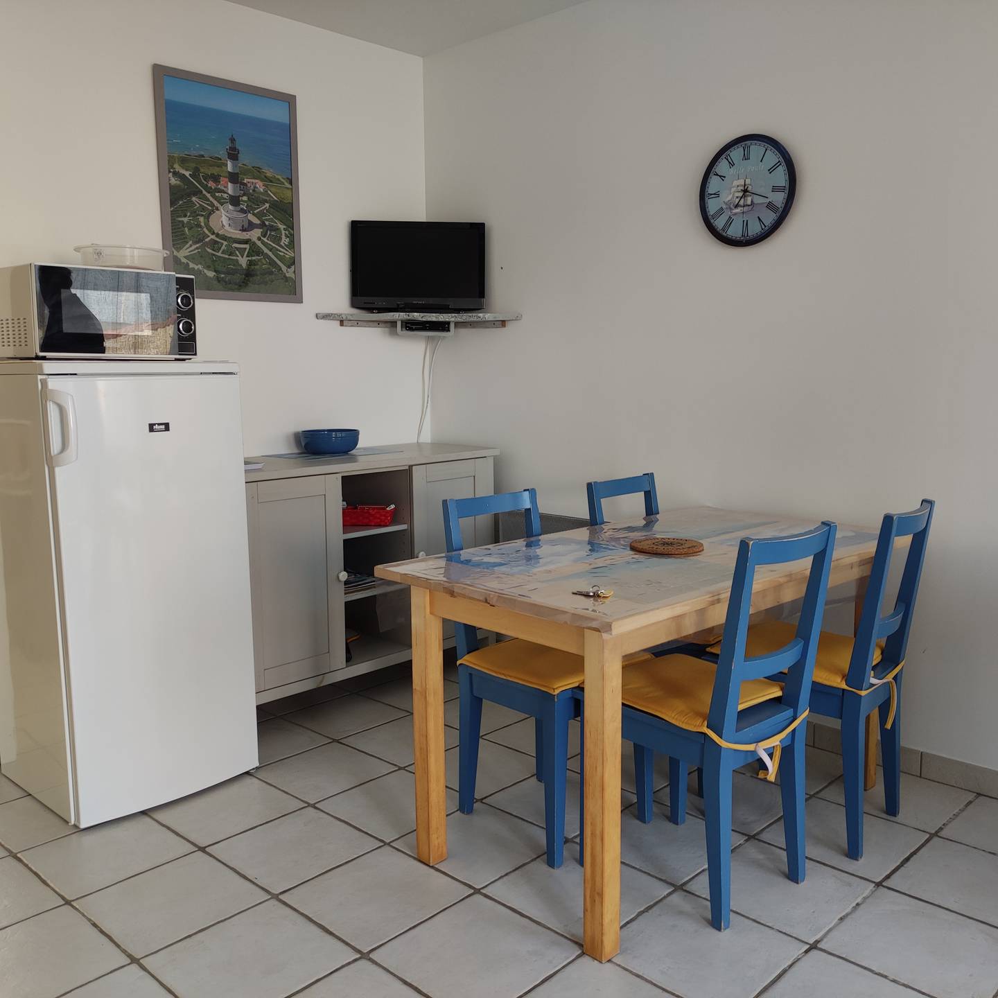 Saint Georges d'Oleron - Chéray 2-room apartment - approximately 30 m² - up to 4 people Apartment in a quiet residence with communal swimming pool (open between mid-June and mid-September) consisting of a living room with sofa bed for two beds (140), television, fitted kitchen with two induction hobs, fridge/freezer, washing machine, dishwasher, mini oven, microwave, one bedroom for two beds (bed 140) with cupboard/wardrobe, a bathroom with shower, towel dryer, wc. Outside, a courtyard enclosed by walls with garden furniture, parasol, sun loungers, barbecue. The advantage of this rental by the sea: Quiet apartment, a few meters from the market and shops. Swimming pool in the residence. Cleaning with disinfection included.