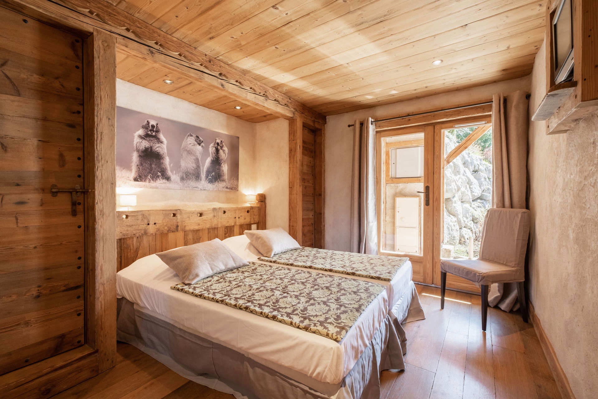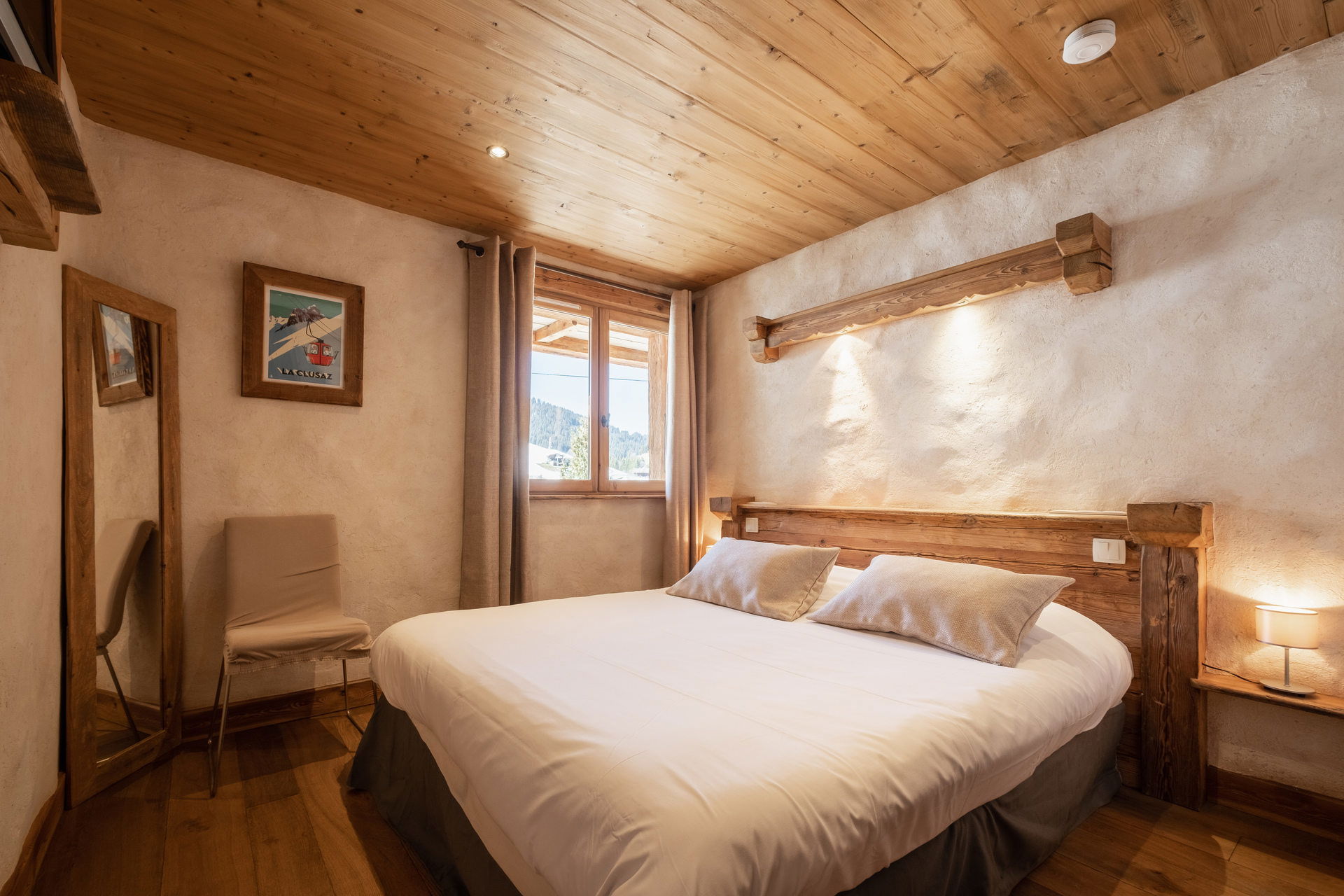 - BEDROOM (10.35 m²): 1 DOUBLE BED (160: 2x2 twin beds), small flat screen TV, south facing window, Pernat's way / next door chalets / moutains view, dressing room
