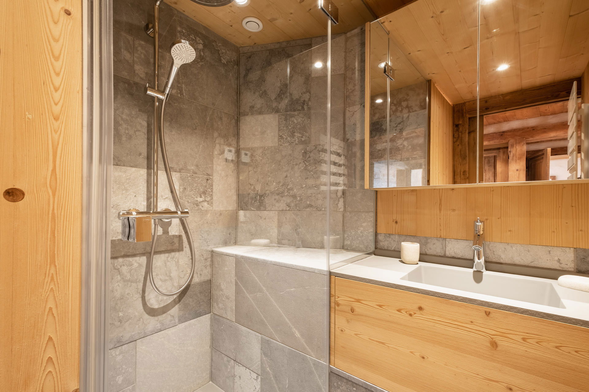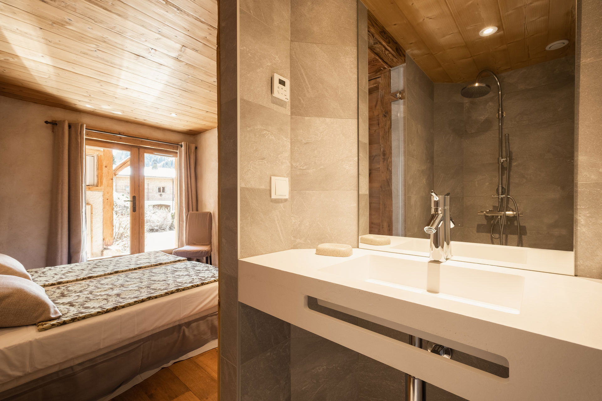 - BEDROOM (10.55 m²) : 1 DOUBLE BED (160 : 2x2 twin beds), small flat screen TV, access south-facing terrace by french-window (49 m²), next door chalets / moutains view, ajoining SHOWER ROOM (2.09 m²) : washbasin, shower, TOWELDRYER radiator