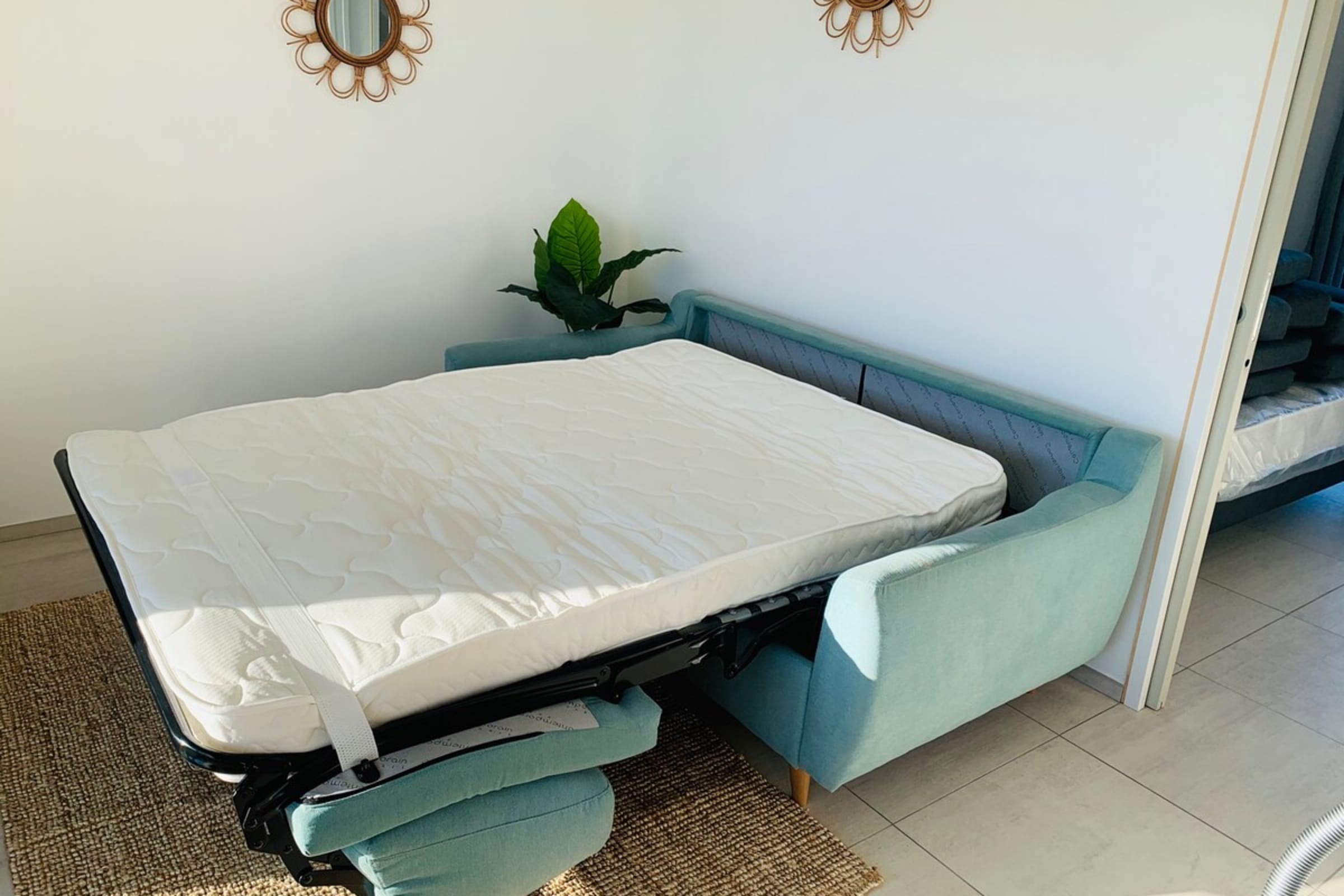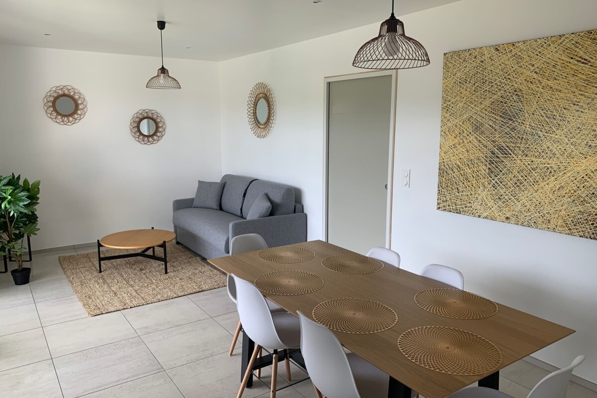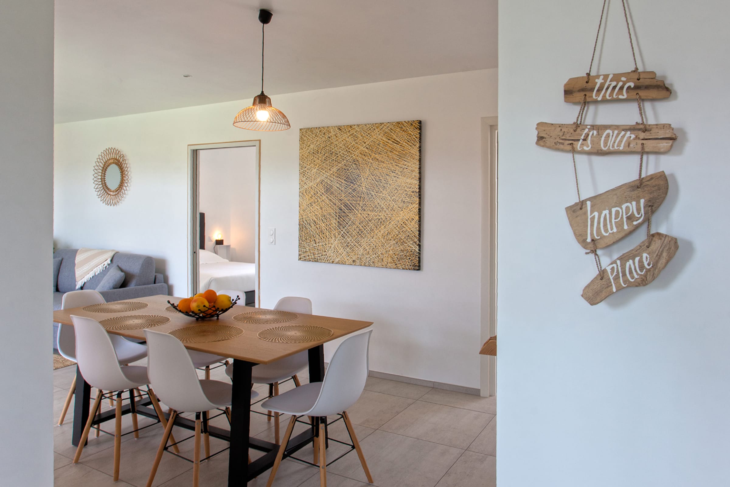 A living room with a convertible sofa, provided with a large bedside table of high comfort, Television, and dining table, opening onto a covered terrasse and little private garden.