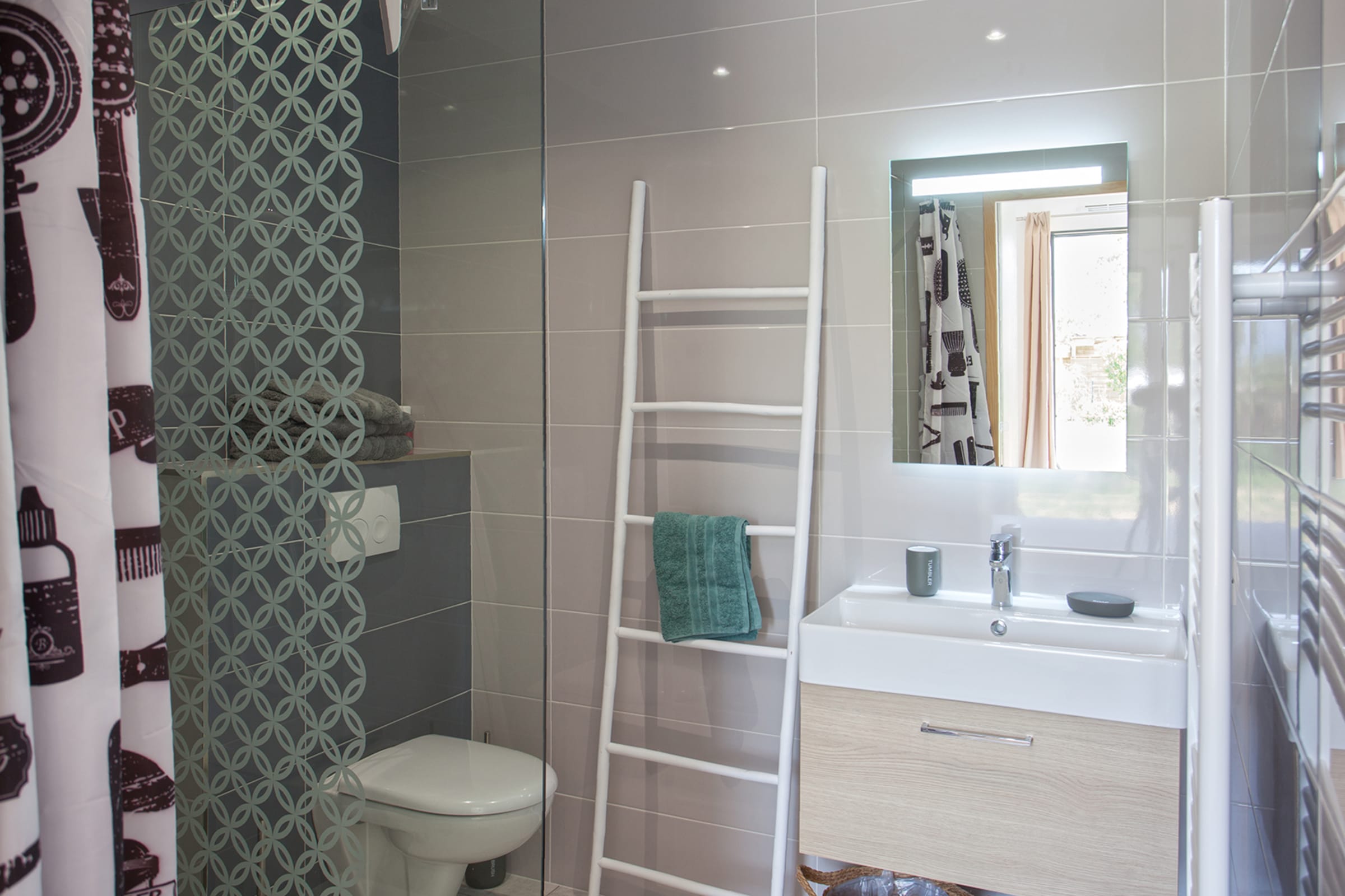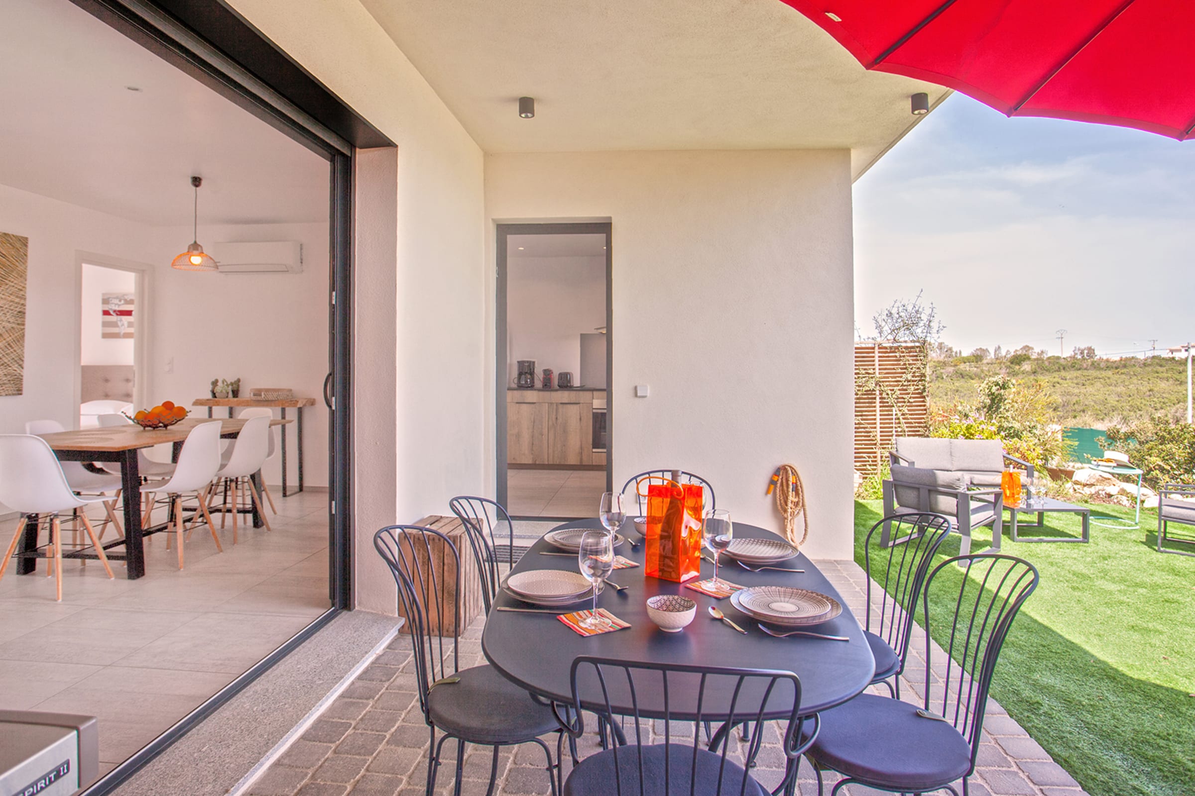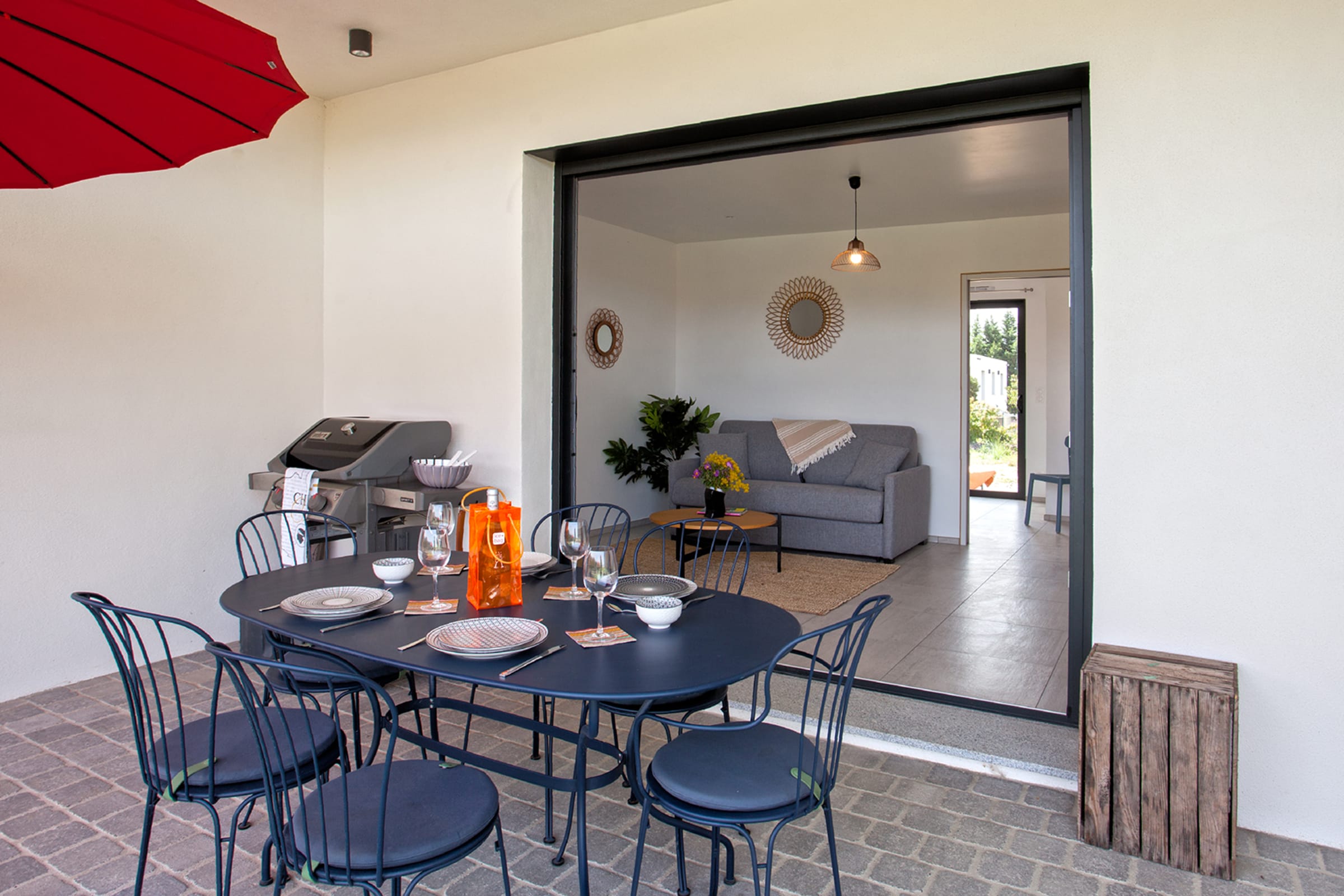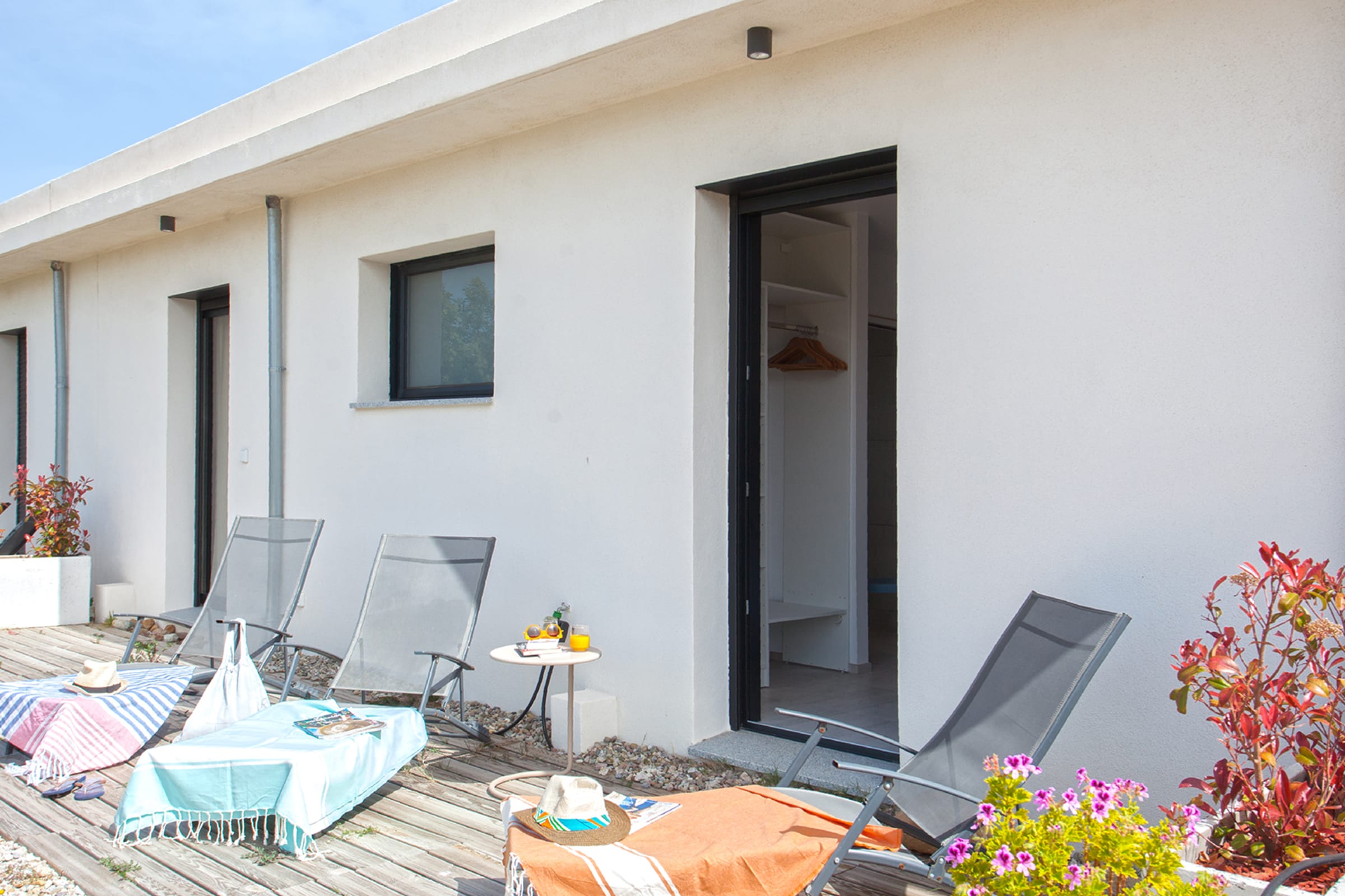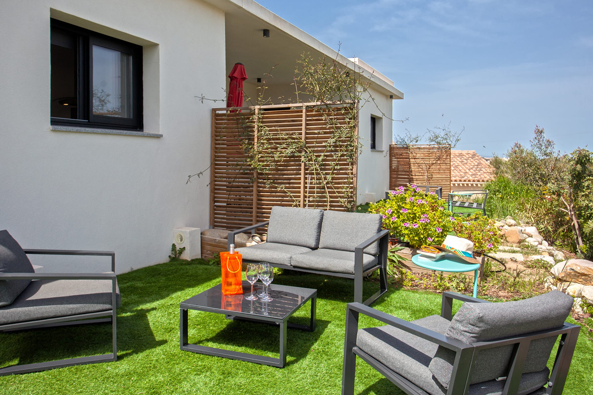 The terrace is equipped of a table for up to 6 people, a garden living room and sunbeams.
