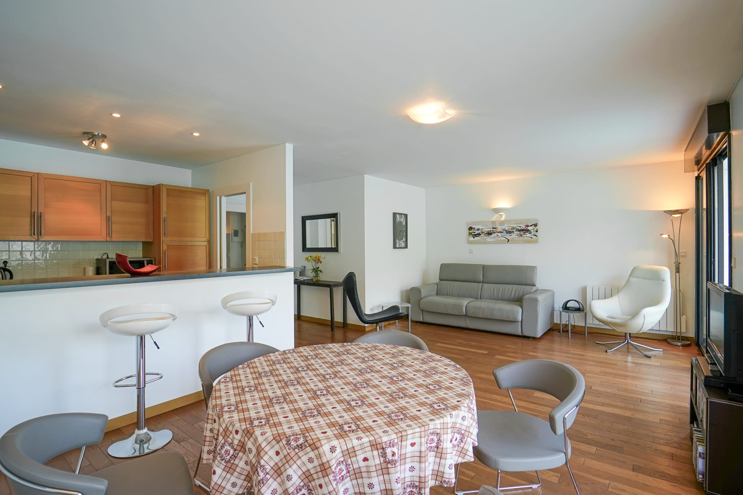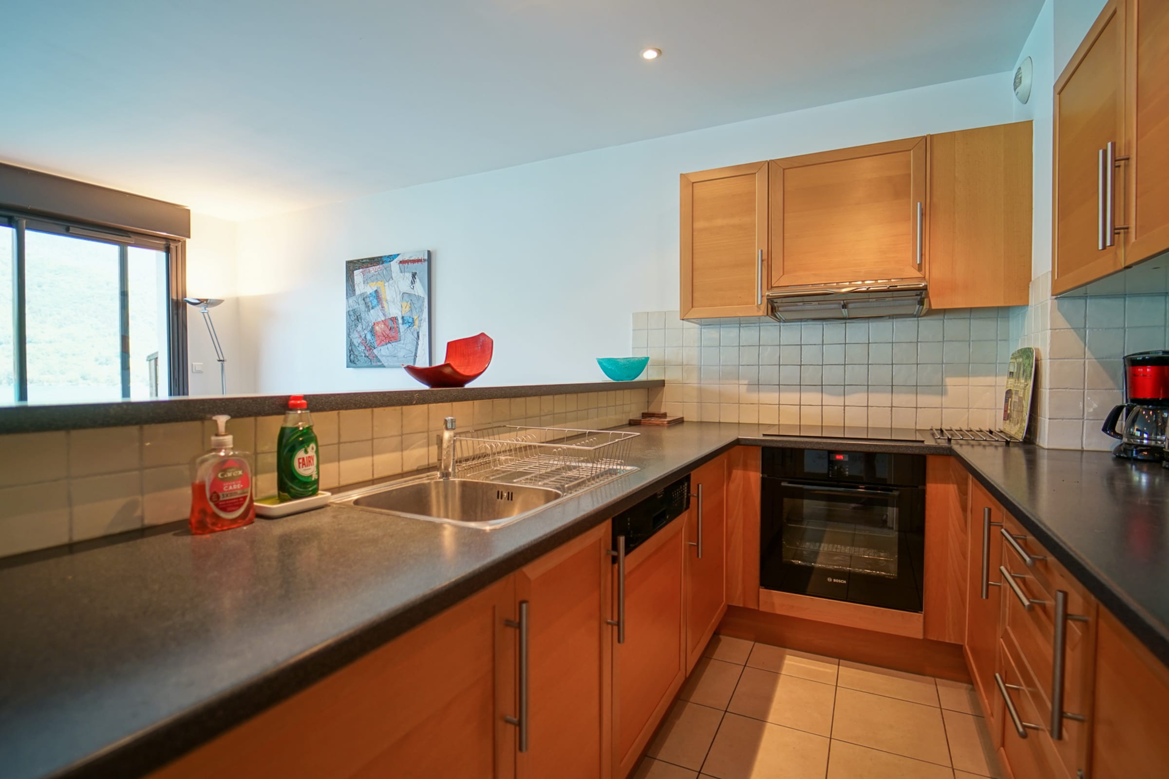 The apartment boasts a large living/dining room with exceptional views over Lake Annecy. The large glass doors from here open onto an east-facing balcony which is equipped with a bistro style table and chairs- perfect for al fresco dining. From the balcony, which stretches the length of the apartment, you can enjoy panoramic views of glittering lake Annecy, Duingt Chateau and mountains framed by Dent du Cruet (1833 m) and La Tournette (2351m).The living area is furnished with a three-seater sofa bed and two easy chairs. For entertainment there is a TV, iPod Dock, DVD player and a sn of DVDs for all ages. Backgammon, chess, dominos and other games are also available. Wireless internet access.