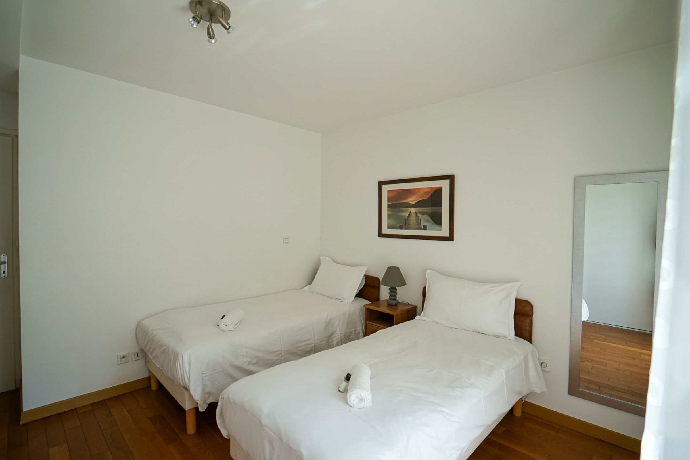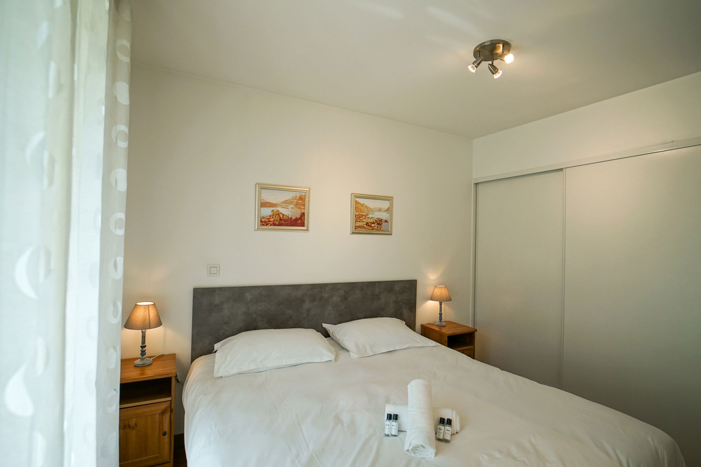 One of the bedrooms is equipped with a large double bed, the second bedroom has two single beds. Both bedrooms are well equipped with plenty of storage space in the form of both wardrobes and drawers. Both have access to a west-facing balcony with lovely views of mountains, the popular cycle route and lake Annecy.