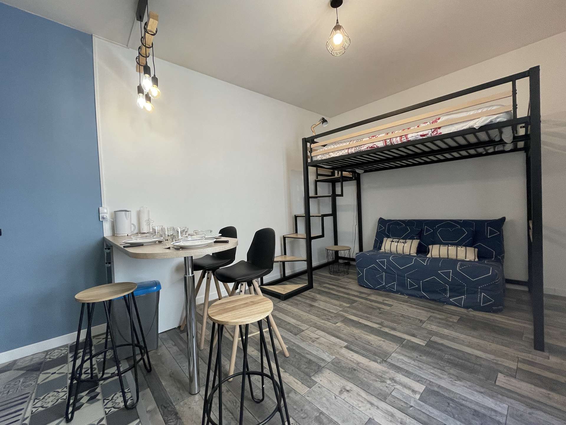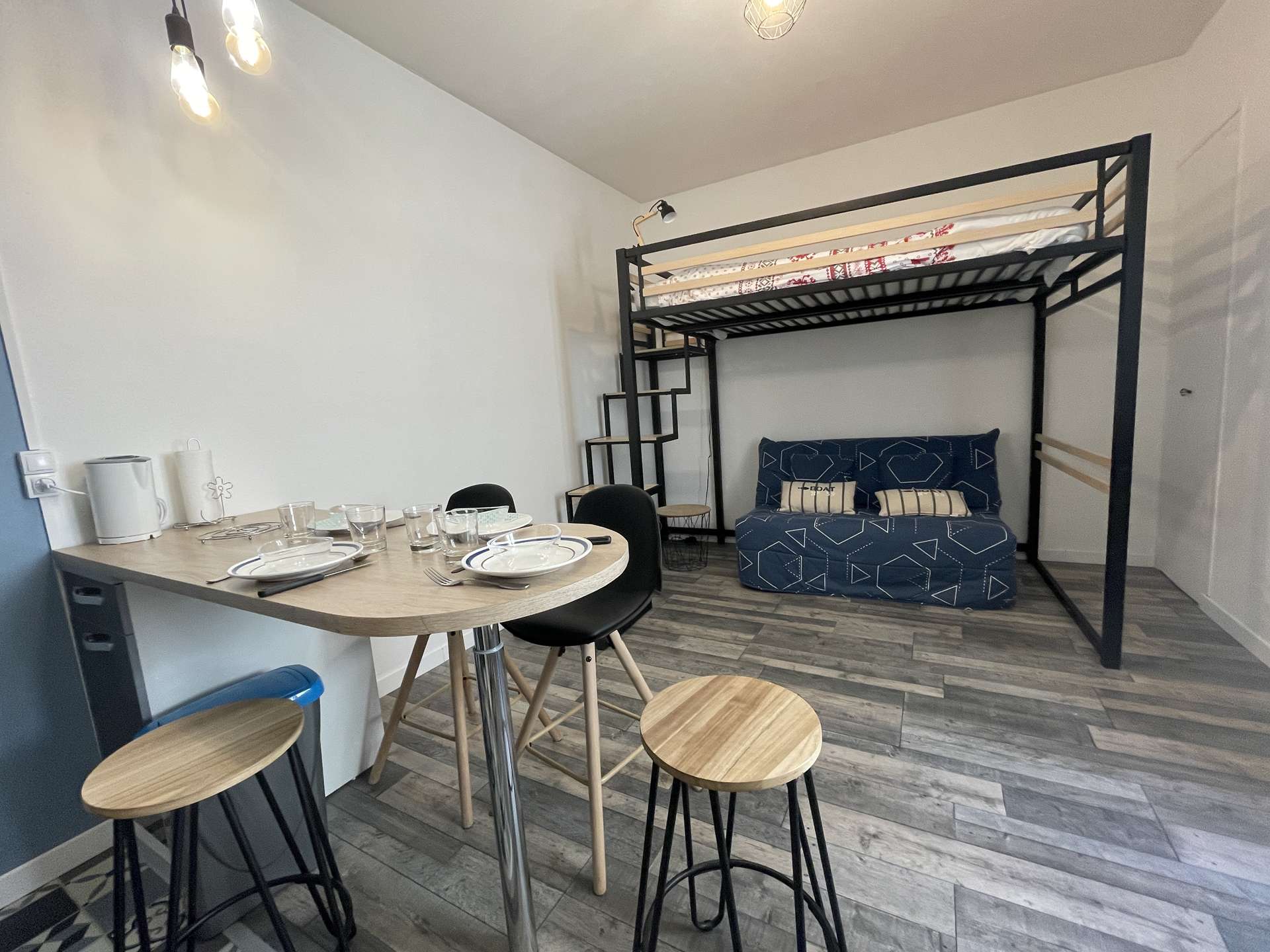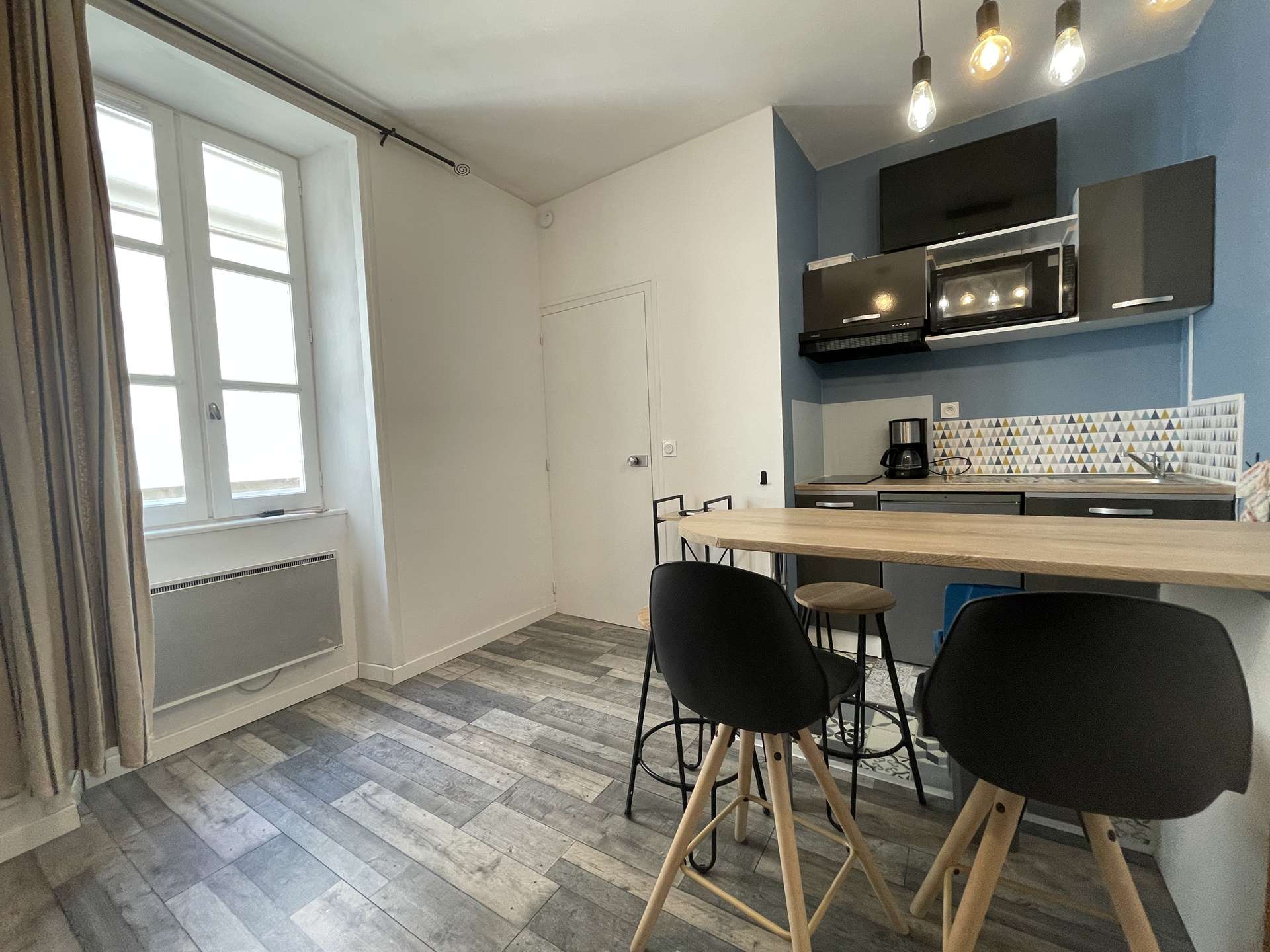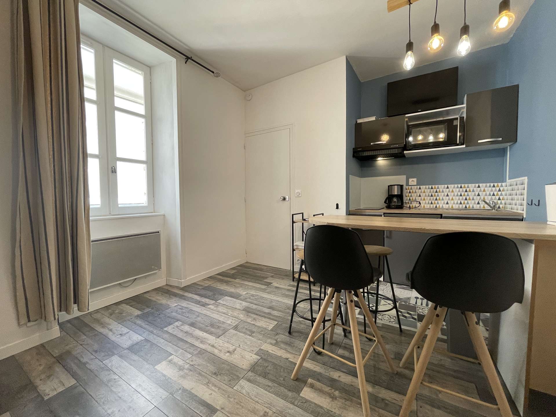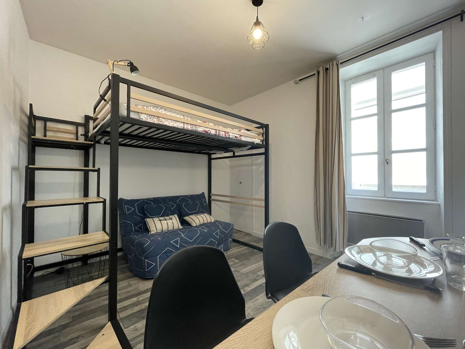La Rochelle (17) - City center - rue de la cloche 1 room apartment - approx. 25 m² - up to 3 people Holiday apartment located in a historic building close to the prefecture and the big clock tower. It is located in the heart of the city of La Rochelle, close to all amenities. Ideally located, this apartment will allow you to enjoy the city of La Rochelle in the best conditions. It is on the floor, consists of a living room with an equipped kitchen area, hotplates, microwave, kettle, filter coffee maker and everything necessary to cook in the best conditions. Also a sleeping area with a 140cm loft bed for 2 people, below a 130cm sofa bed for 1 person. A very modern bathroom with shower and basin and a separate WC. Downstairs, in the courtyard of the building, a bicycle rack for those who wish. The advantages of this rental by the sea: Close to the market halls, old port, in the heart of the city center, close to shops and easy access to public transport. Cleaning with disinfection included.