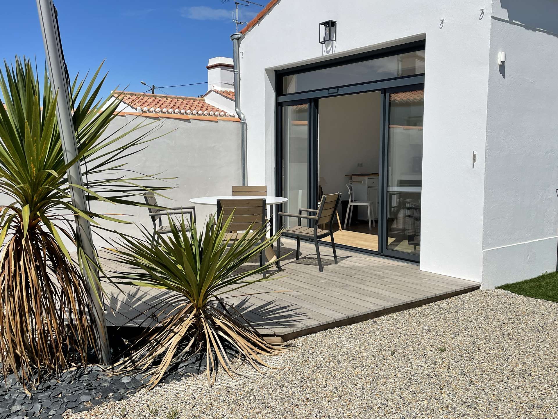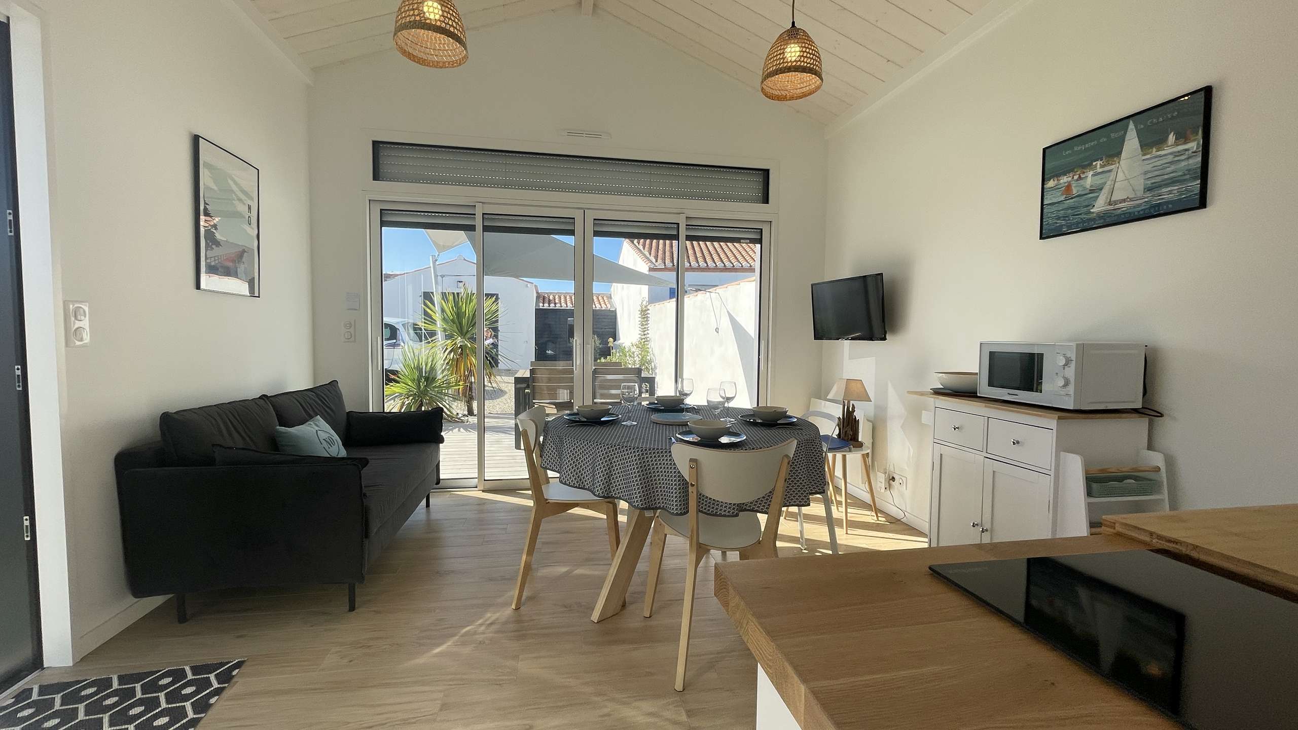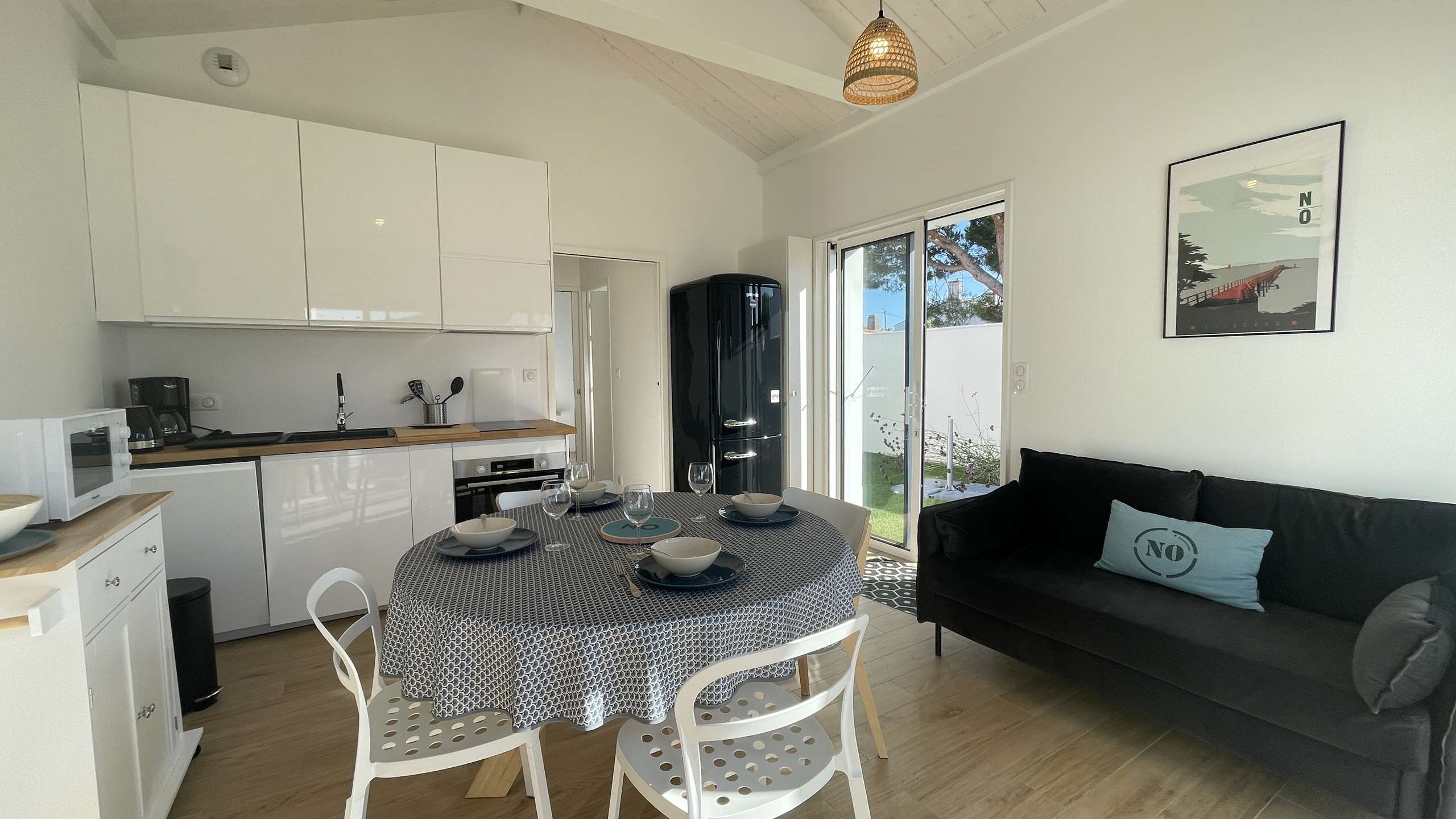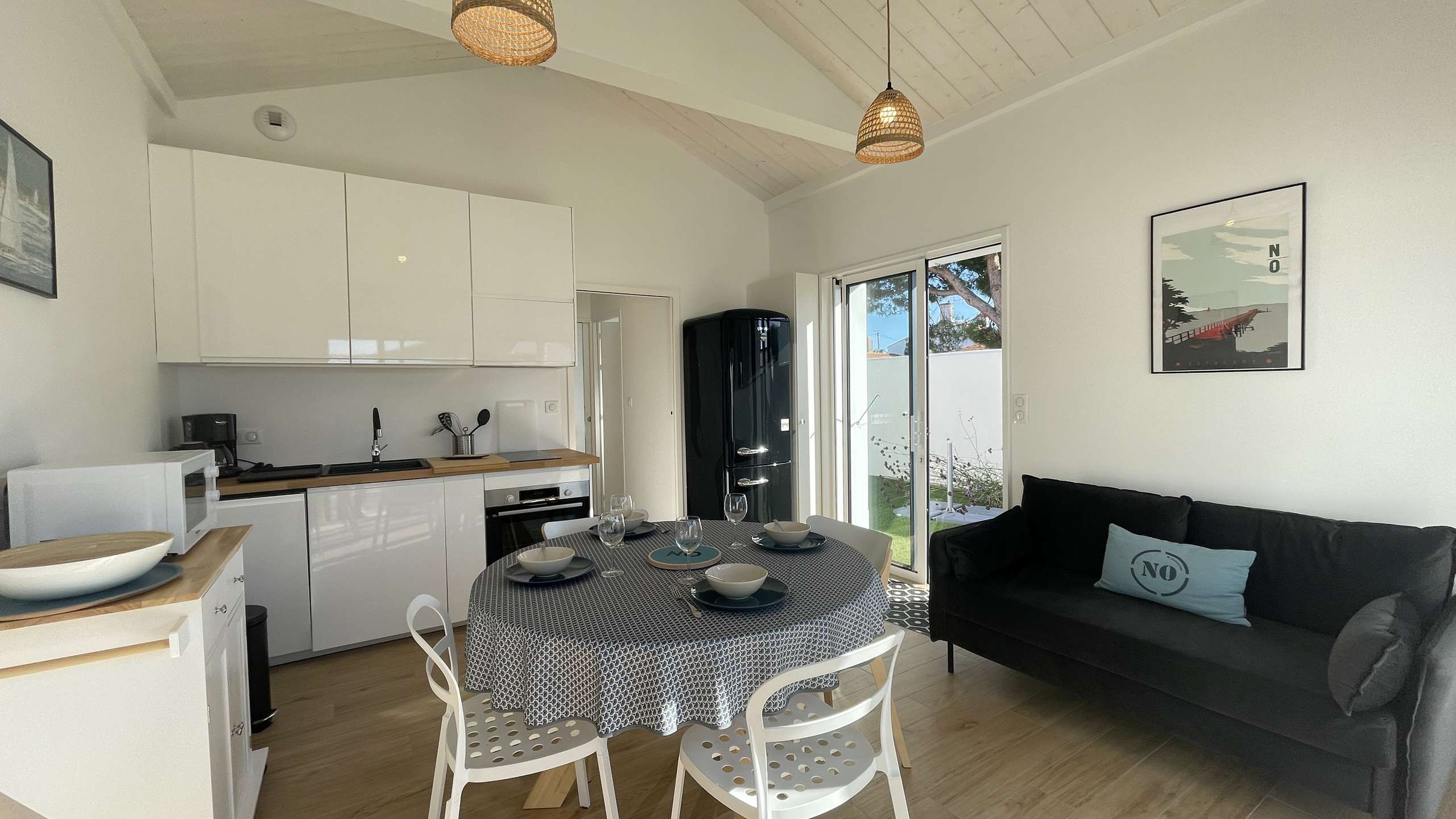 Noirmoutier en l'Ile (85) - Neighborhood near the city center 2-room house approx. 40 m² - up to 4 people maximum. Located 700 m from the shops and 1500 m from the beach of La Claire, this new house on one level consists of a pretty bright and bright living room opening onto a beautiful wooden terrace. A fully equipped kitchen area and a lounge area with a convertible sofa. A bedroom with a 140 cm bed and large cupboards, a bathroom with walk-in shower and separate wc. Parking is in the rental (possibility of entering 2 cars) with closure by secure gate. More of this house by the sea: You benefit from a terrace equipped with garden furniture and shade sails and a green space with deckchairs. You benefit from the proximity of shops, cinema, and summer entertainment. Cleaning with disinfection included.