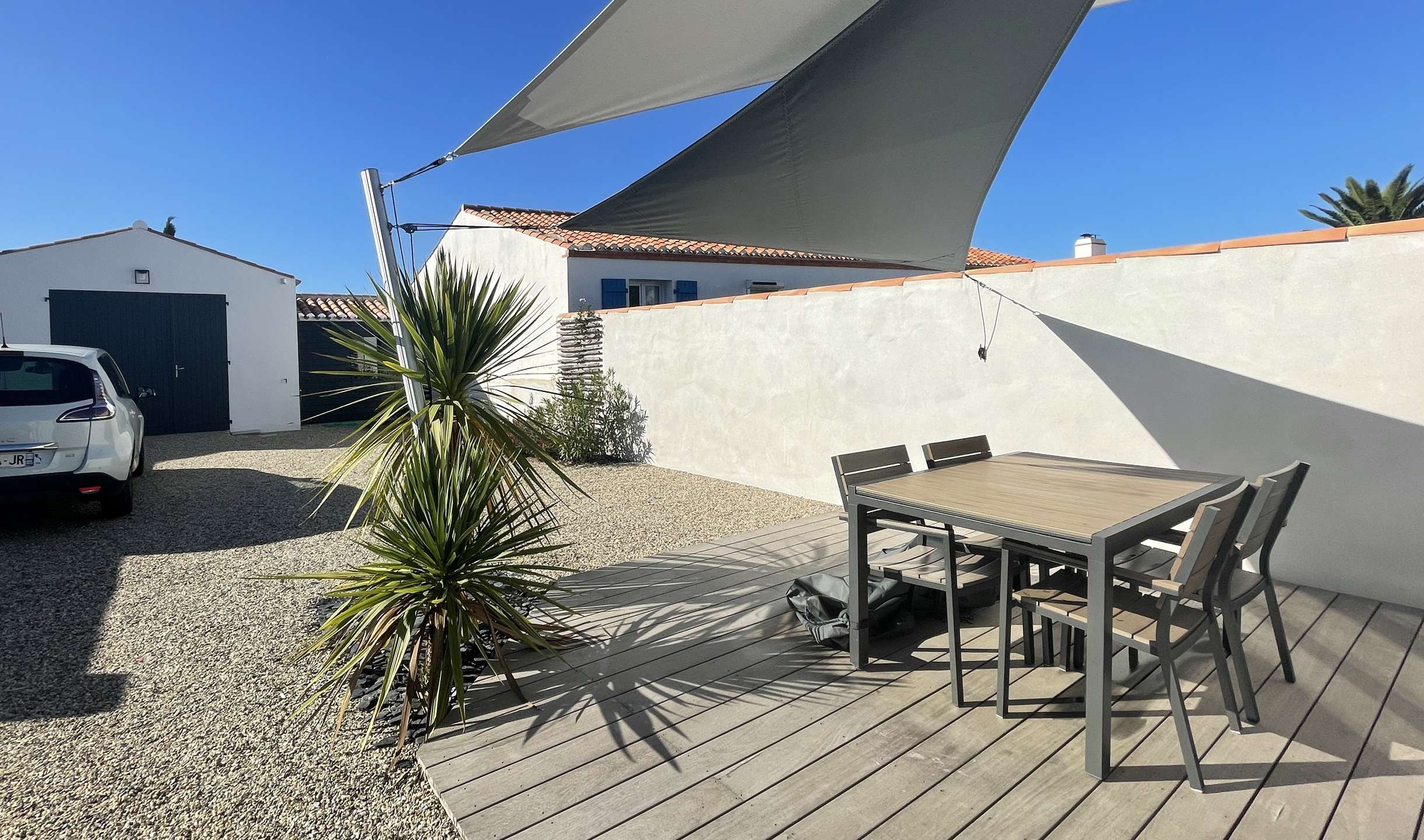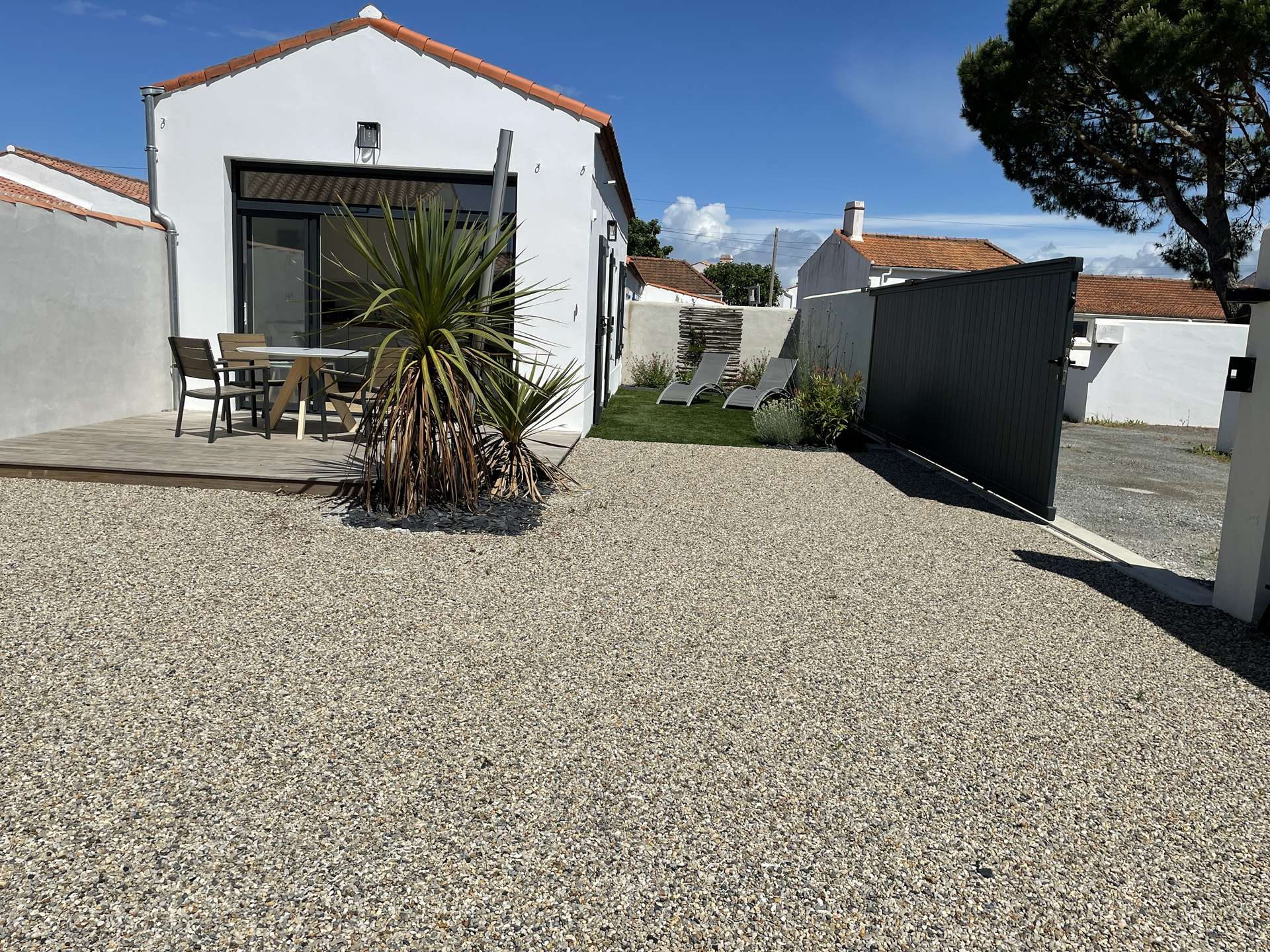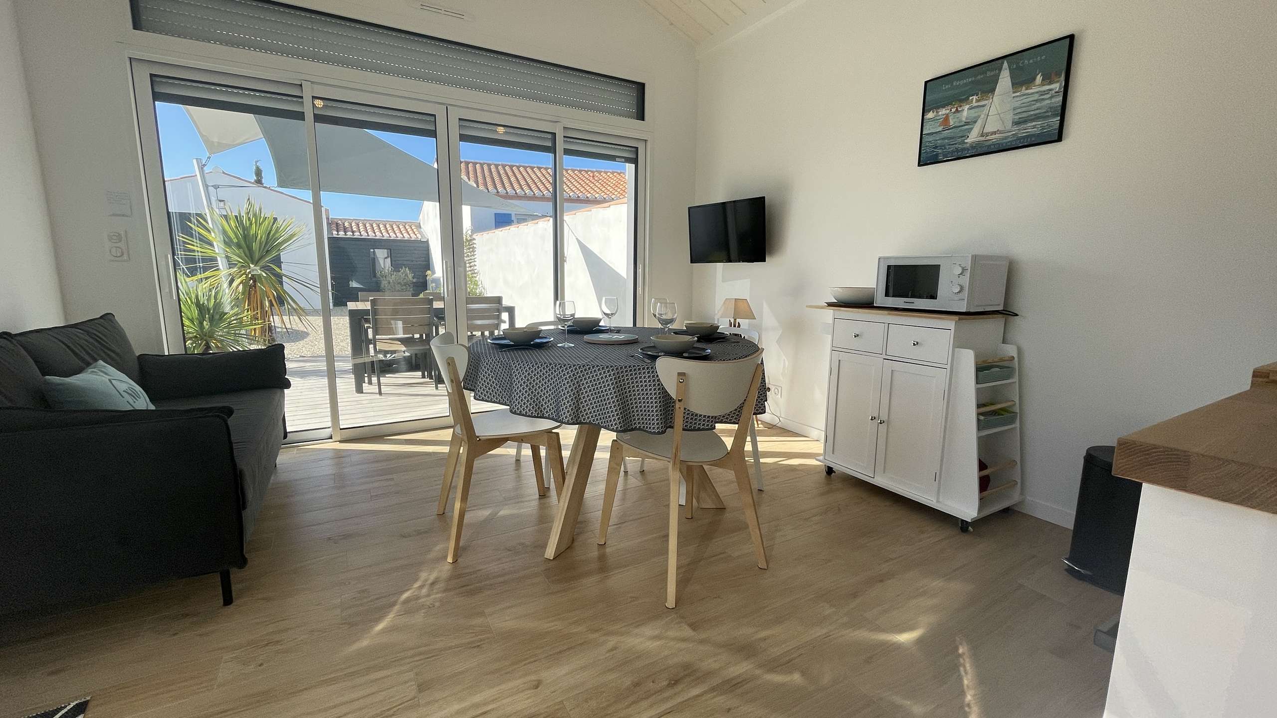 Noirmoutier en l'Ile (85) - Neighborhood near the city center 2-room house approx. 40 m² - up to 4 people maximum. Located 700 m from the shops and 1500 m from the beach of La Claire, this new house on one level consists of a pretty bright and bright living room opening onto a beautiful wooden terrace. A fully equipped kitchen area and a lounge area with a convertible sofa. A bedroom with a 140 cm bed and large cupboards, a bathroom with walk-in shower and separate wc. Parking is in the rental (possibility of entering 2 cars) with closure by secure gate. More of this house by the sea: You benefit from a terrace equipped with garden furniture and shade sails and a green space with deckchairs. You benefit from the proximity of shops, cinema, and summer entertainment. Cleaning with disinfection included.