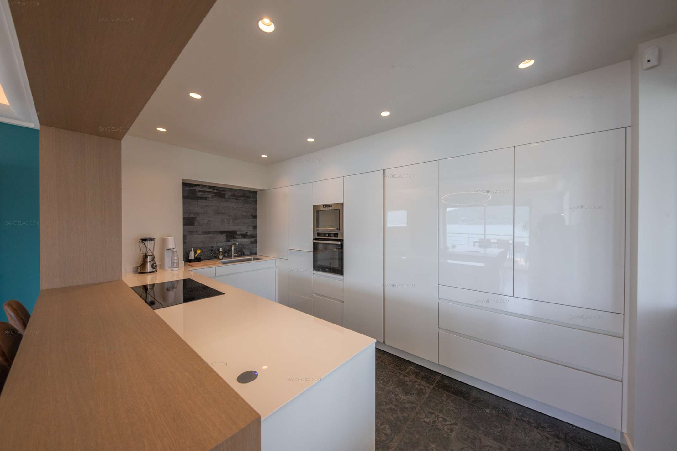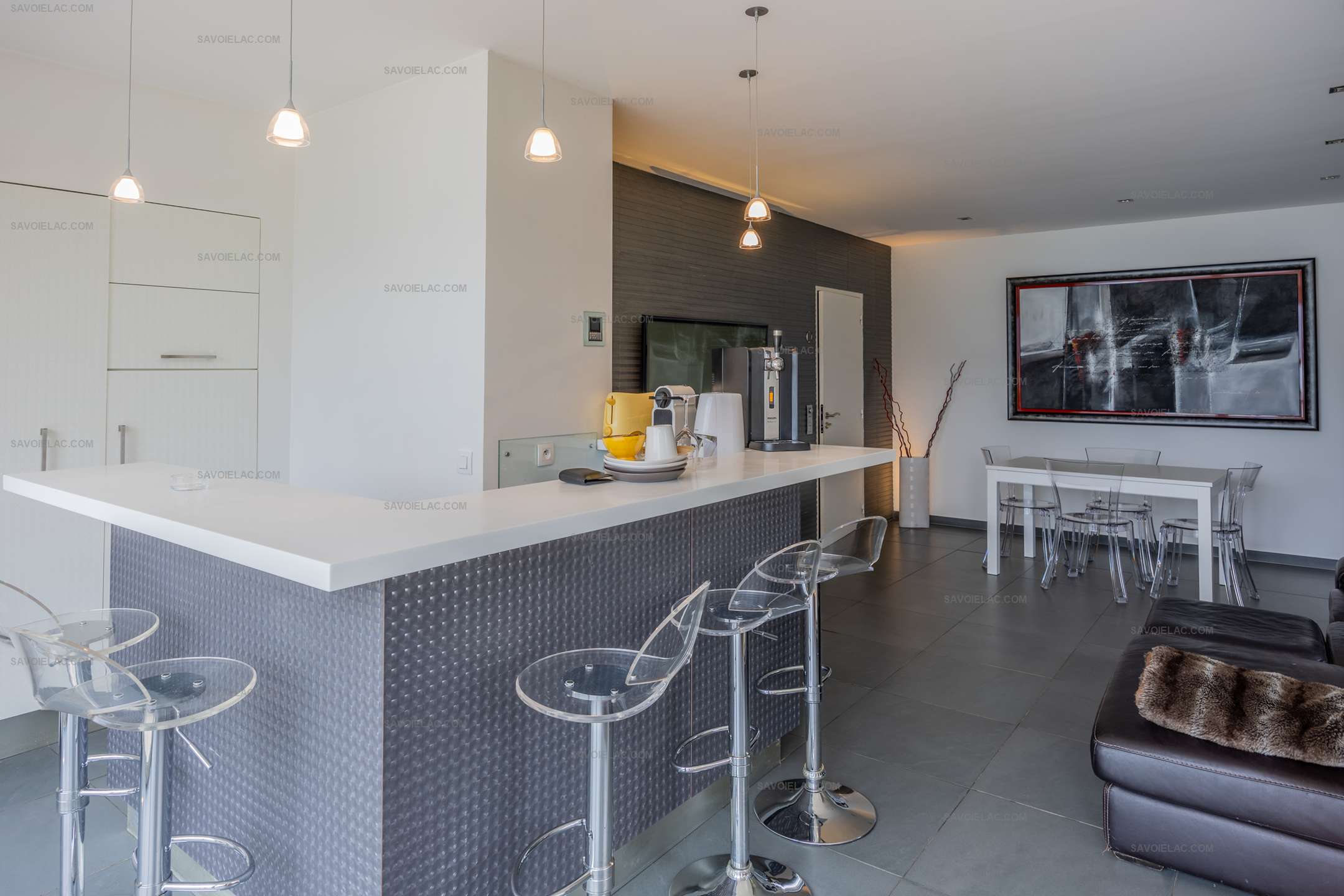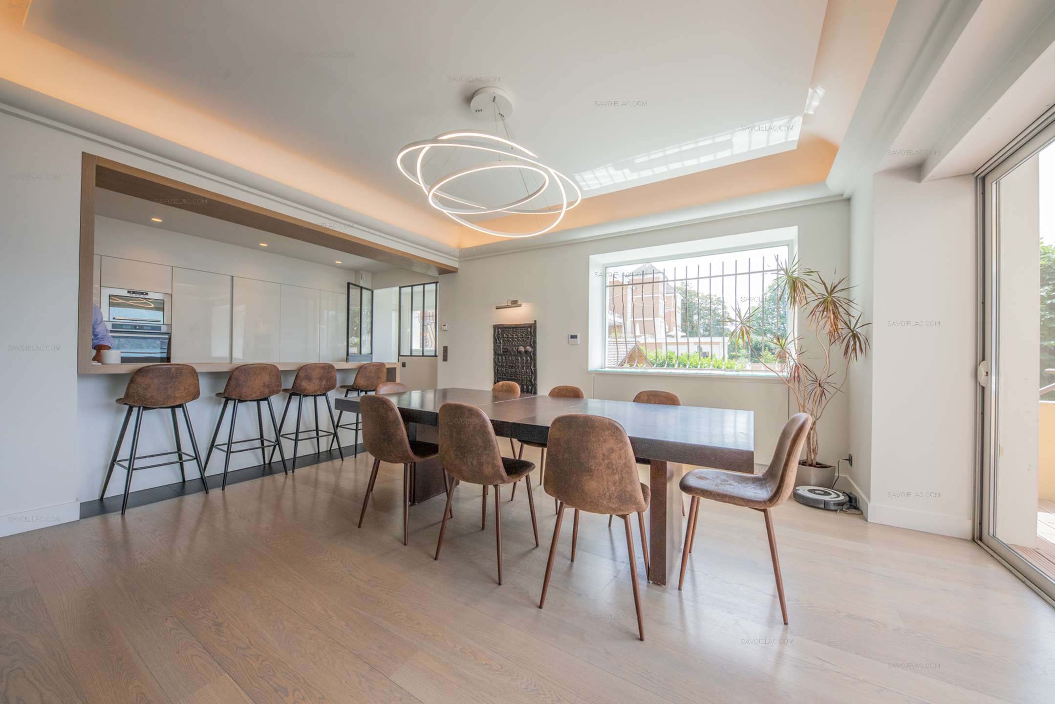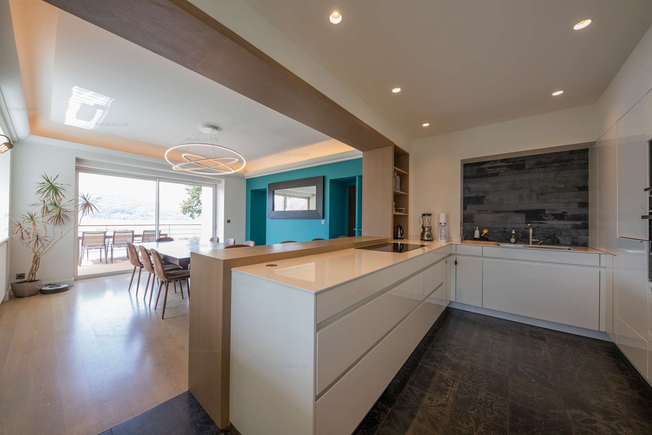 Dining room opening onto a terrace with dining table and panoramic views of the lake and mountains. Open fitted kitchen with bar, pantry with and laundry room opening onto the garage