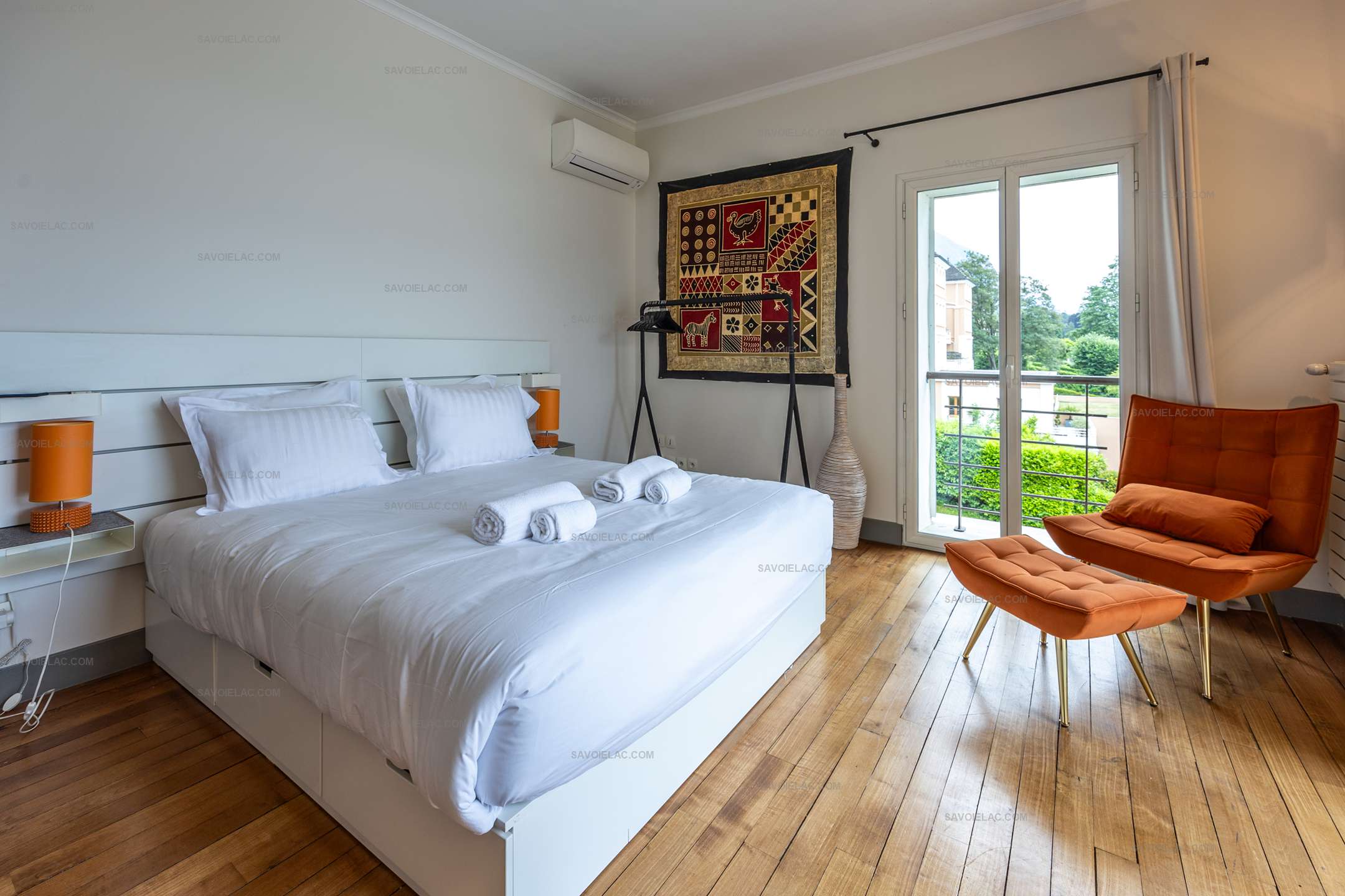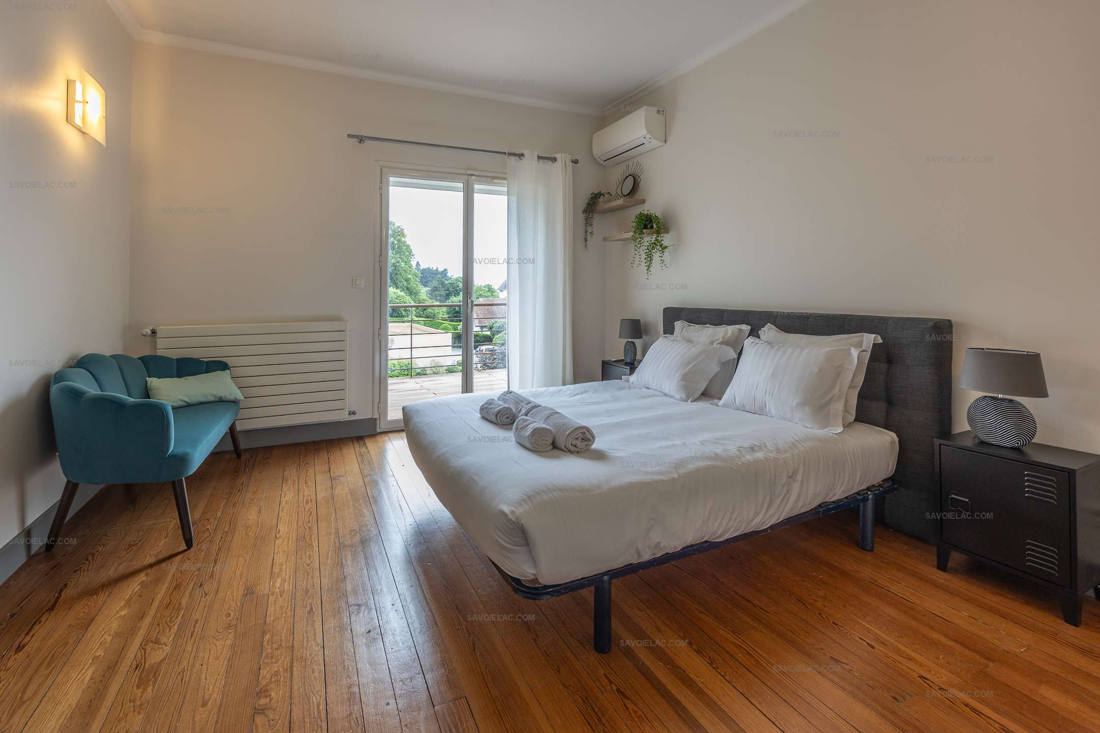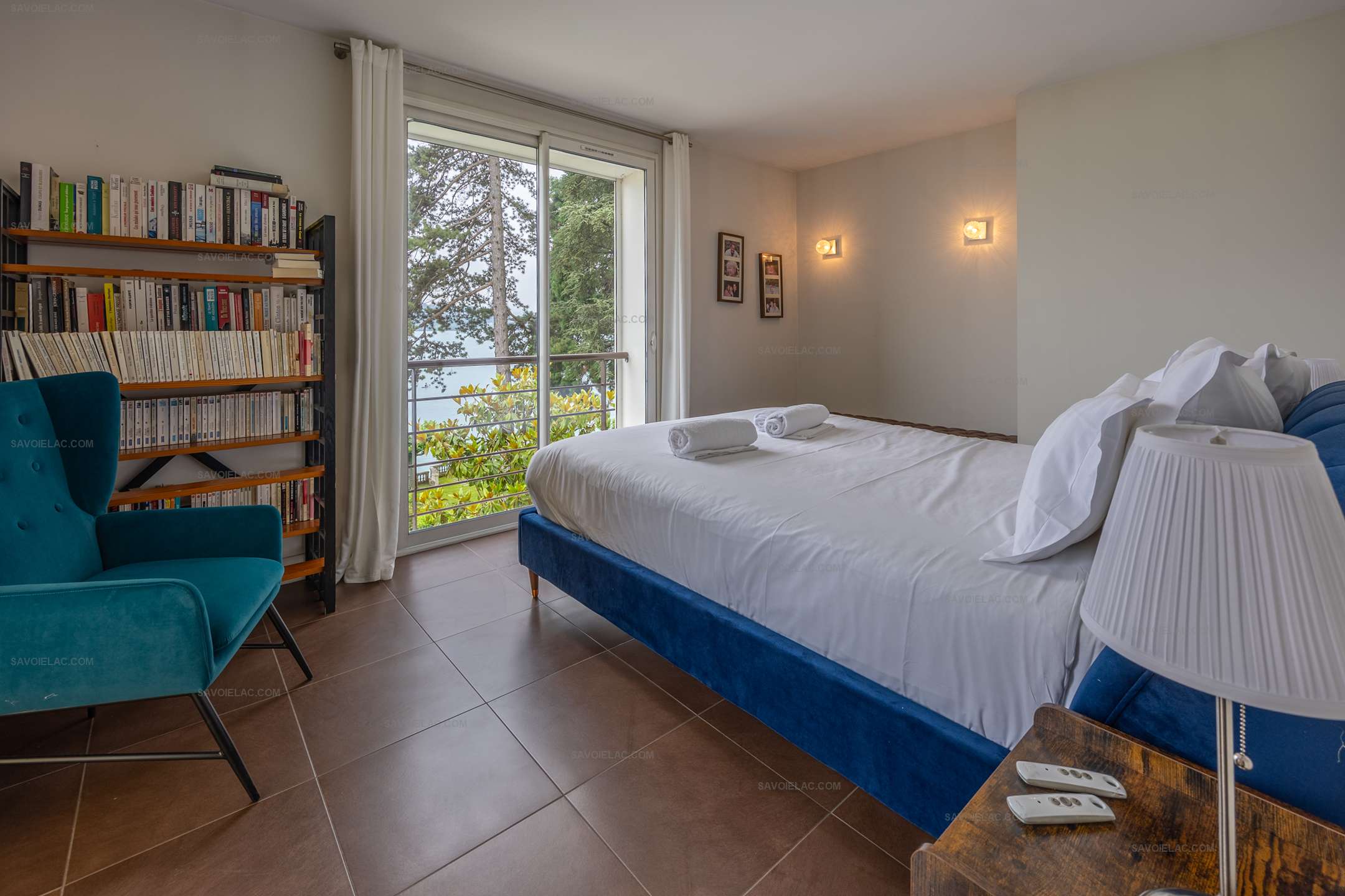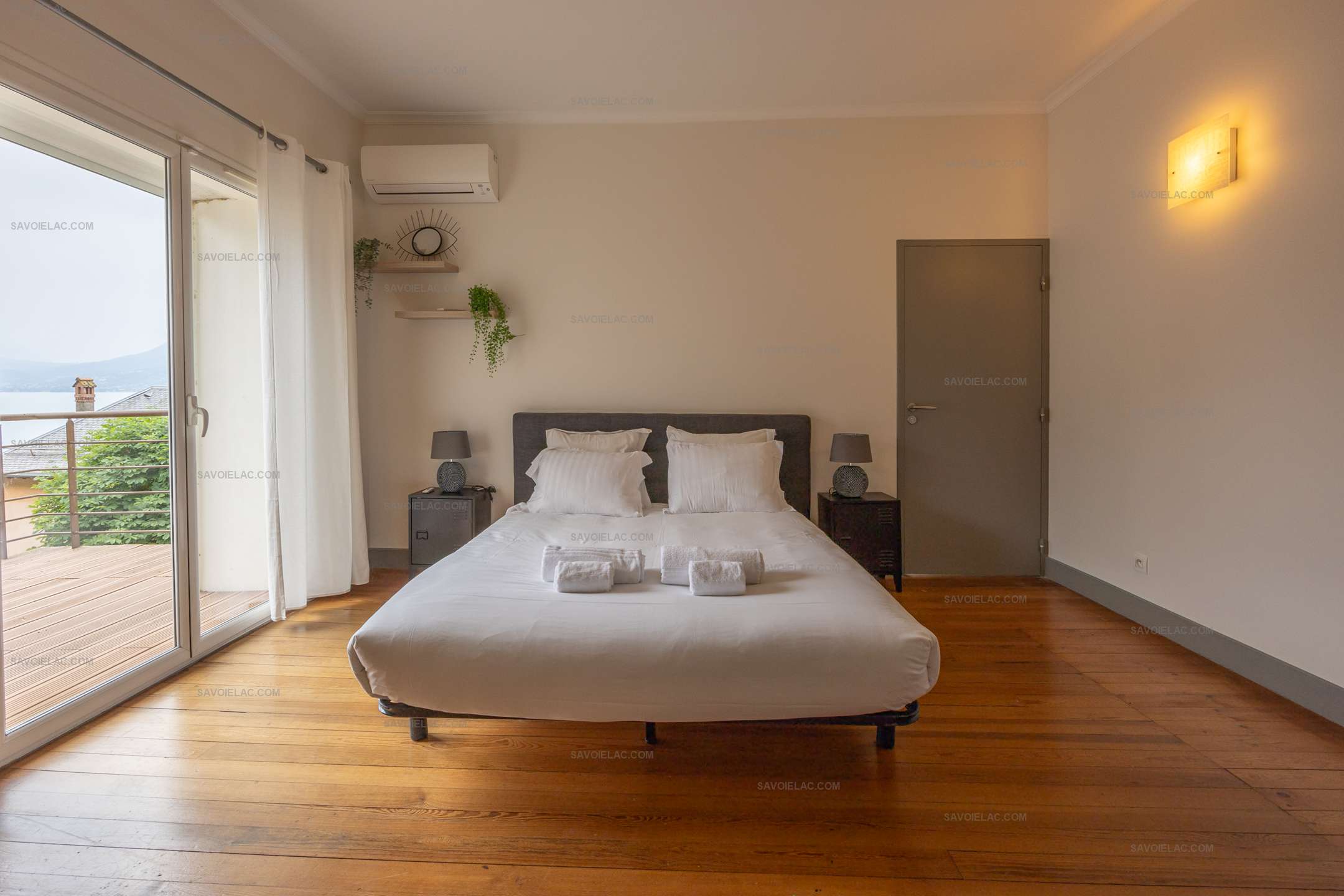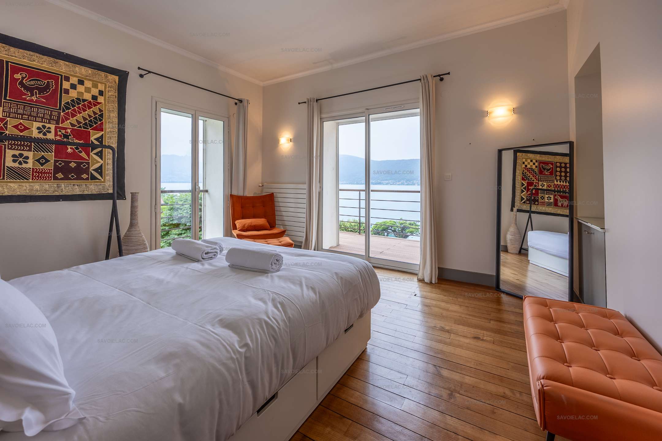 Bedroom 2: double bed 160 x 200 with balcony overlooking the lake and the mountains