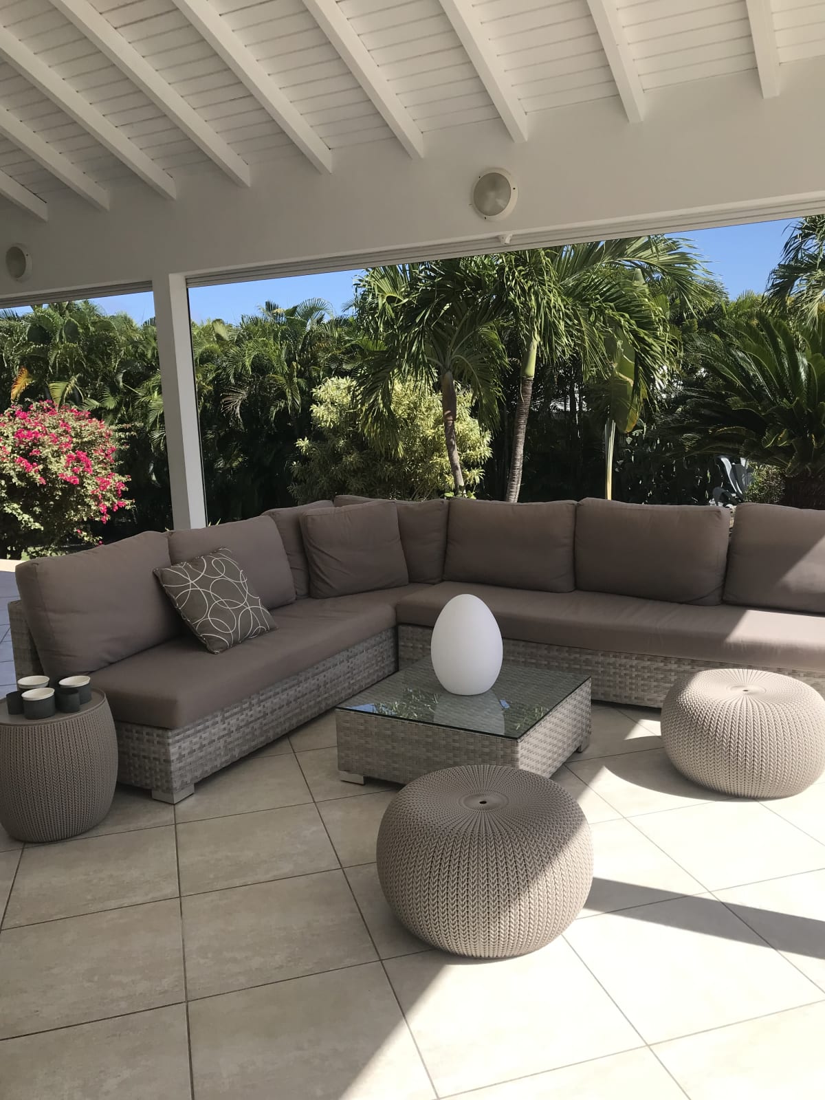 Spacious and beautiful outdoor spaces. Terraces, outdoor kitchen, pool, everything here invites you to live and bask in the sun and shade facing the beautiful tropical park.