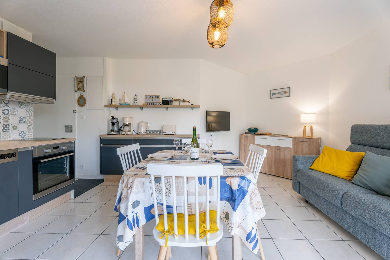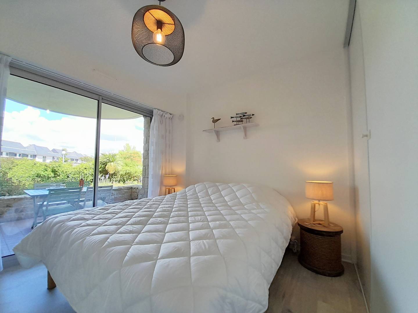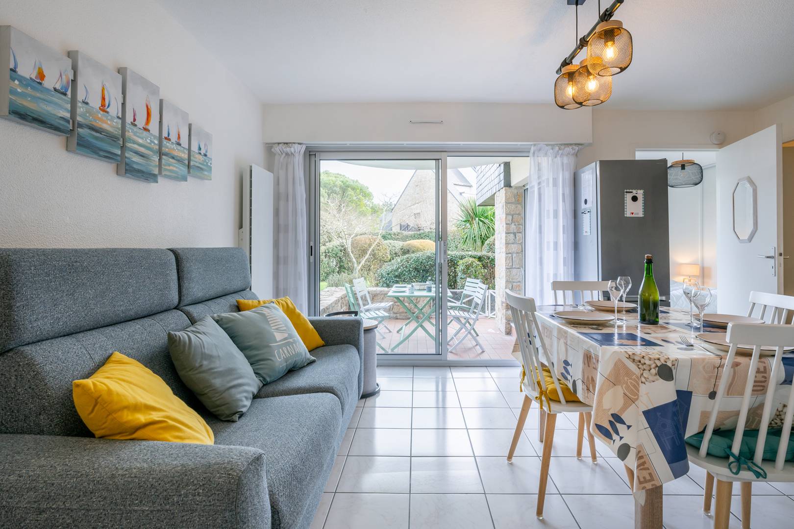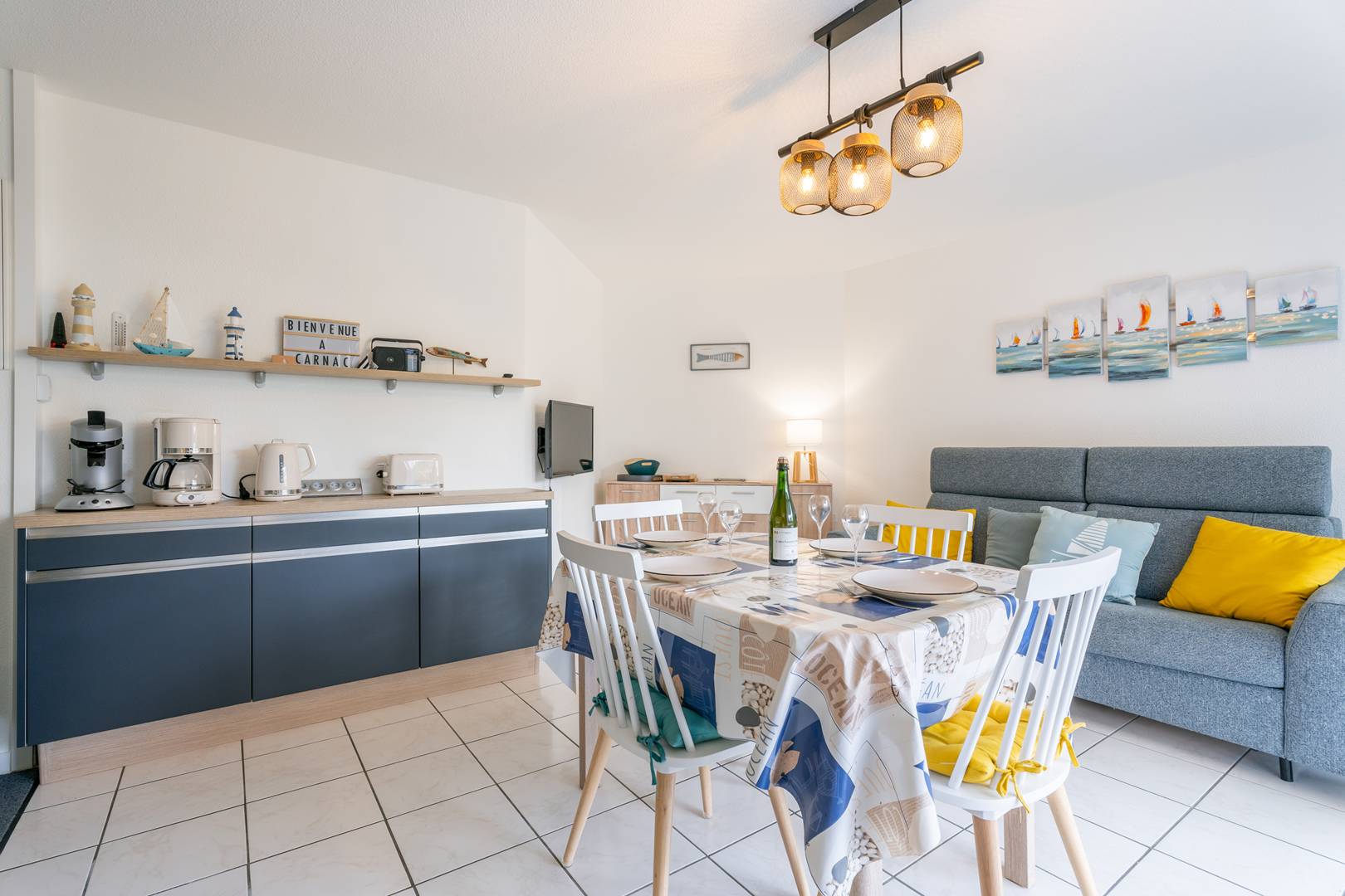 Ideally located 500m from the Grande Plage and Légenèse Beach in Carnac, the Yacht Club, and the Thalassotherapy center, beautiful 2-room apartment (approx. 35m²) for 2 people, situated in the OCEANIA 2 Residence (Building B, ground floor, door 26):