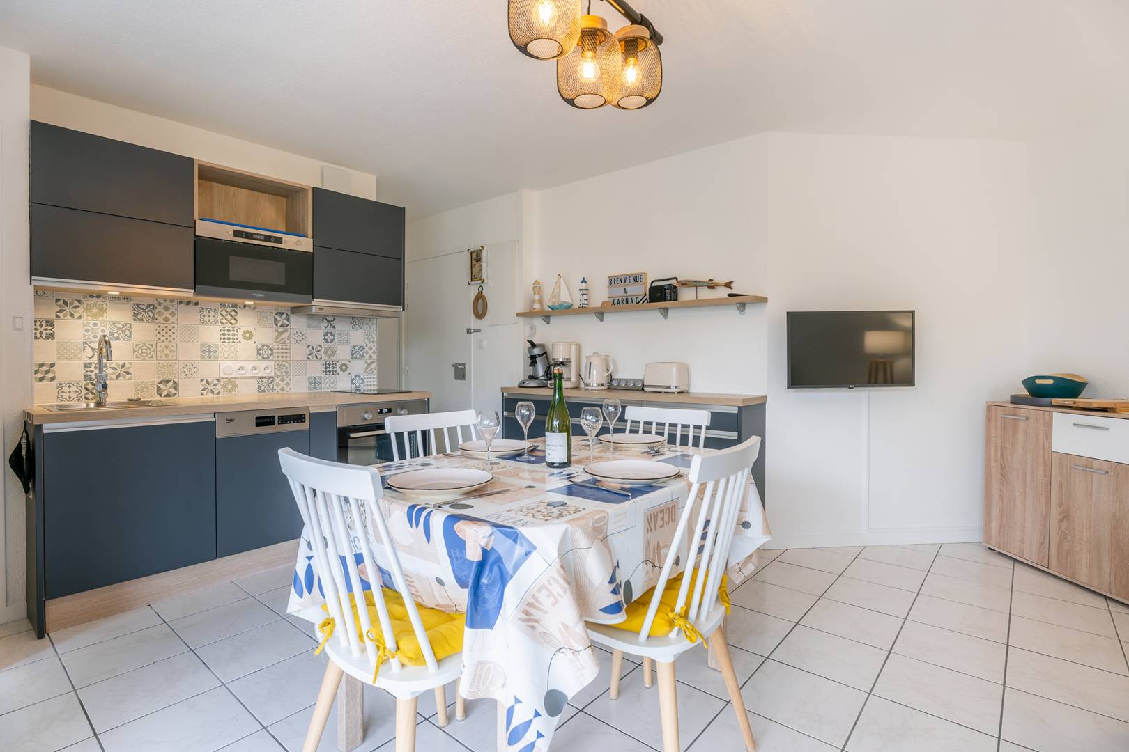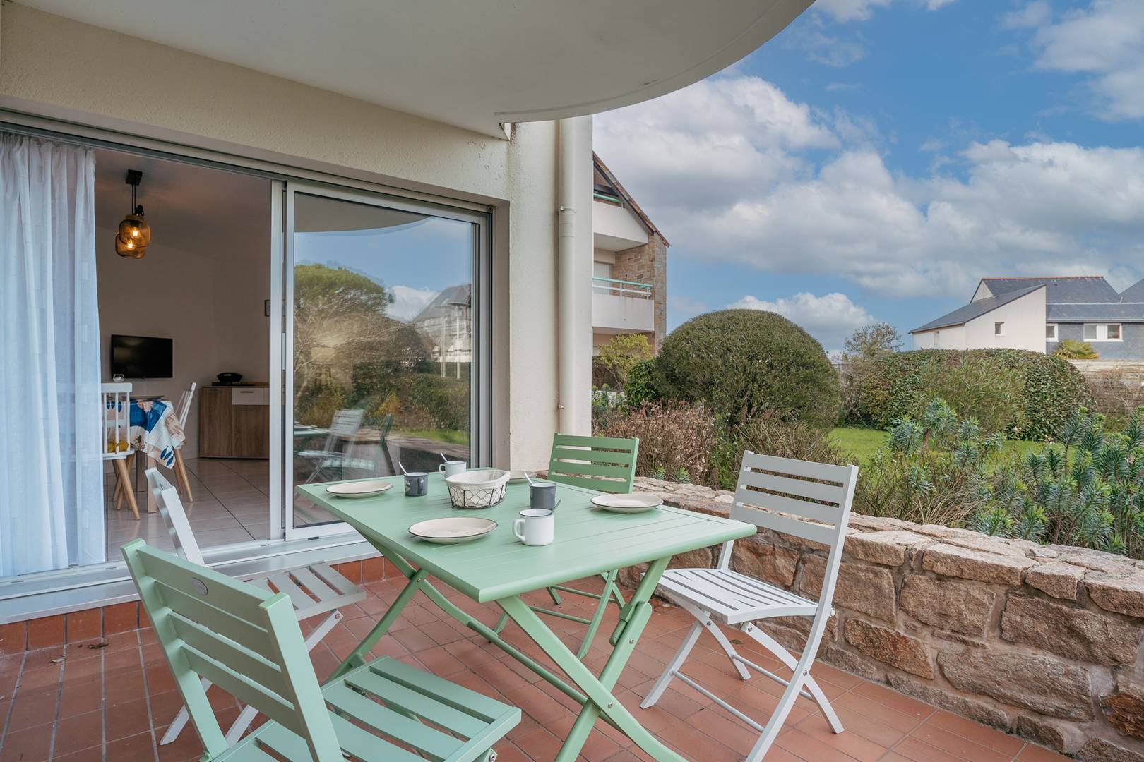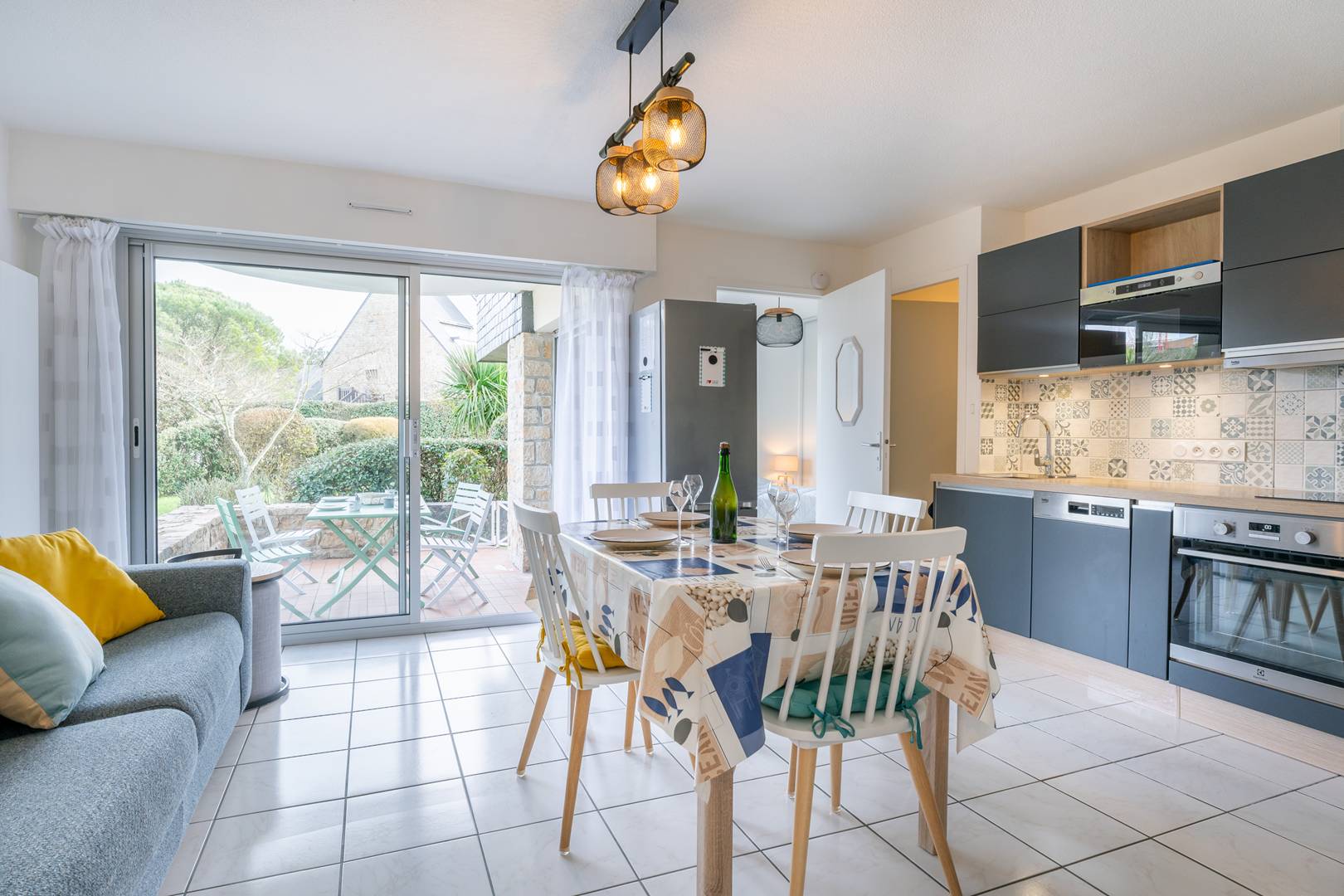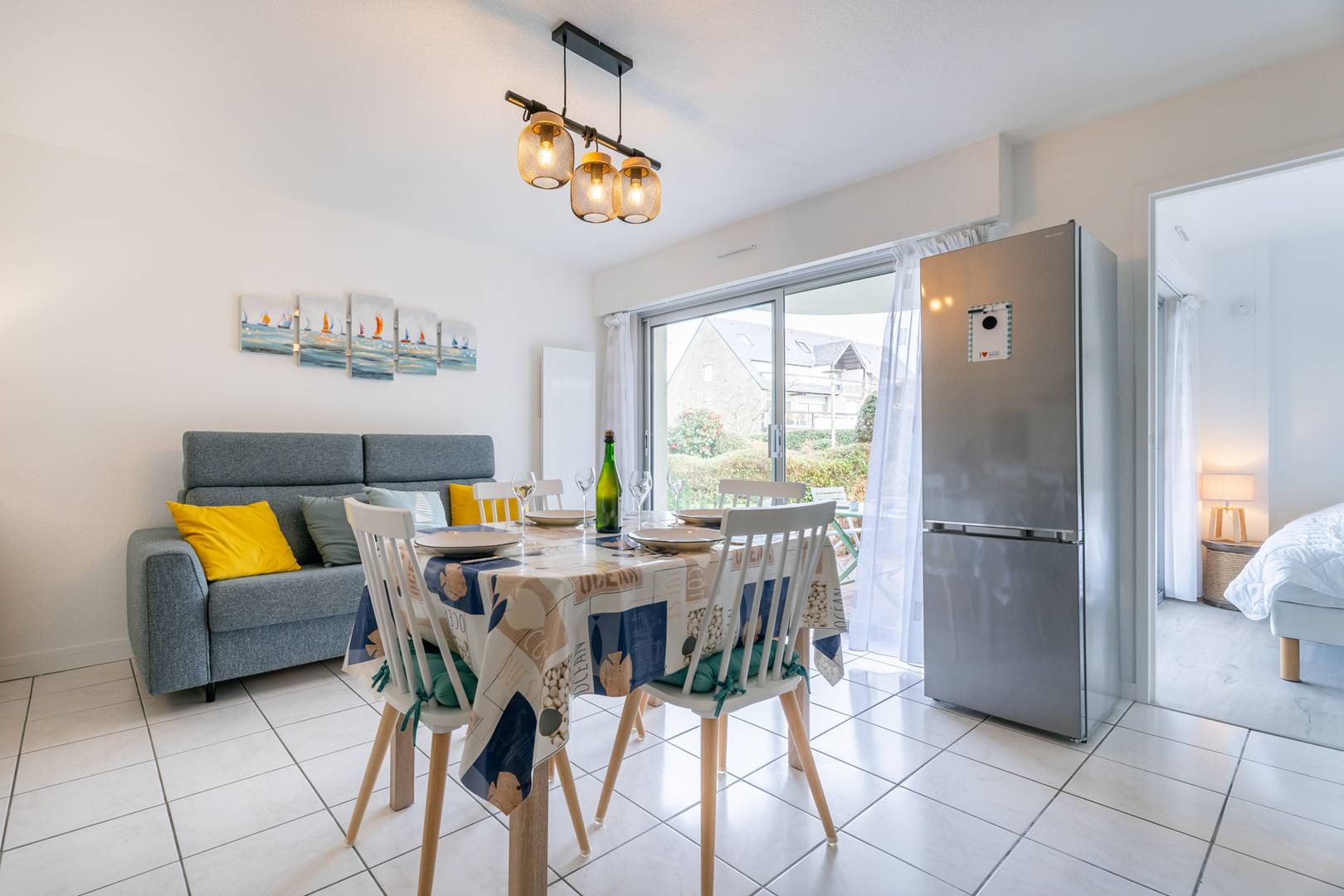 Ideally located 500m from the Grande Plage and Légenèse Beach in Carnac, the Yacht Club, and the Thalassotherapy center, beautiful 2-room apartment (approx. 35m²) for 2 people, situated in the OCEANIA 2 Residence (Building B, ground floor, door 26):