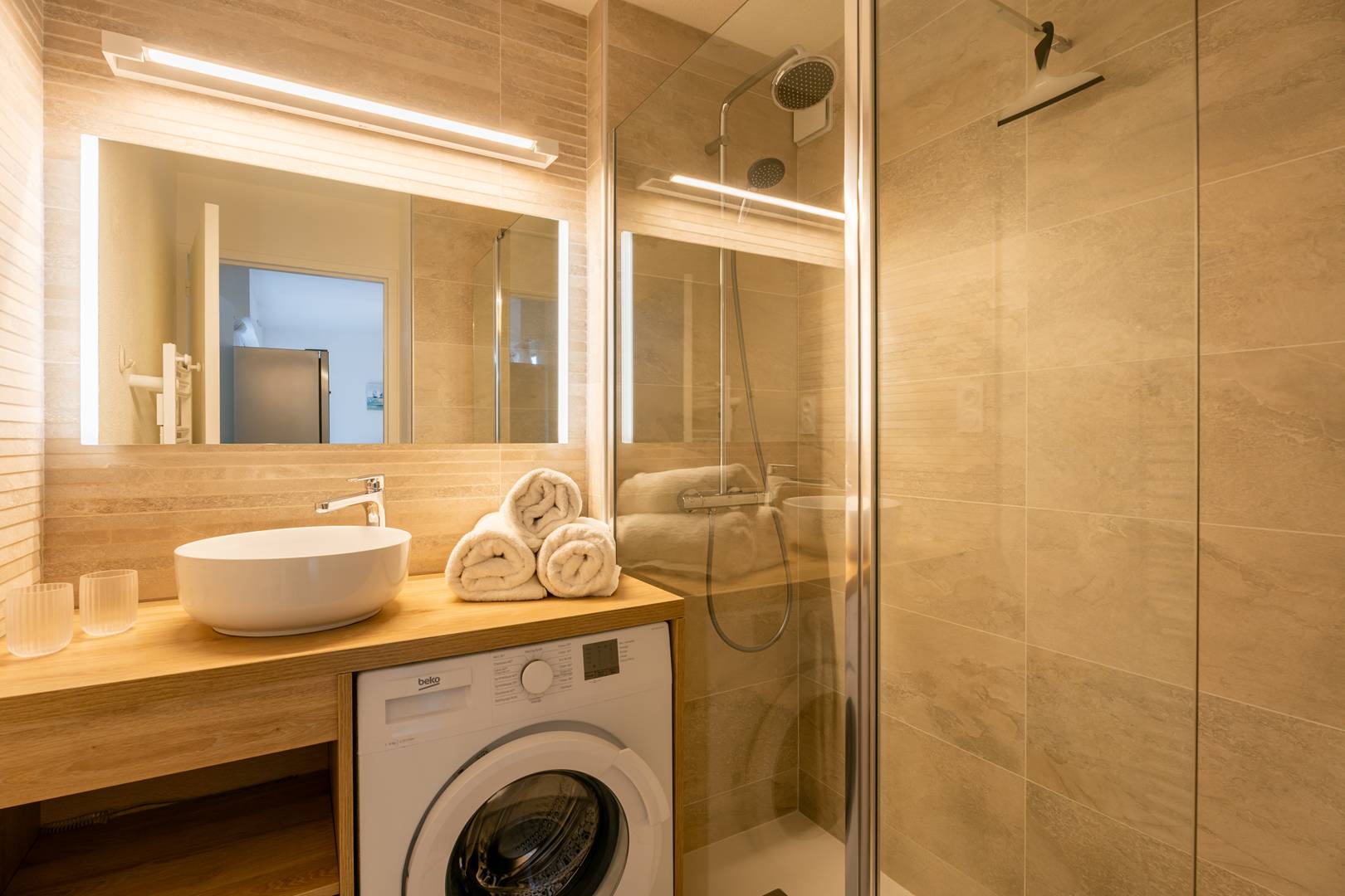 - Open-plan and fully equipped kitchen (2-ring induction hob, oven, microwave, refrigerator/freezer, dishwasher)
