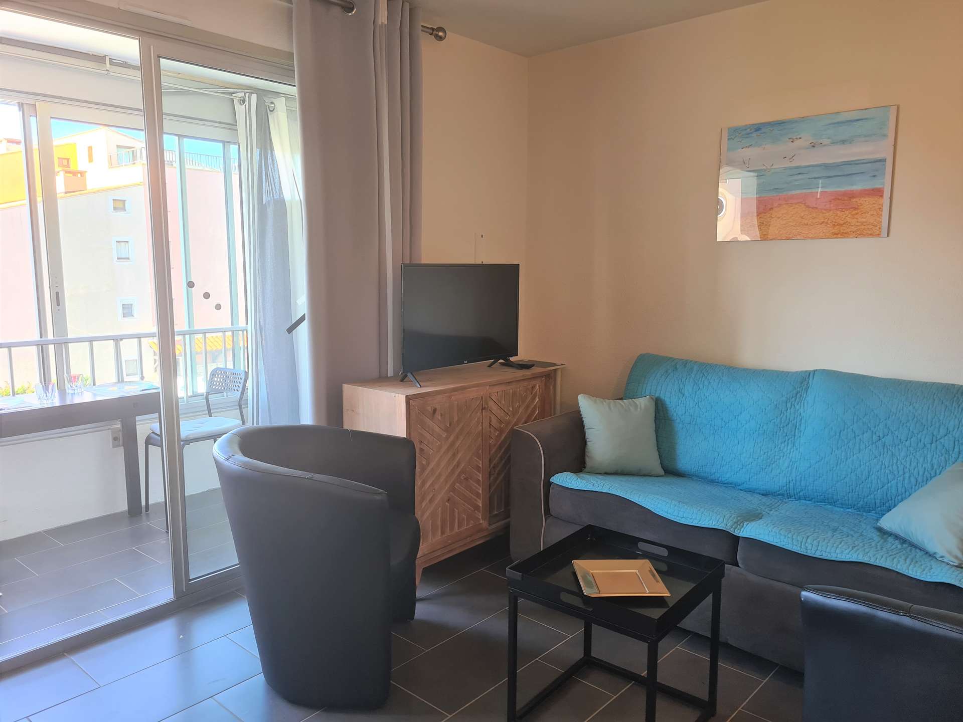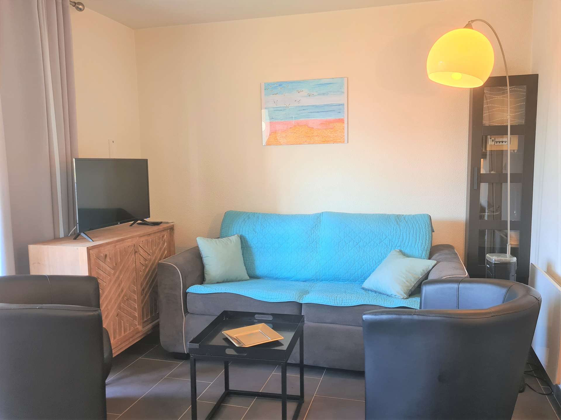 Cet appartement de vacances, situé au 1 er étage sans ascenseur, comprend un séjour avec un canapé convertible 2 places et télévision , une chambre avec un lit 2 places, un coin cuisine équipé , une salle d'eau des WC séparé et une loggia.