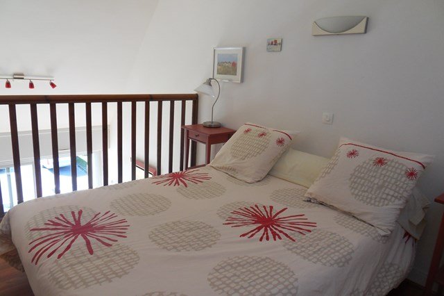 - A mezzanine converted into a bedroom with a 140 bed and a television.