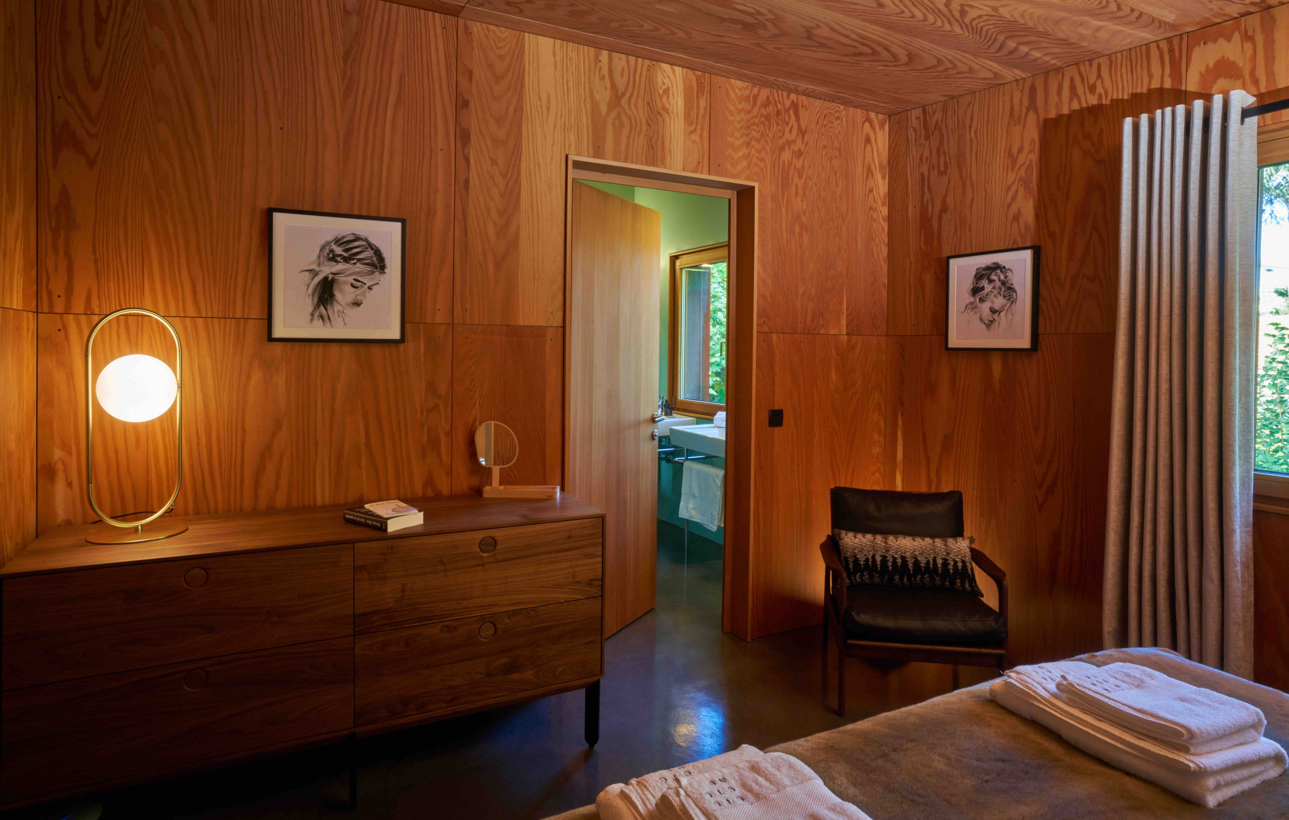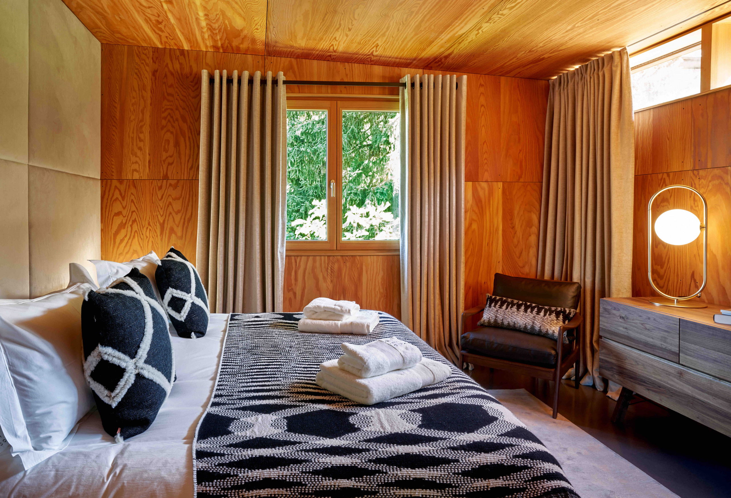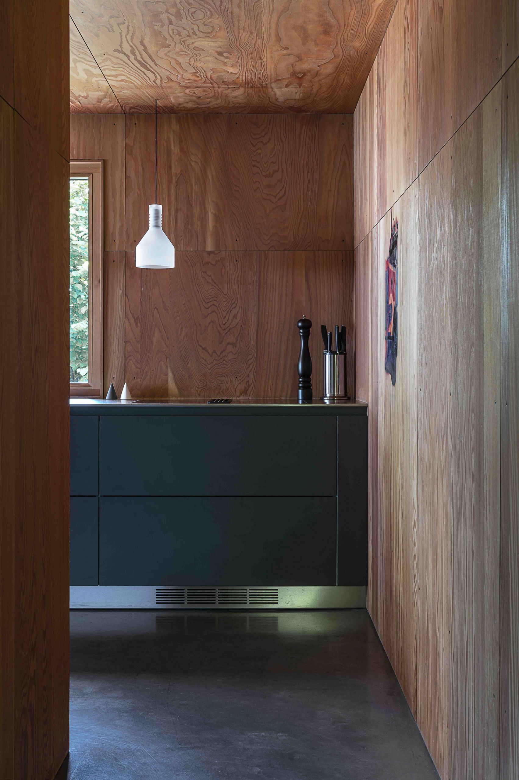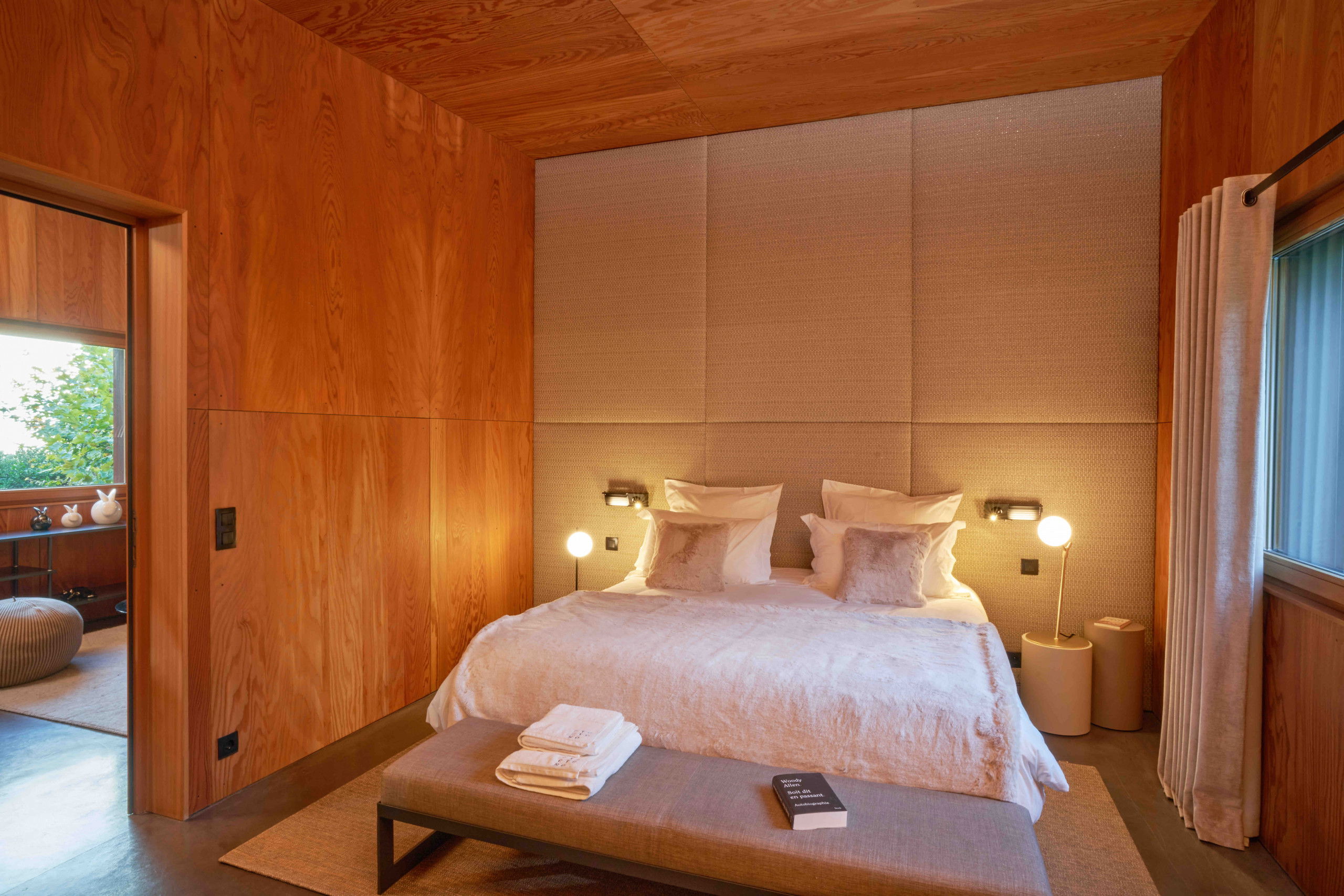 Its creator wanted it to be long, guiding the eye towards the horizon and inviting it to get lost in the distance on the lake. Made entirely of wood, black steel and concrete, the impressive ceiling height is supported by cathedral windows and a large patio window.