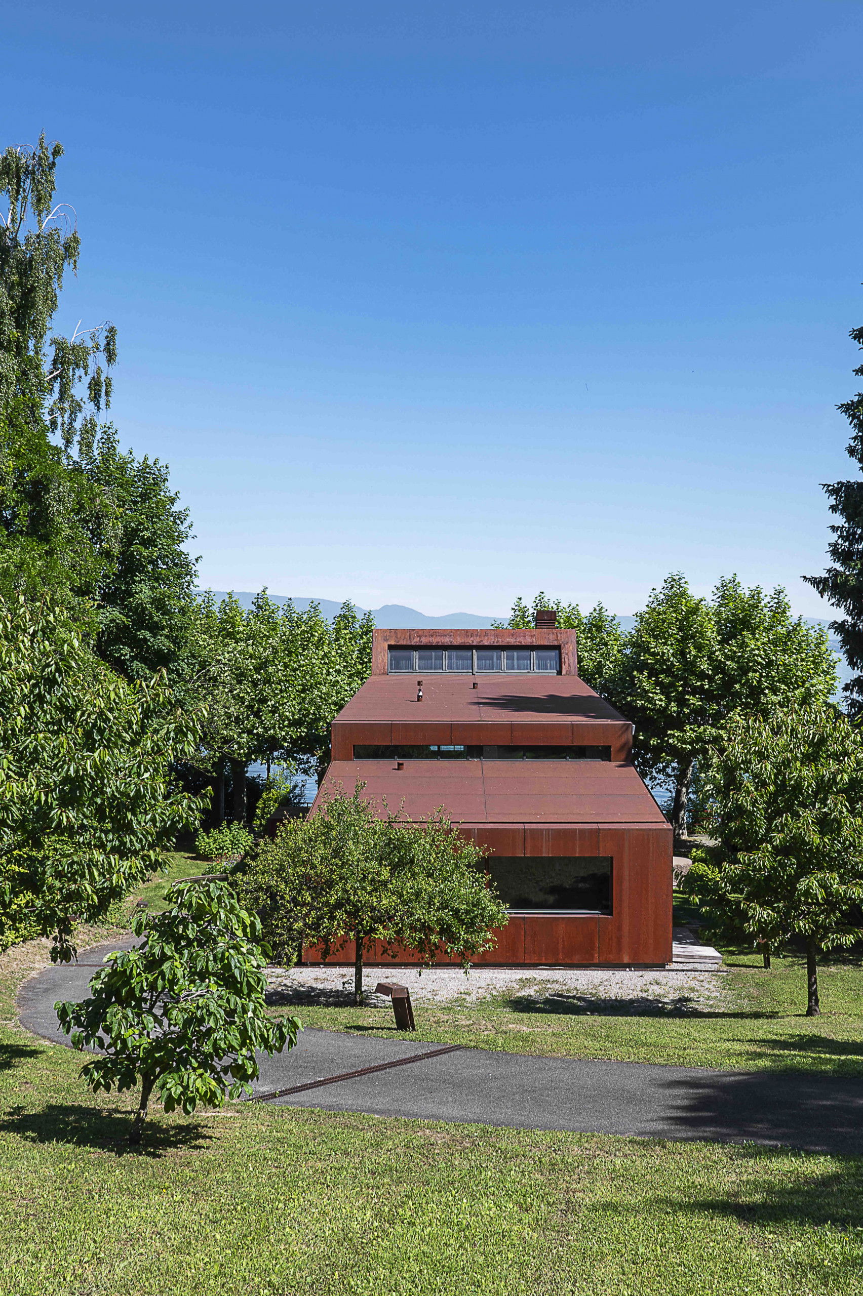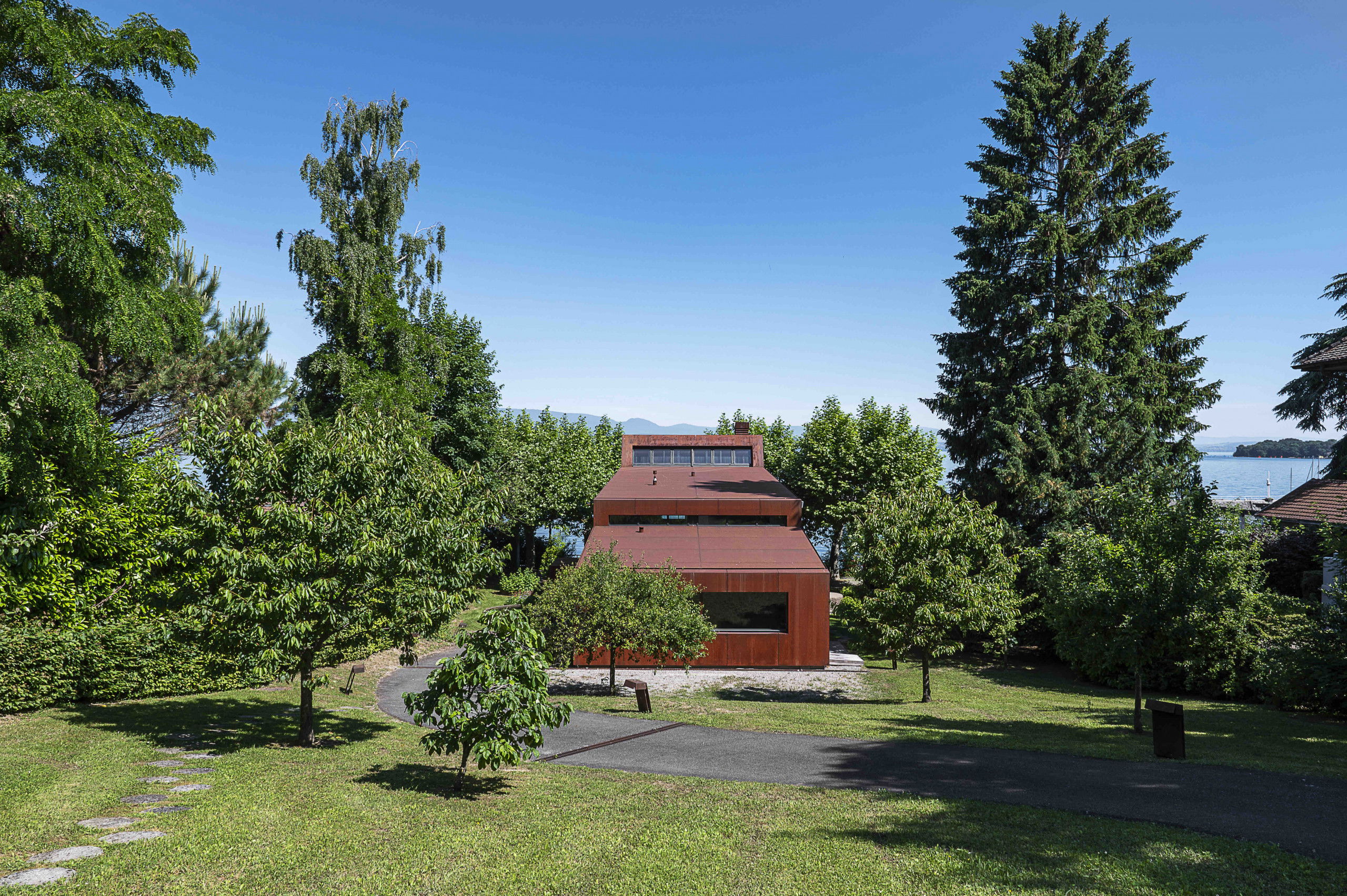 Standing only 6 meters from the water's edge, this formidable building has been carefully and cleverly designed to draw your attention to the lake in front of it.