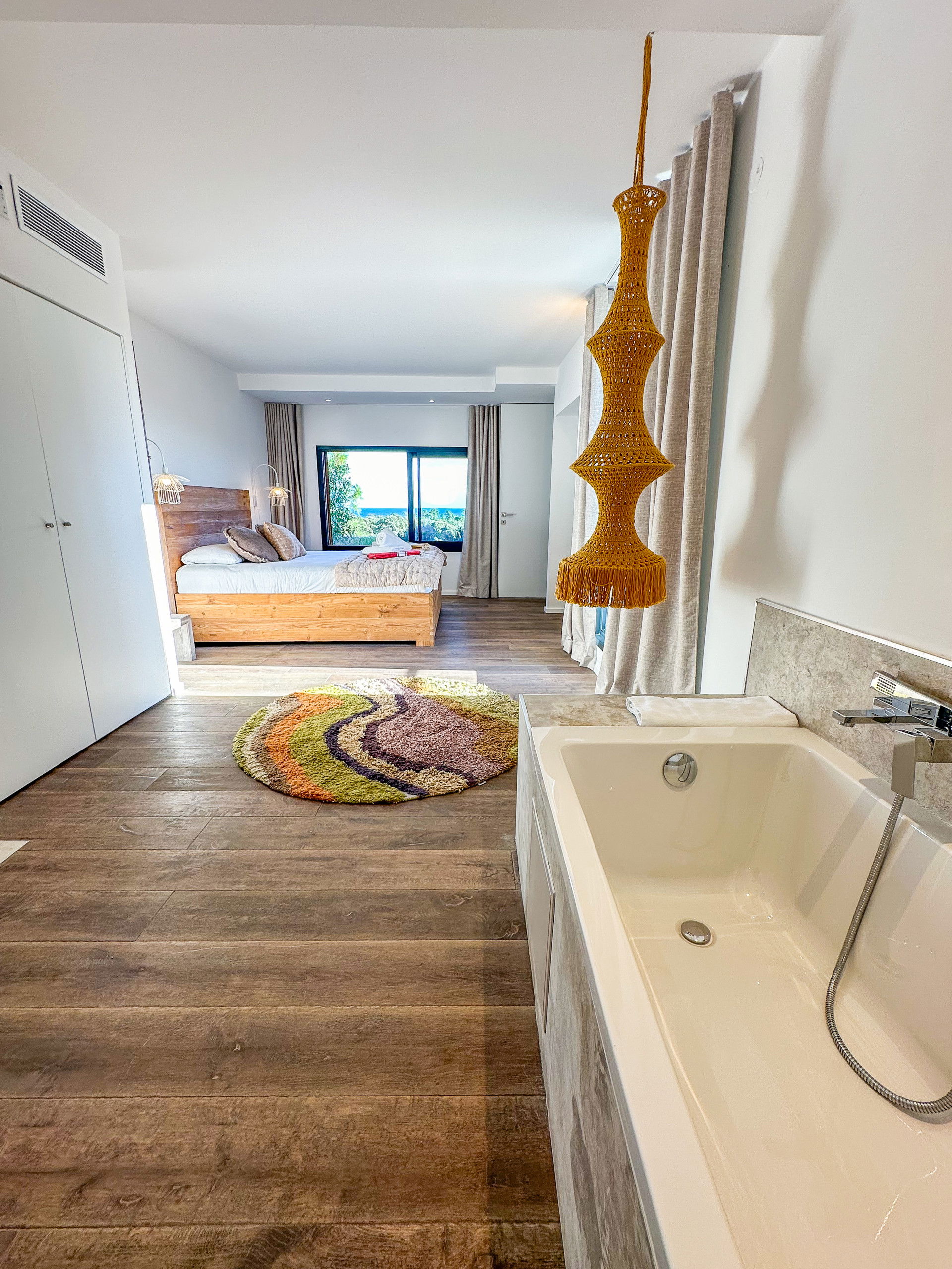 The master bedroom with a 180*200 bed on the left has a shower room, a closet, a television and a large terrace with sea view.