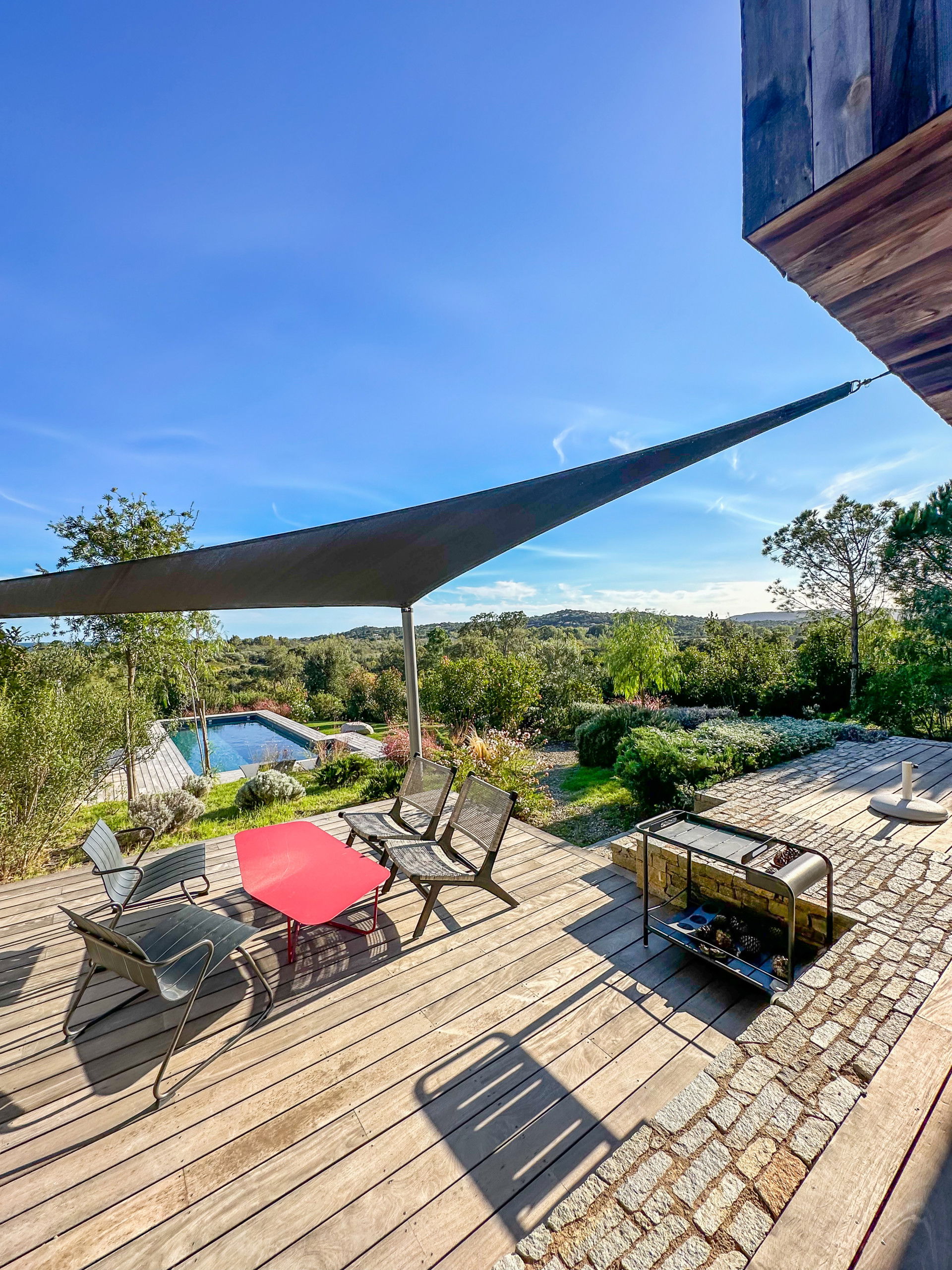 Beautifully landscaped exterior with wooden terrace, swimming pool, a relaxation and dining area with barbecue.