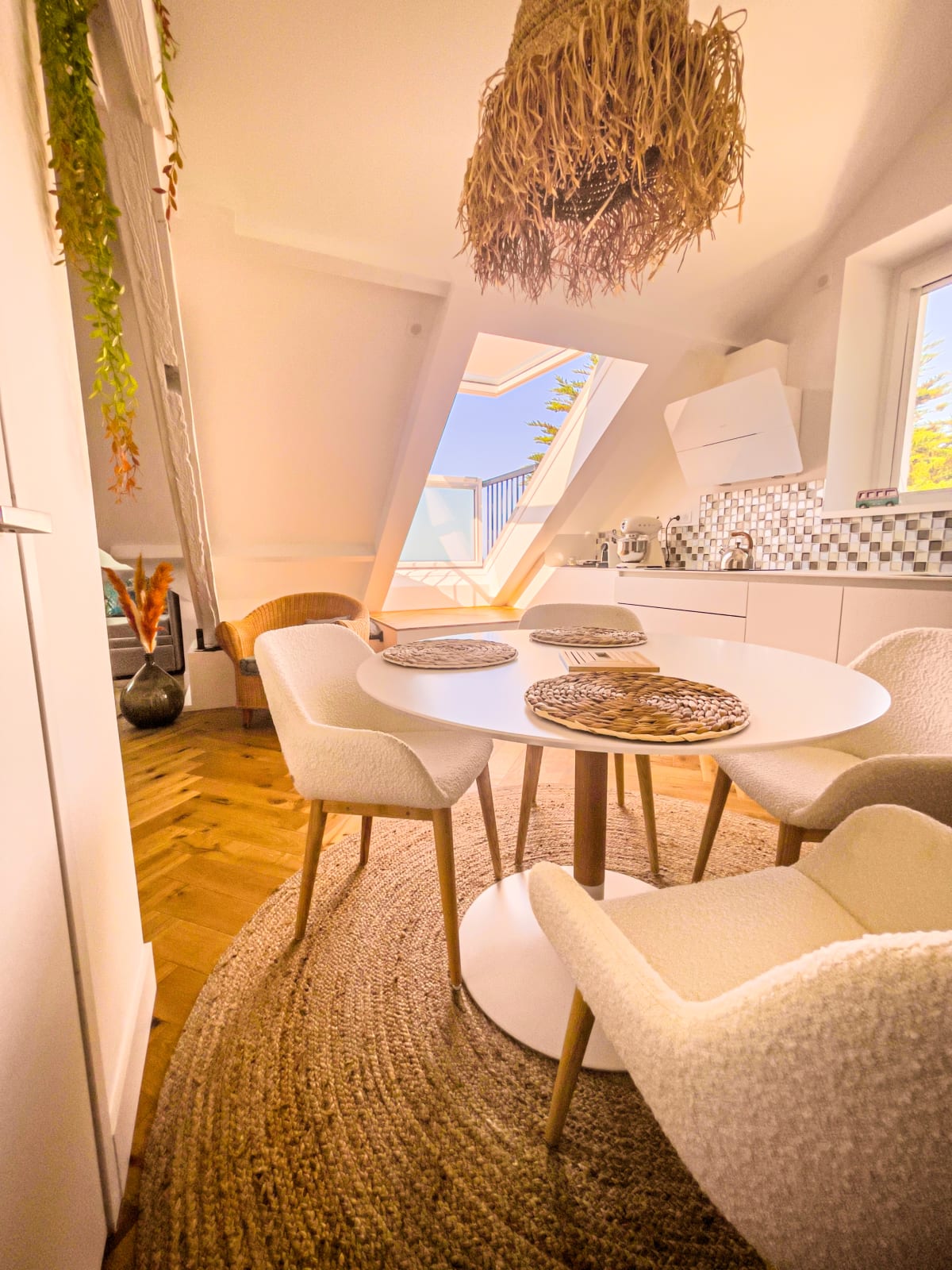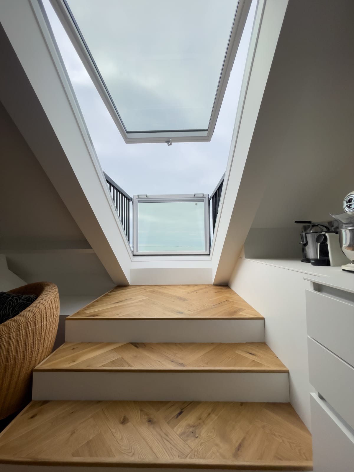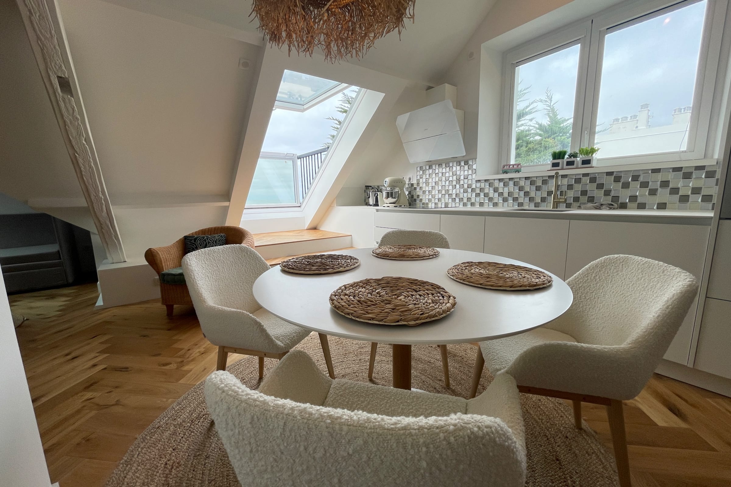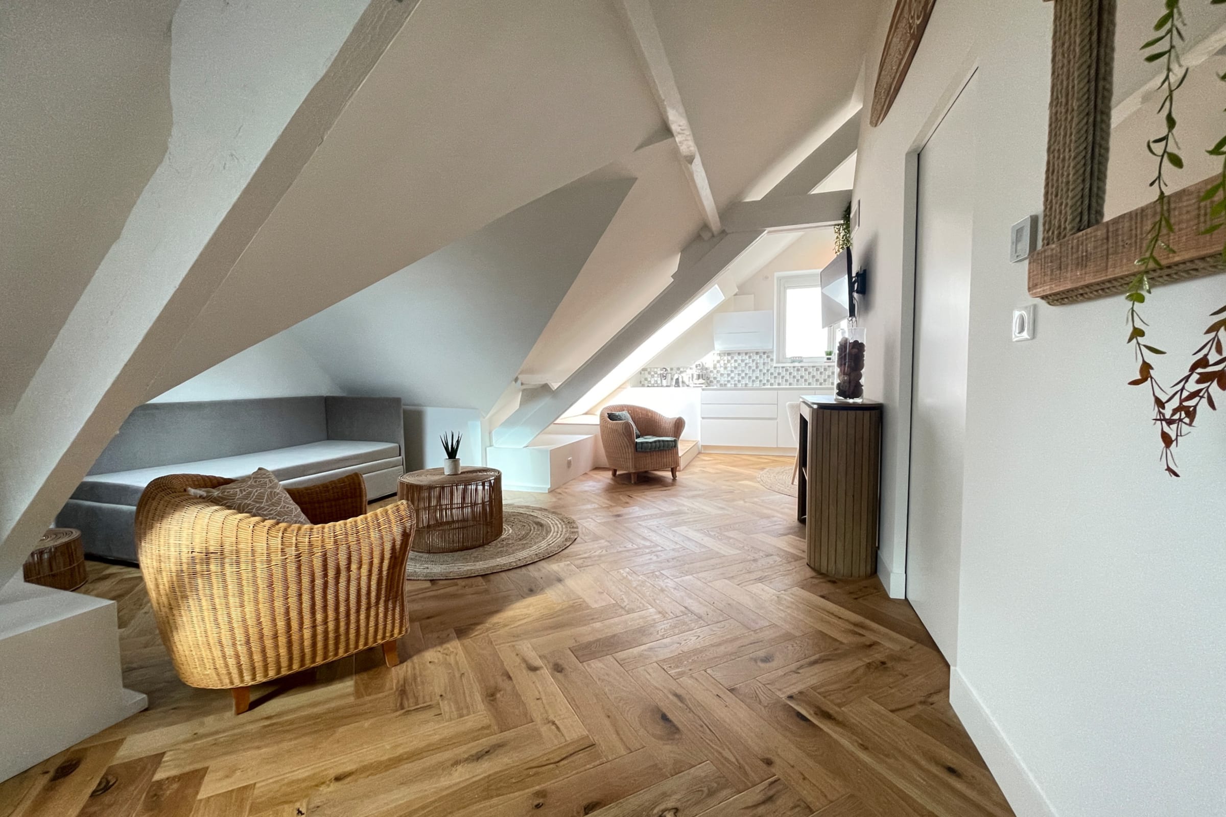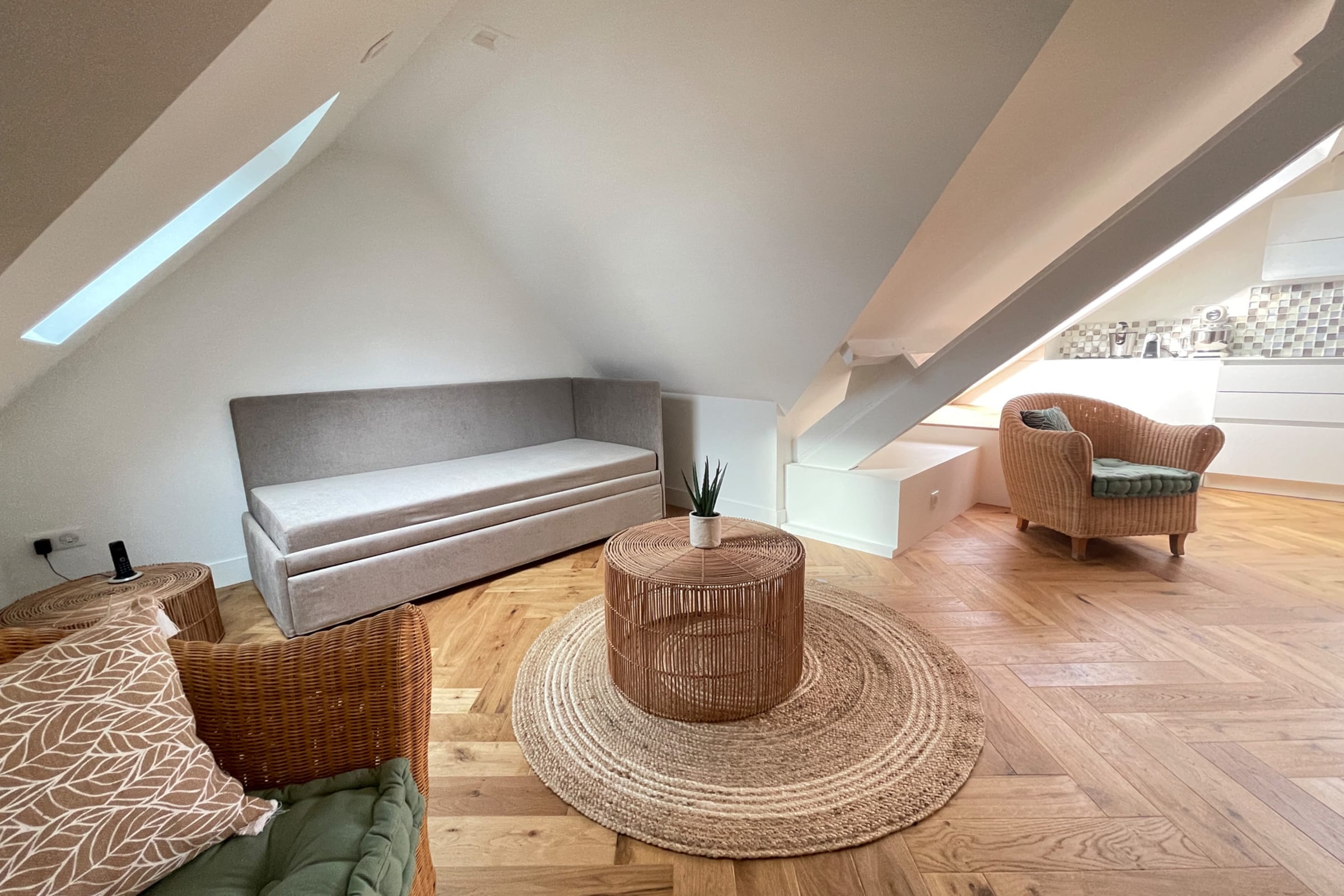 Its asset, the high sea view, the velux balcony, the charm of the beams and its brightness.