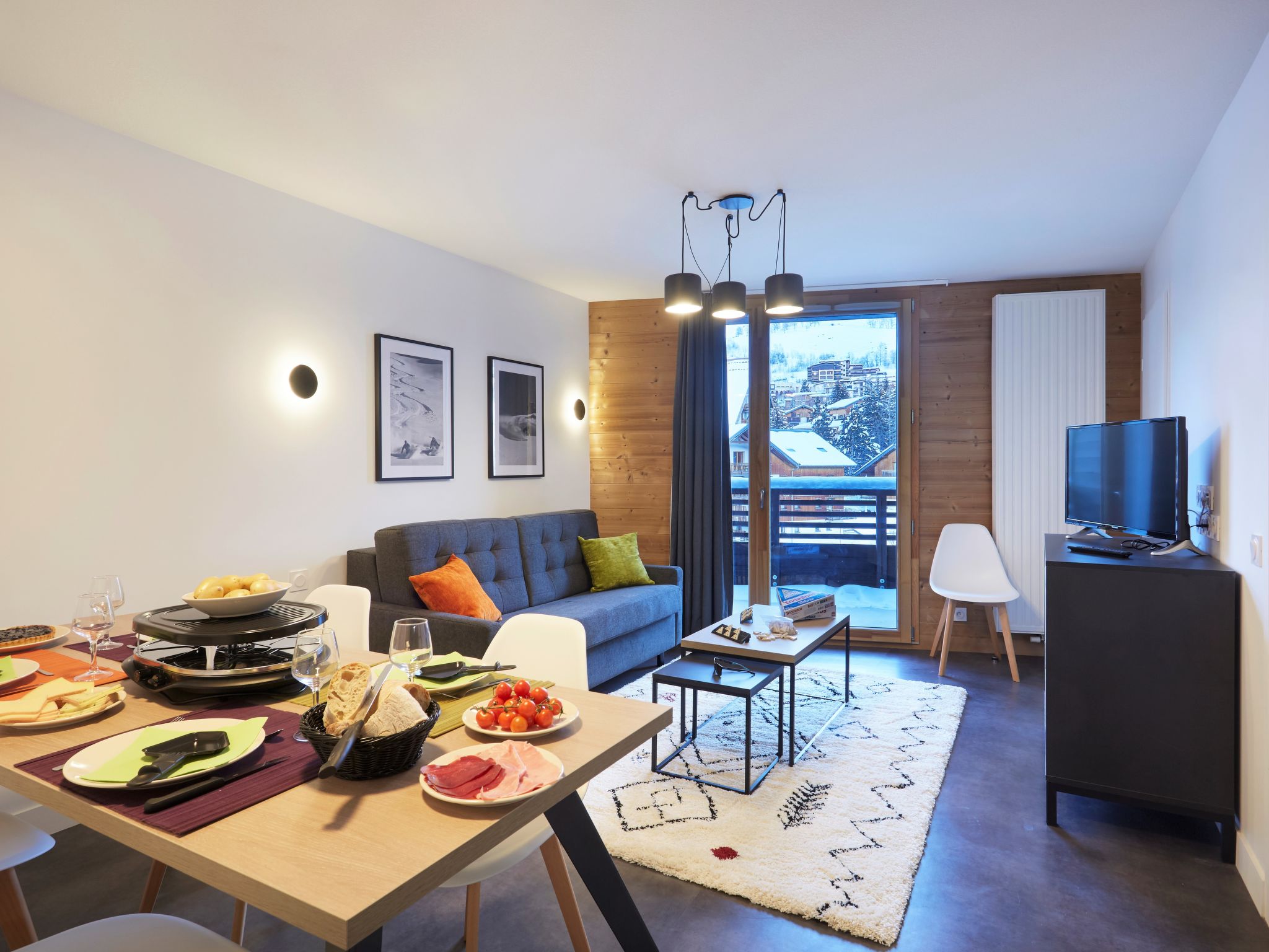 "Le Hameau", 1-room apartment 30 m2. Living/sleeping room with 1 double sofabed (140 cm, length 190 cm), 1 french bed (140 cm, length 190 cm), dining table and TV (flat screen). Exit to the balcony, to the terrace. Kitchenette (dishwasher, 2 ceramic glass hob hotplates, toaster, kettle, microwave, electric coffee machine). Bathroom, sep. WC. Electric heating. Small balcony or small terrace. Balcony furniture. Facilities: iron, children's high chair, baby cot. Internet (WiFi, free). Please note: non-smokers only. Smoke alarm. The property is one of a type of property or apartment.