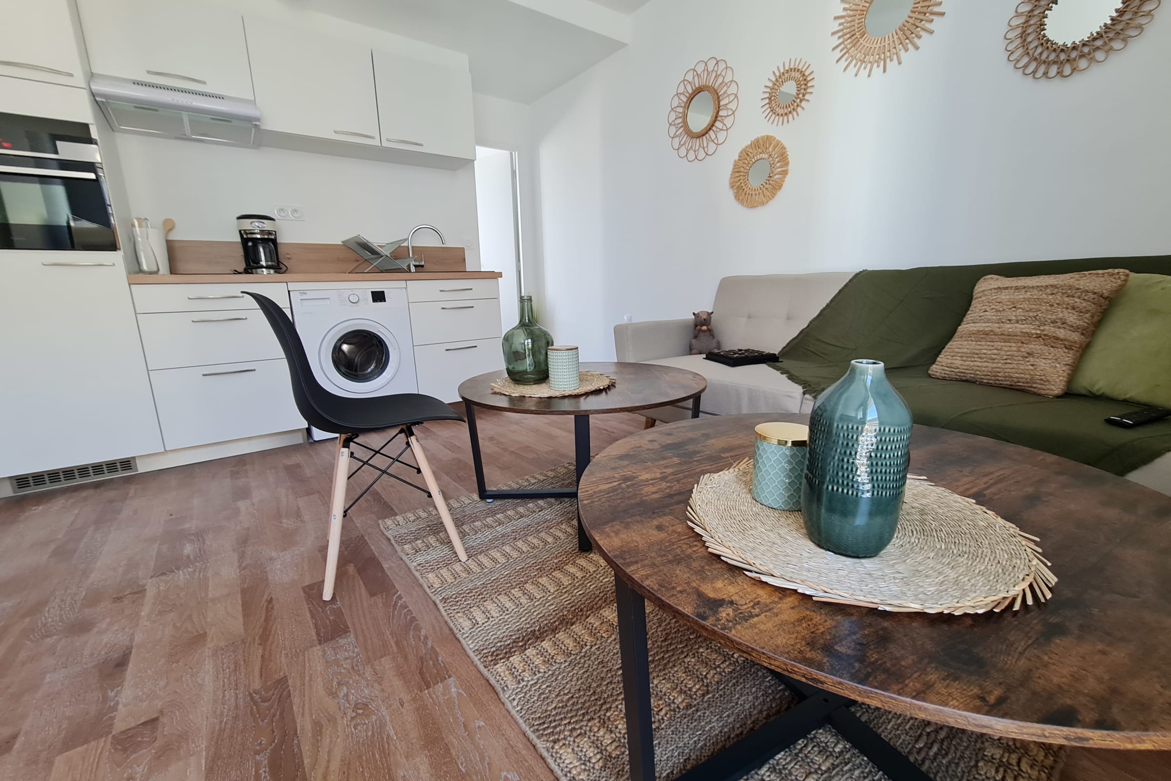 - Une pièce de vie avec cuisine aménagée et équipée,