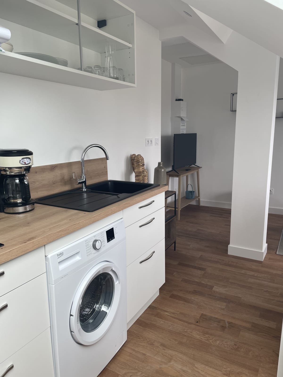 - Une pièce de vie avec cuisine aménagée et équipée,