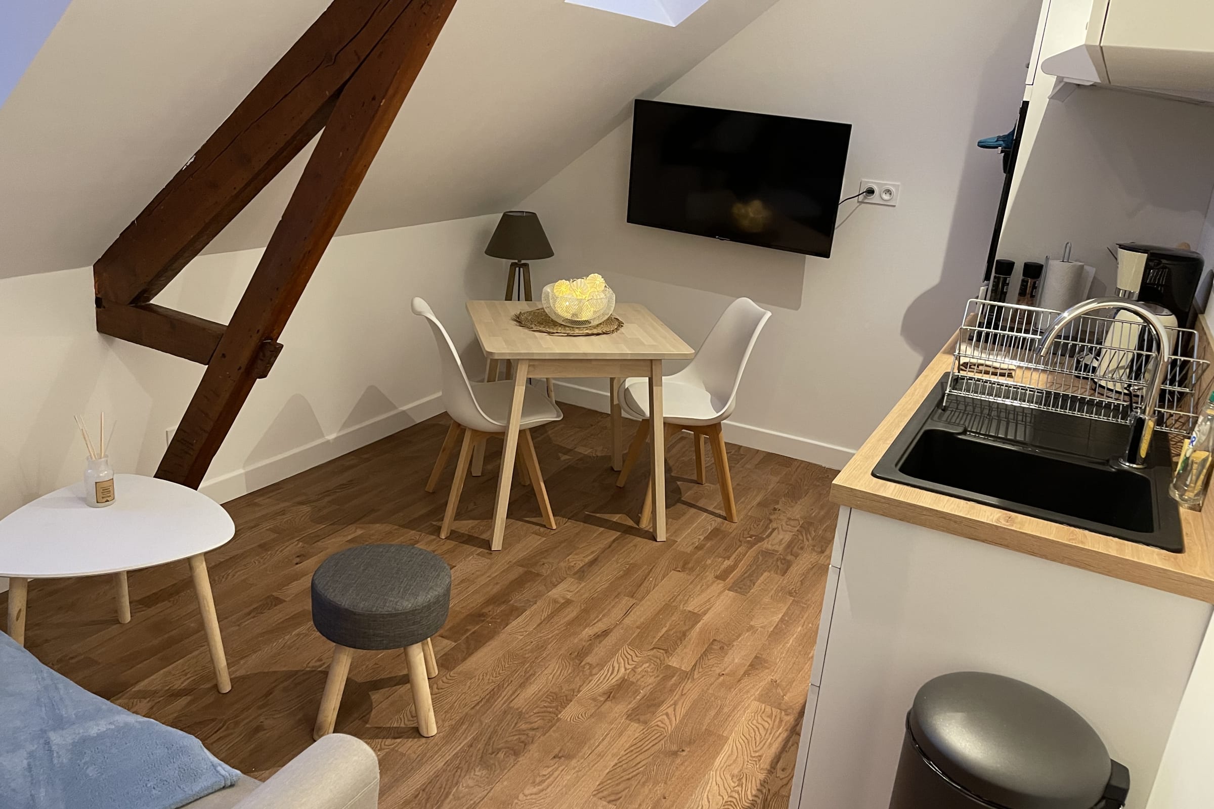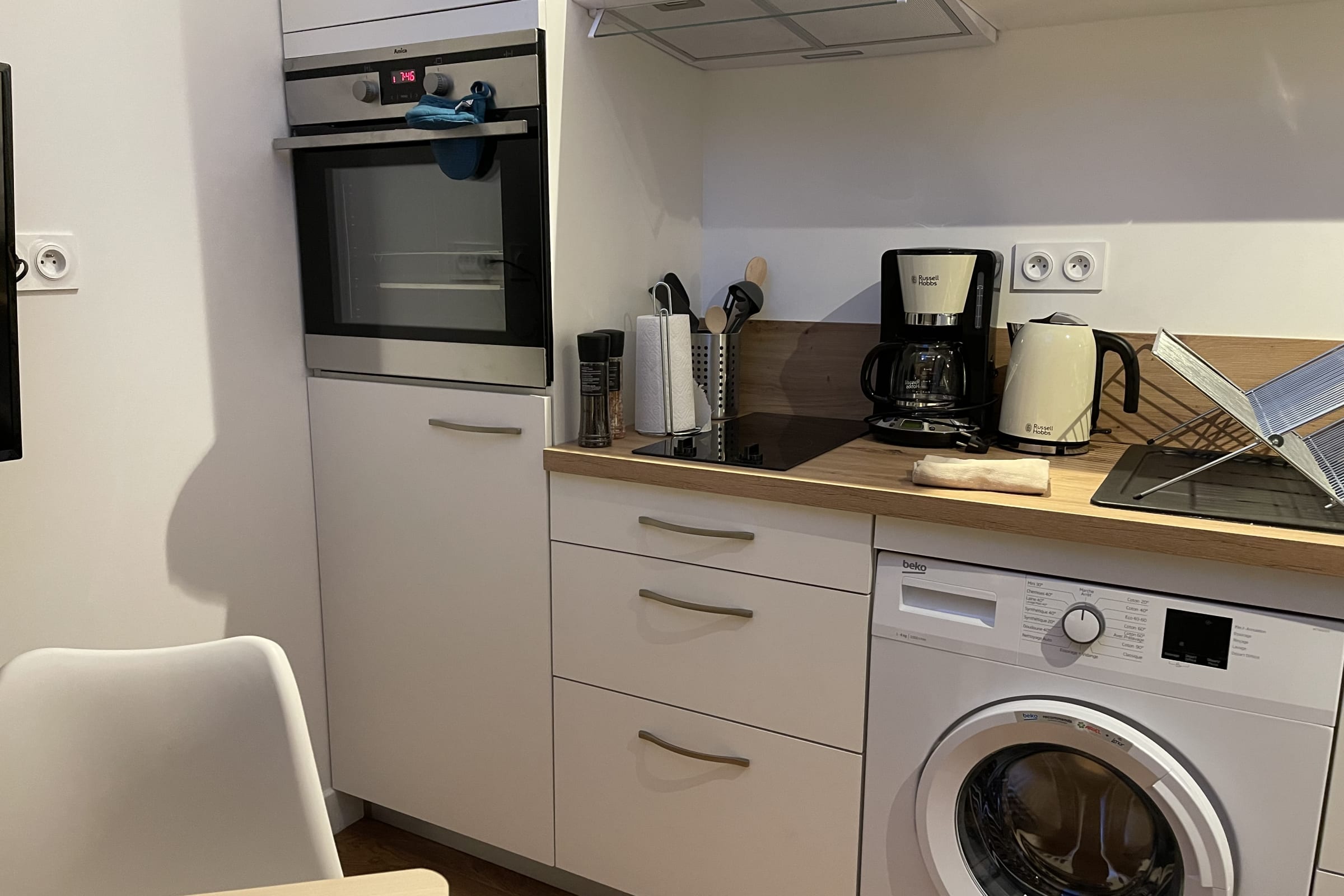 - Une pièce de vie avec cuisine aménagée et équipée,