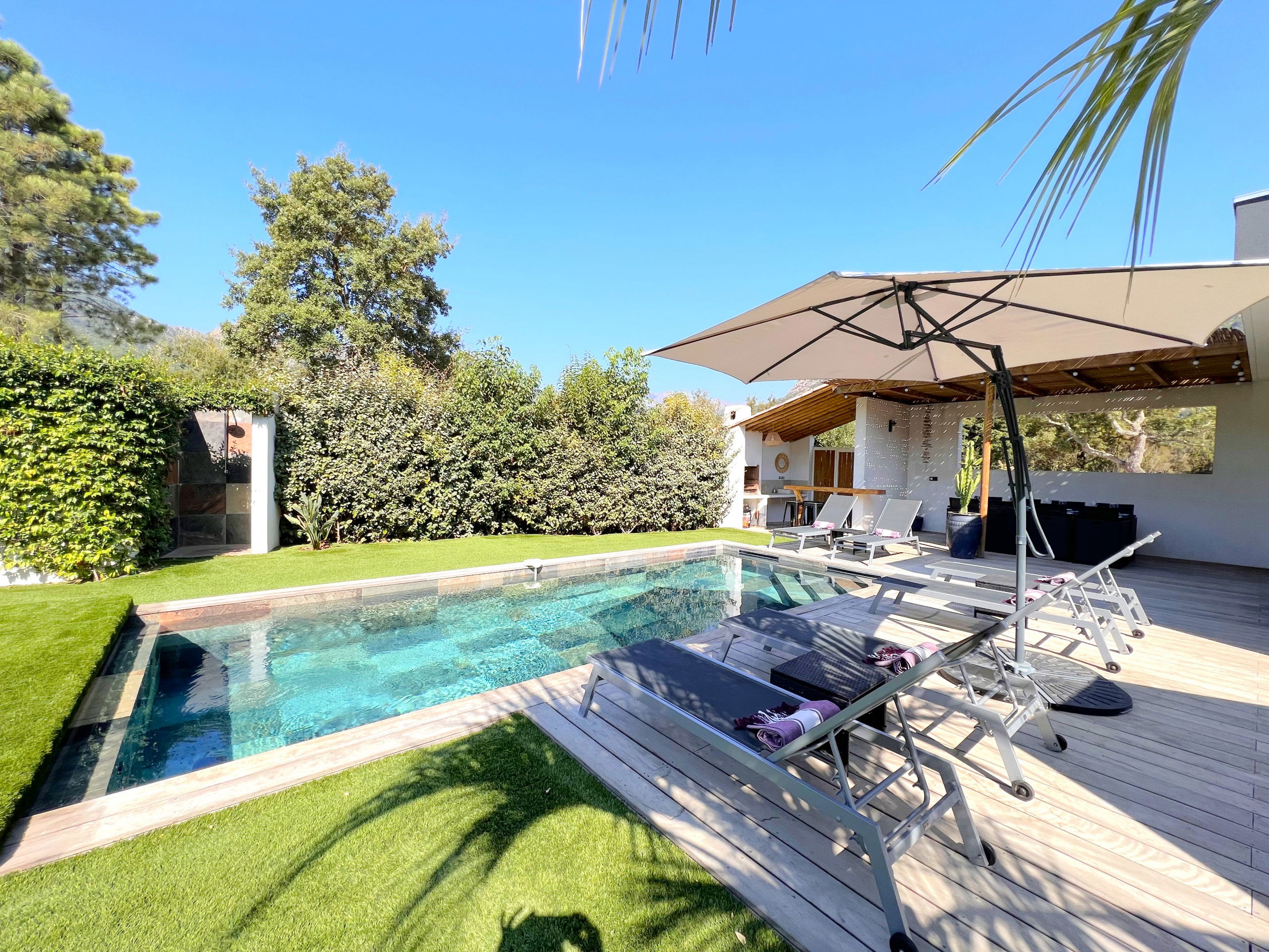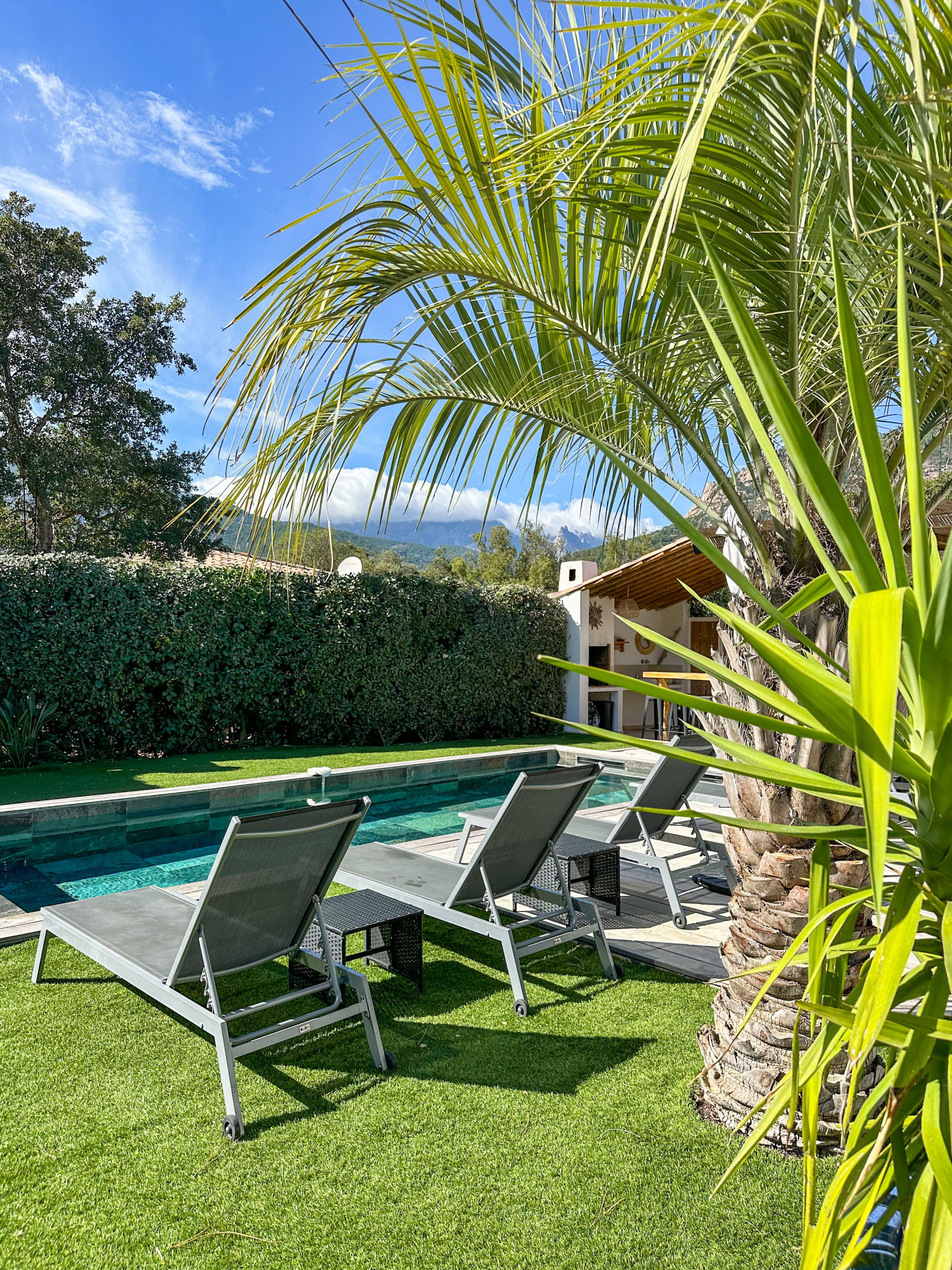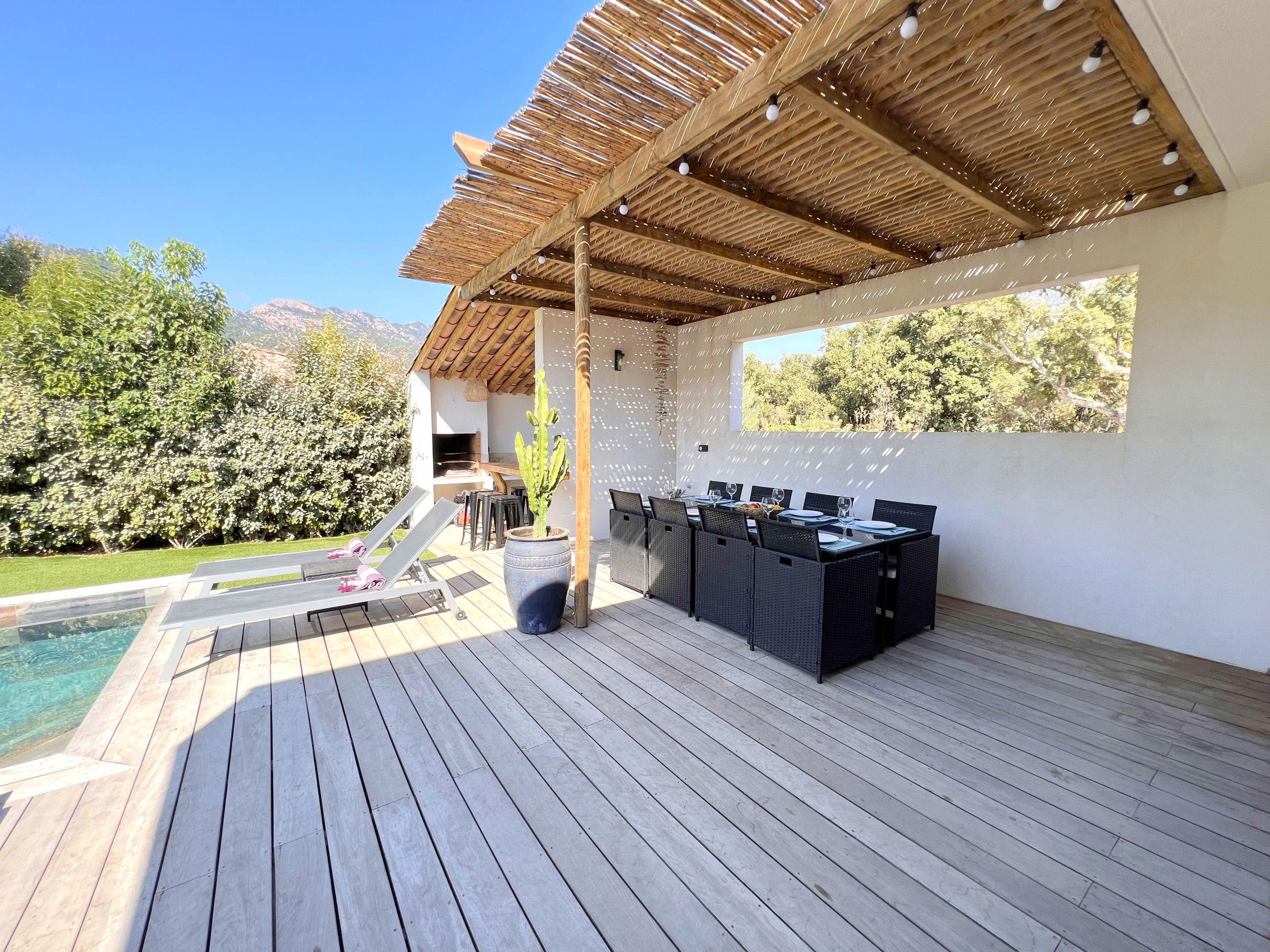 Villa ASSULIA is a beautiful modern and comfortable single-storey villa with mountain views. It has quality services (materials, kitchen, bathrooms ...), large glass openings and electric shutters, air conditioning in all rooms (independent): 4 bedrooms, 3 bathrooms, 3 toilets, private heated swimming pool, wooden terraces (100 m2) on large landscaped and fenced garden