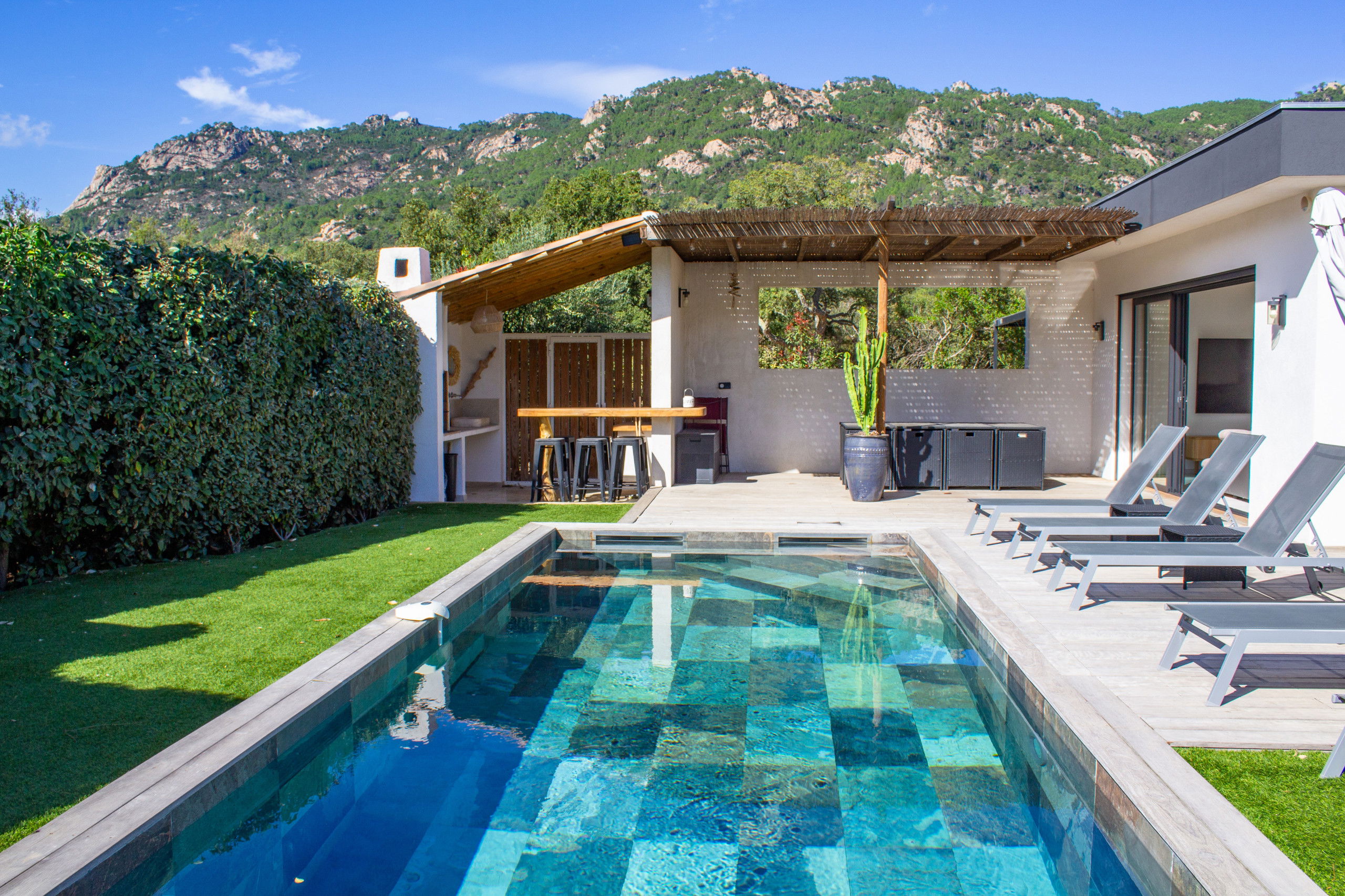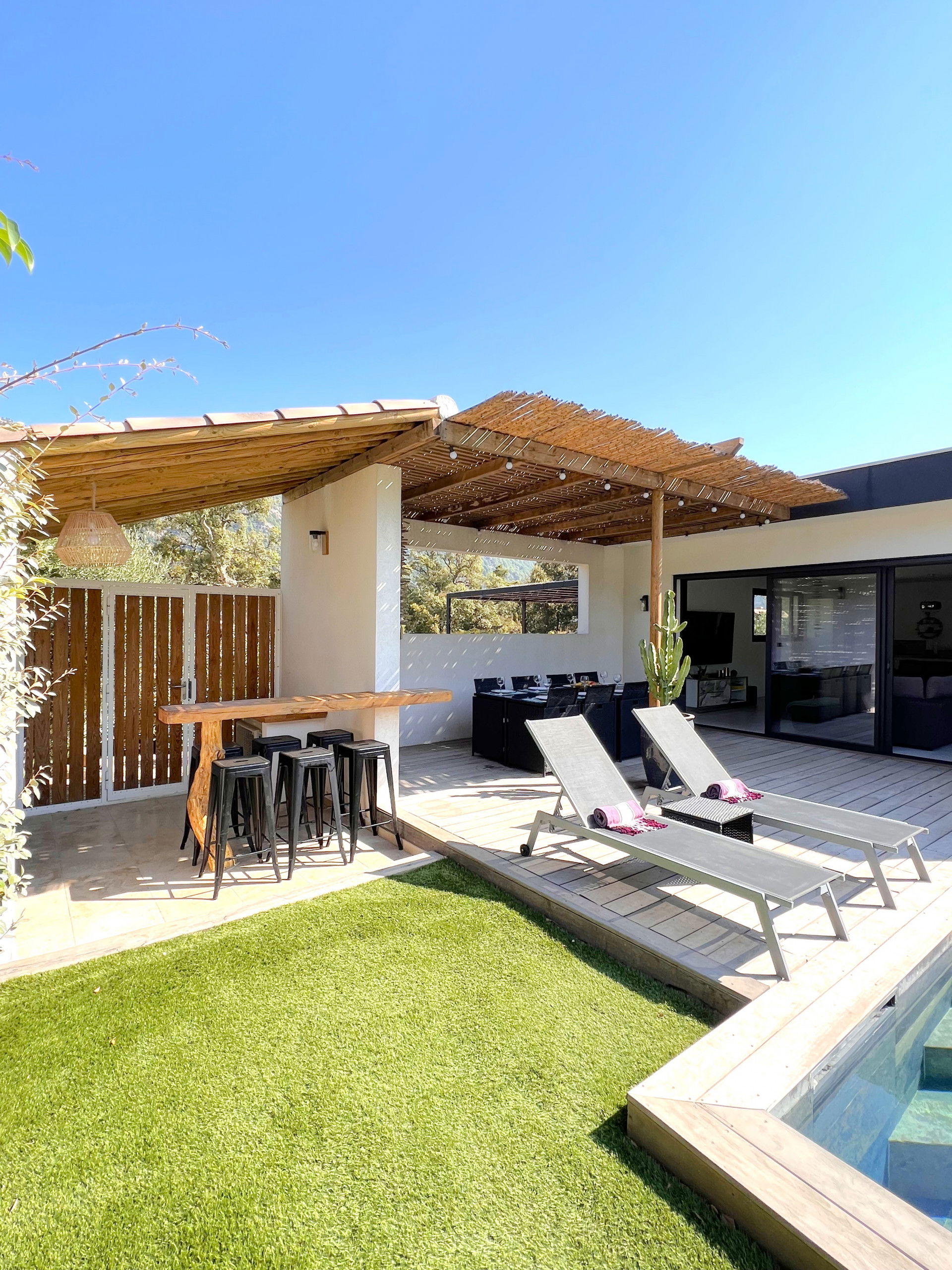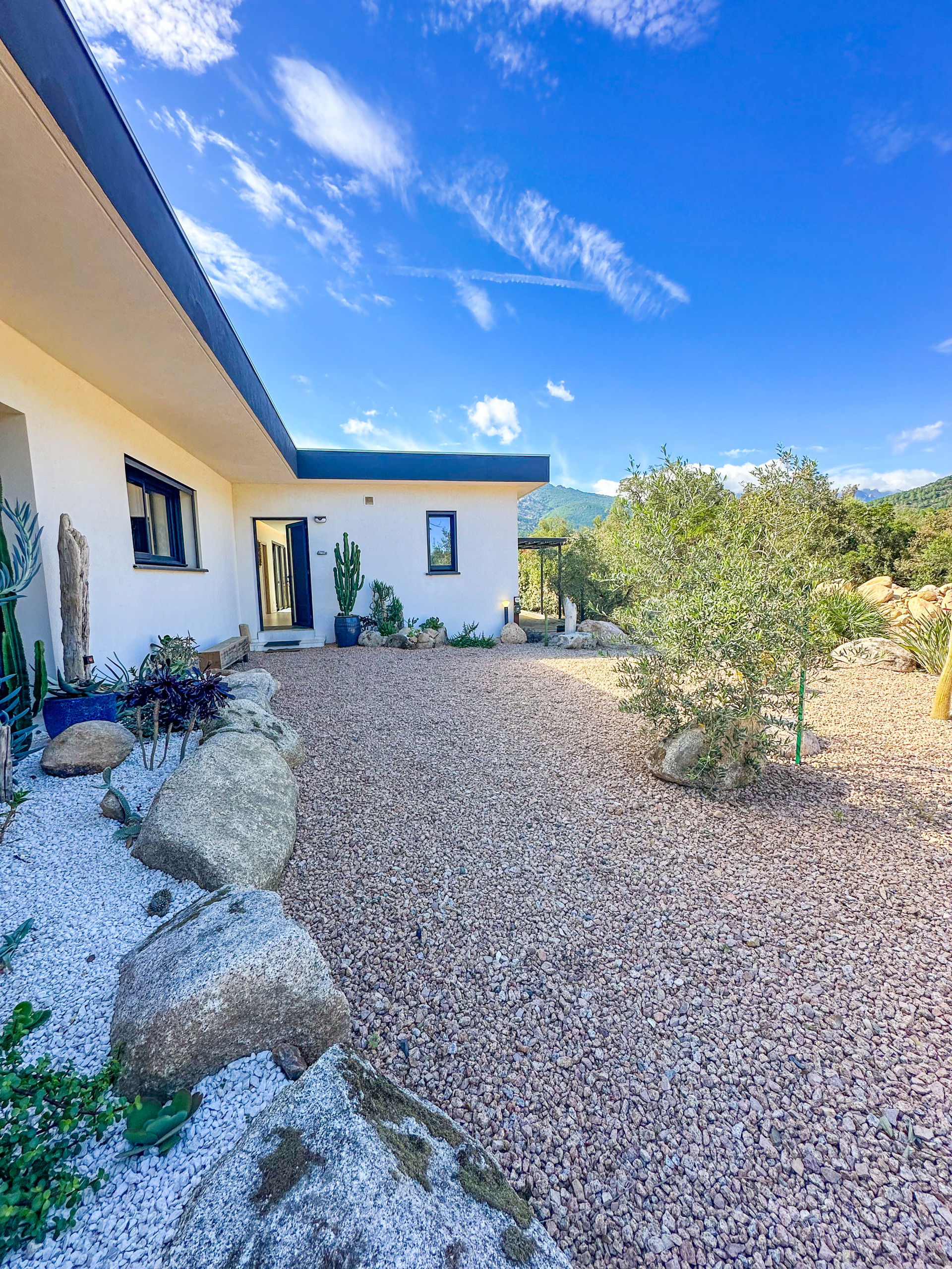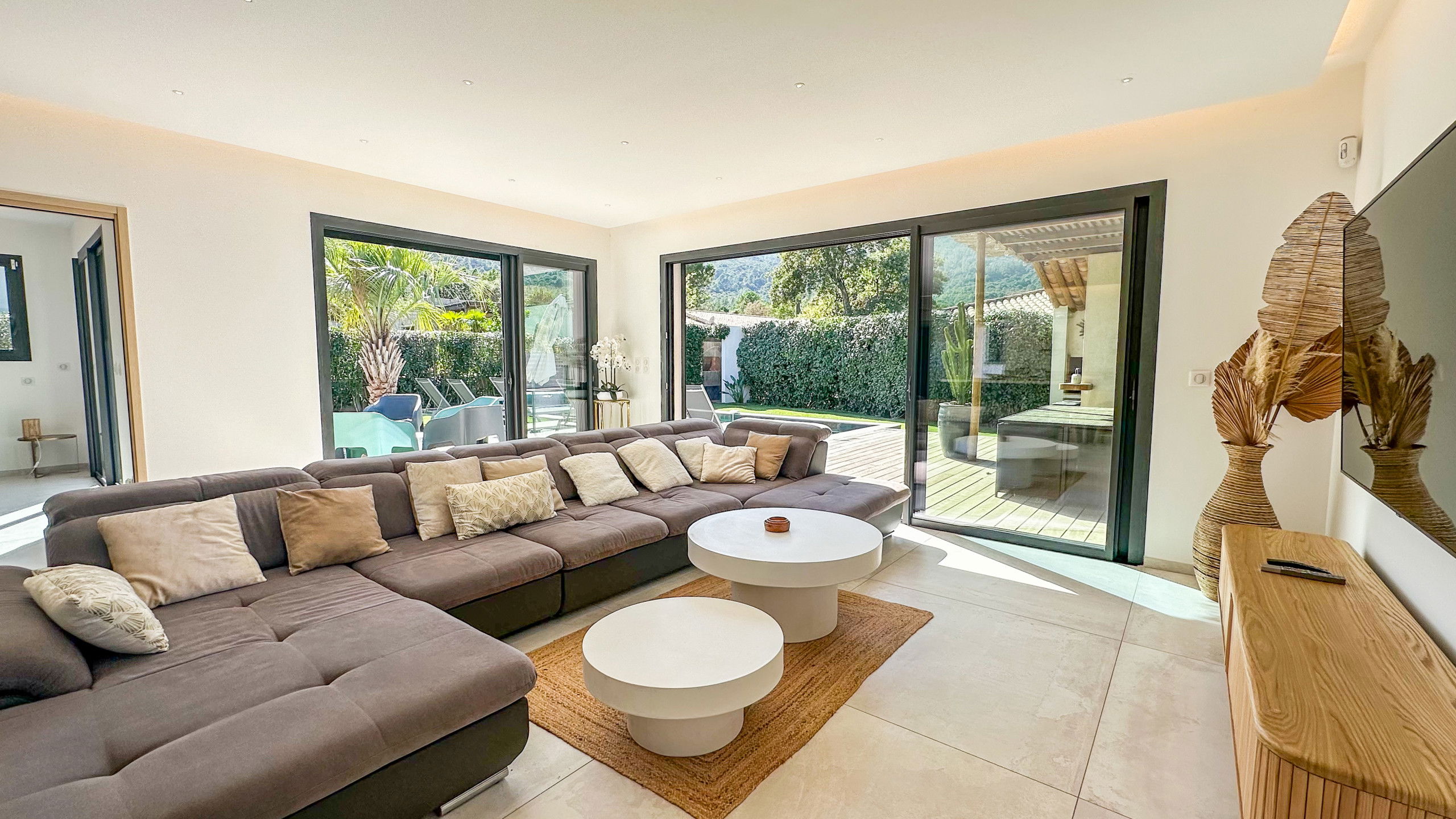 Villa ASSULIA is a beautiful modern and comfortable single-storey villa with mountain views. It has quality services (materials, kitchen, bathrooms ...), large glass openings and electric shutters, air conditioning in all rooms (independent): 4 bedrooms, 3 bathrooms, 3 toilets, private heated swimming pool, wooden terraces (100 m2) on large landscaped and fenced garden