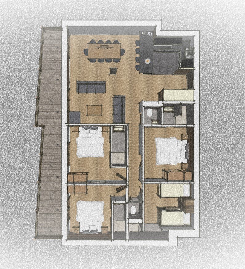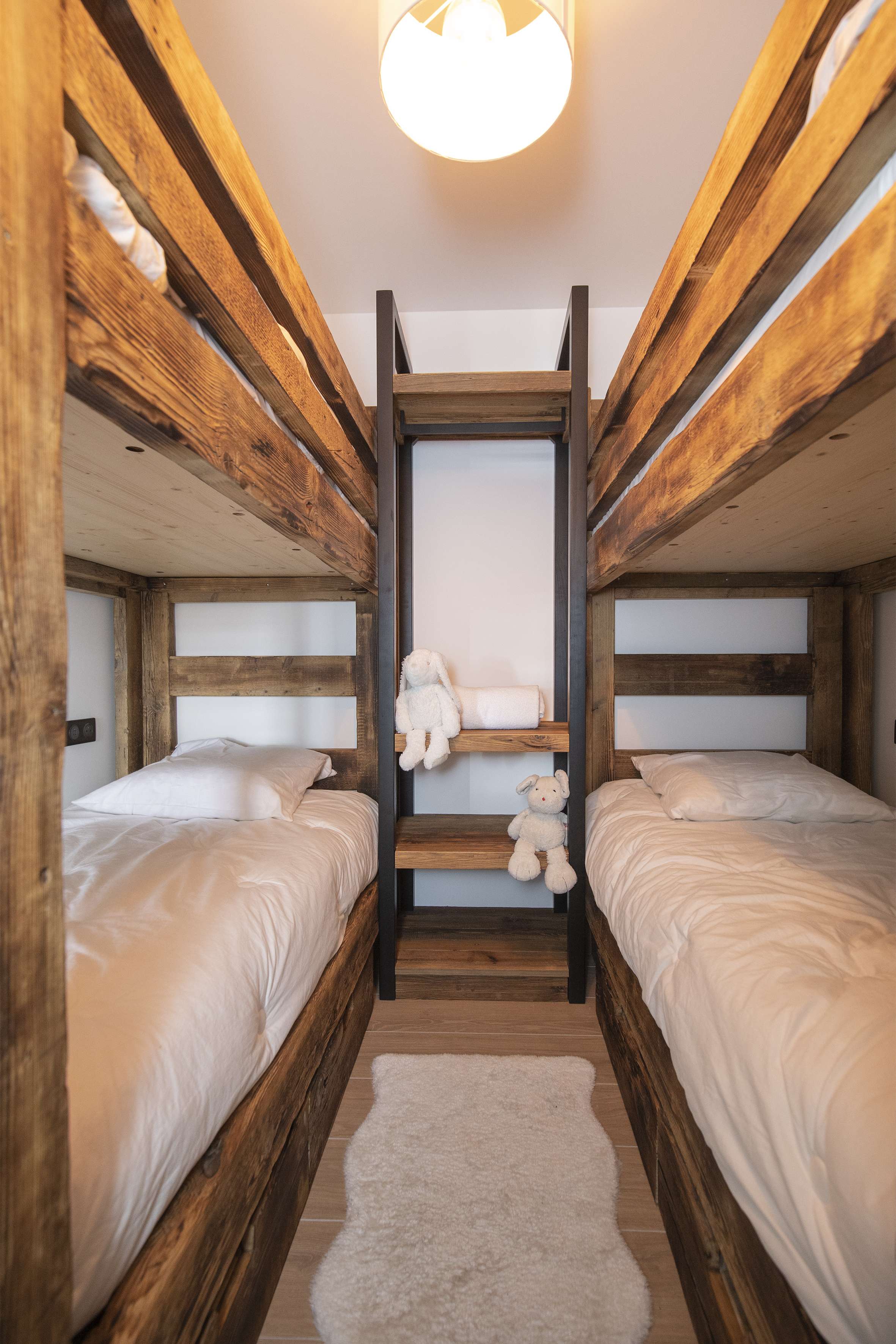 The dormitory is equipped with 2 bunk beds, i.e. 4 single beds (the upper bed is not suitable for children under 6) and its own shower.