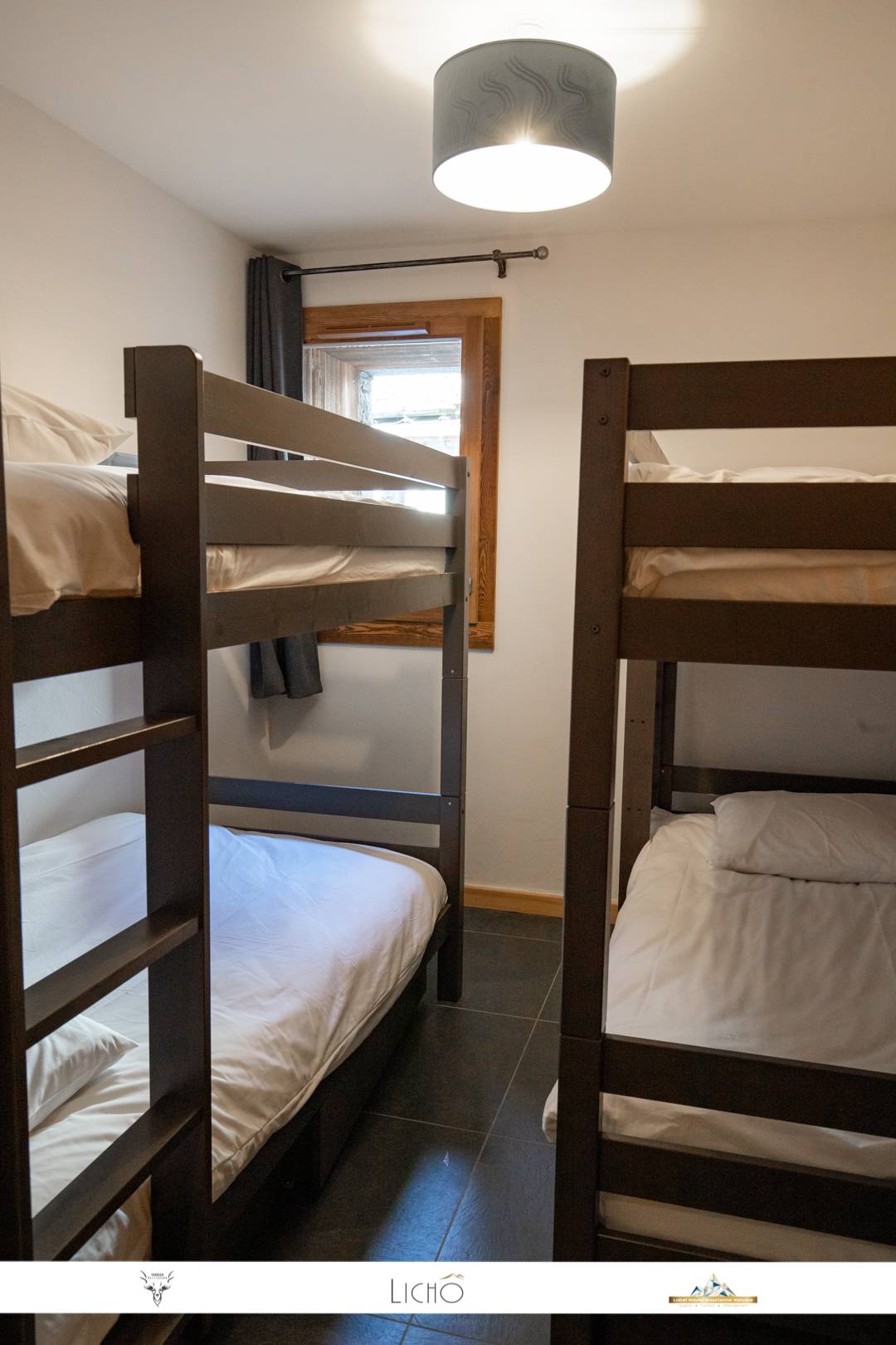 The dorm is equipped with 2 bunk beds, i.e. 4 single beds (the upper bed is not suitable for children under 6) and has a window facing north.