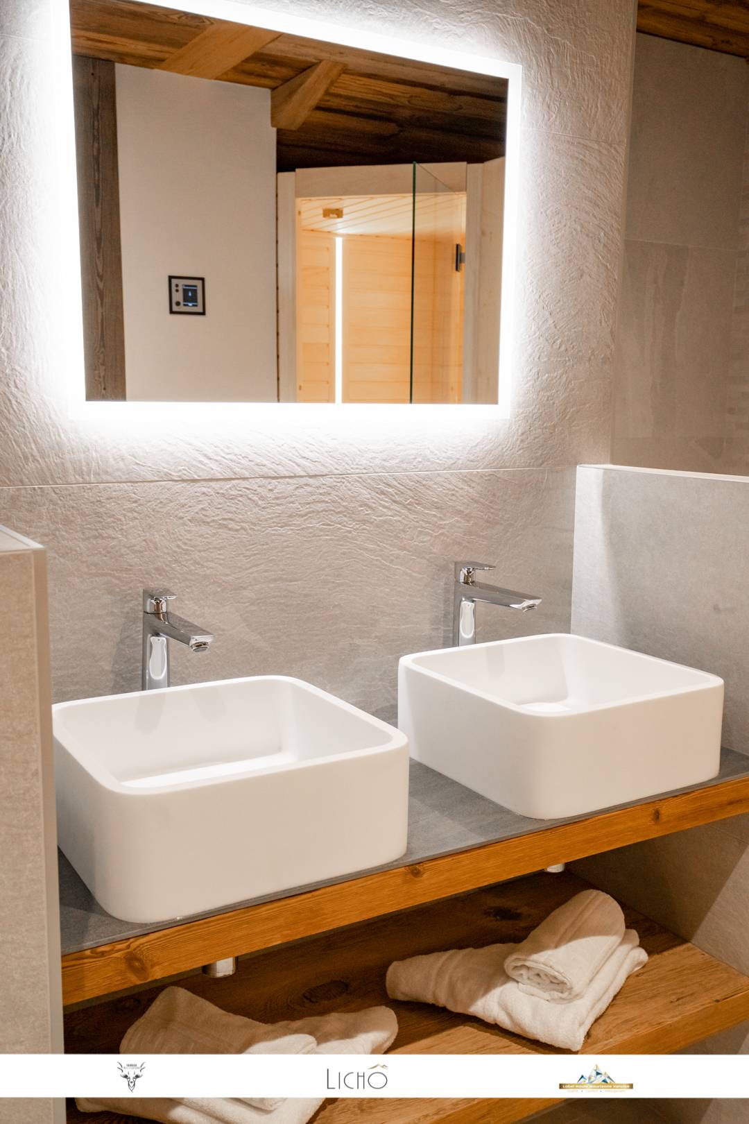 - A large bathroom with two sinks, a large shower, a toilet, a spa-bath and a sauna. The bathroom is also equipped with a washing machine and a dryer, a clothes line, an iron and ironing board.