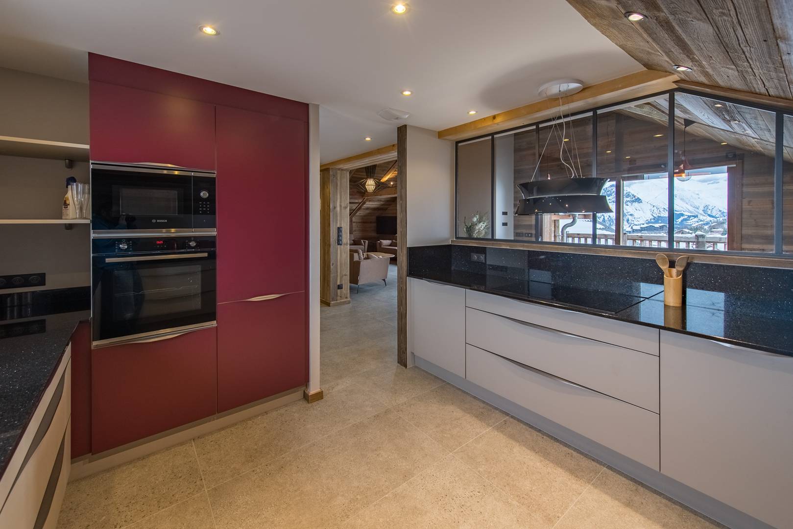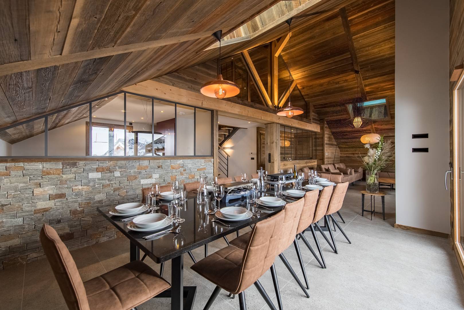 Upstairs, a large living room opening onto a terrace and the breathtaking view of the Aiguilles d'Arves. The living room offers a lounge area, a dining room and an equipped kitchen. The kitchen is equipped with all the necessary comforts (dishwasher, induction hob, oven, microwave, ...) while the living room offers a TV area and a fireplace.