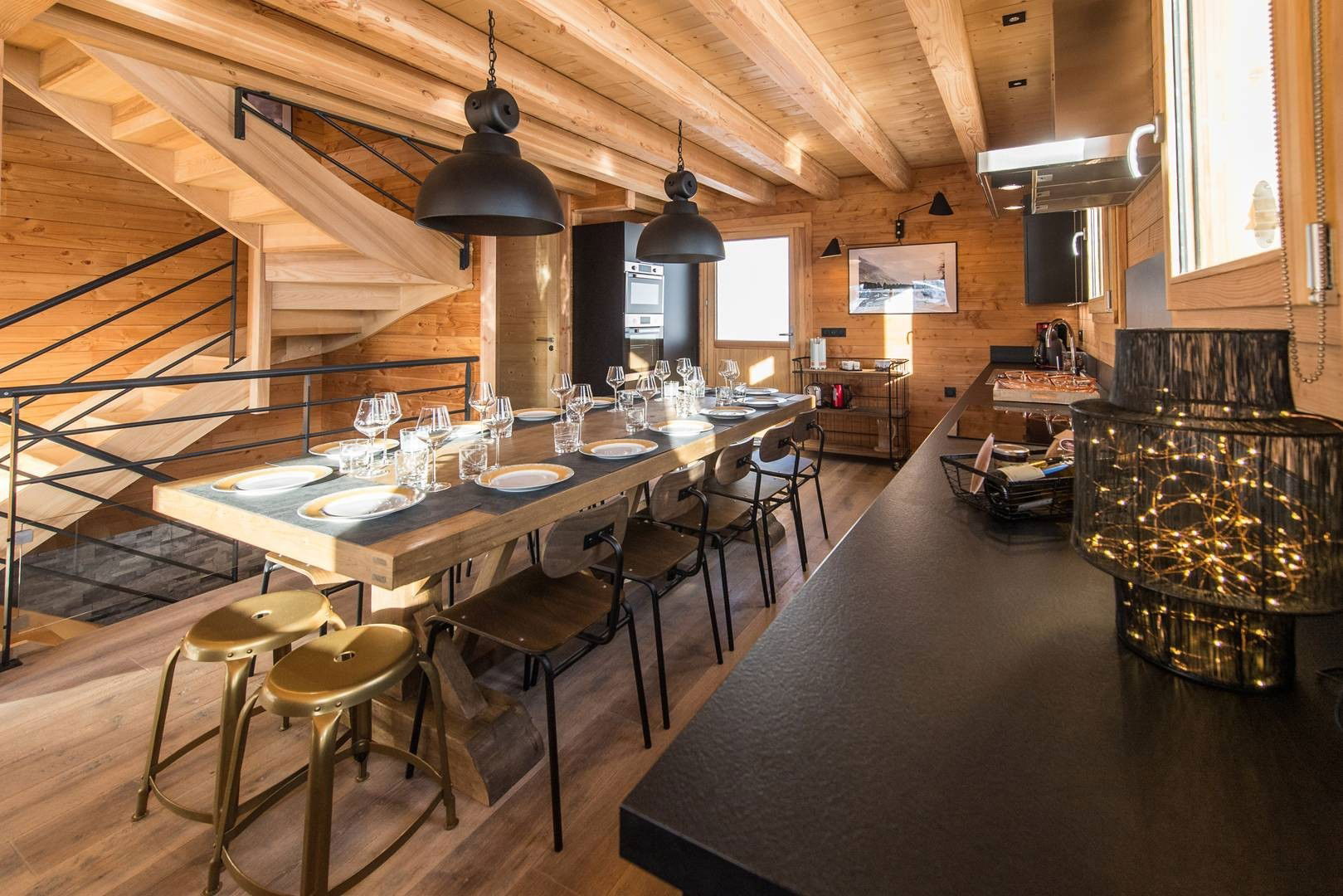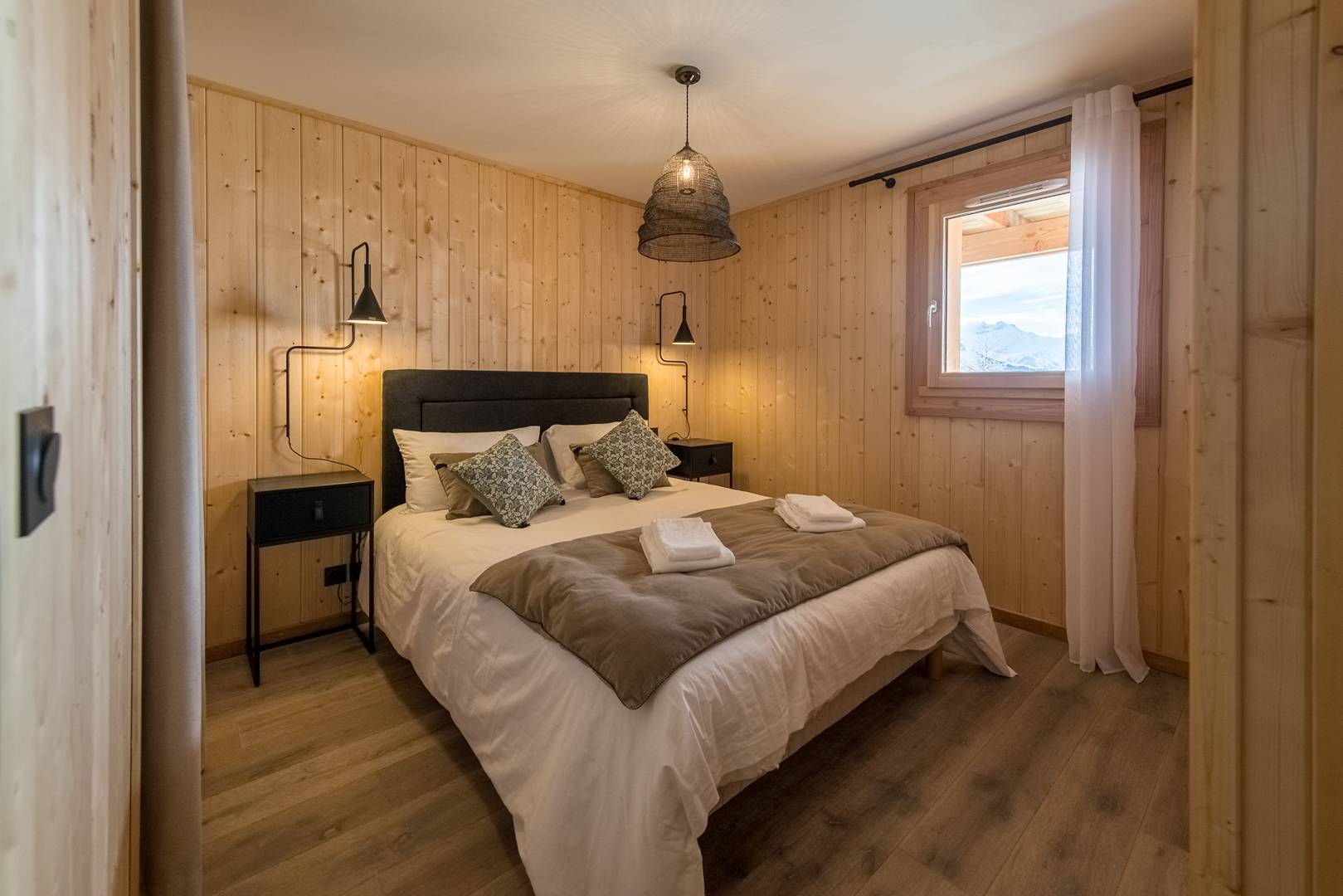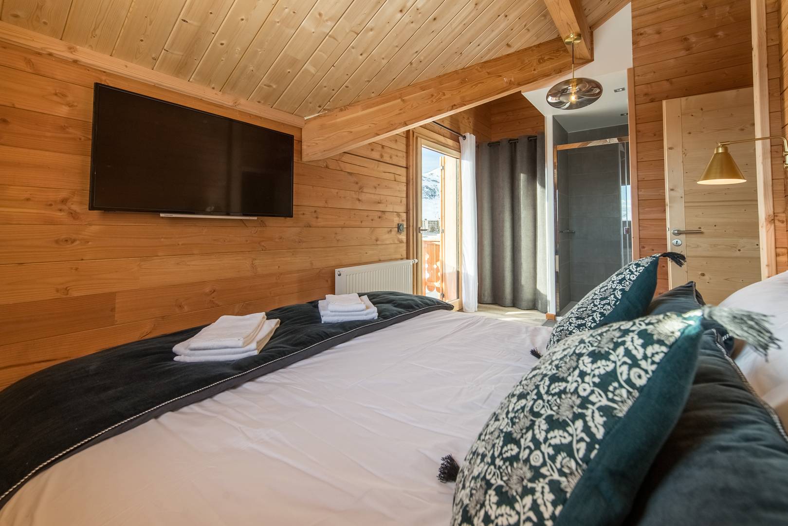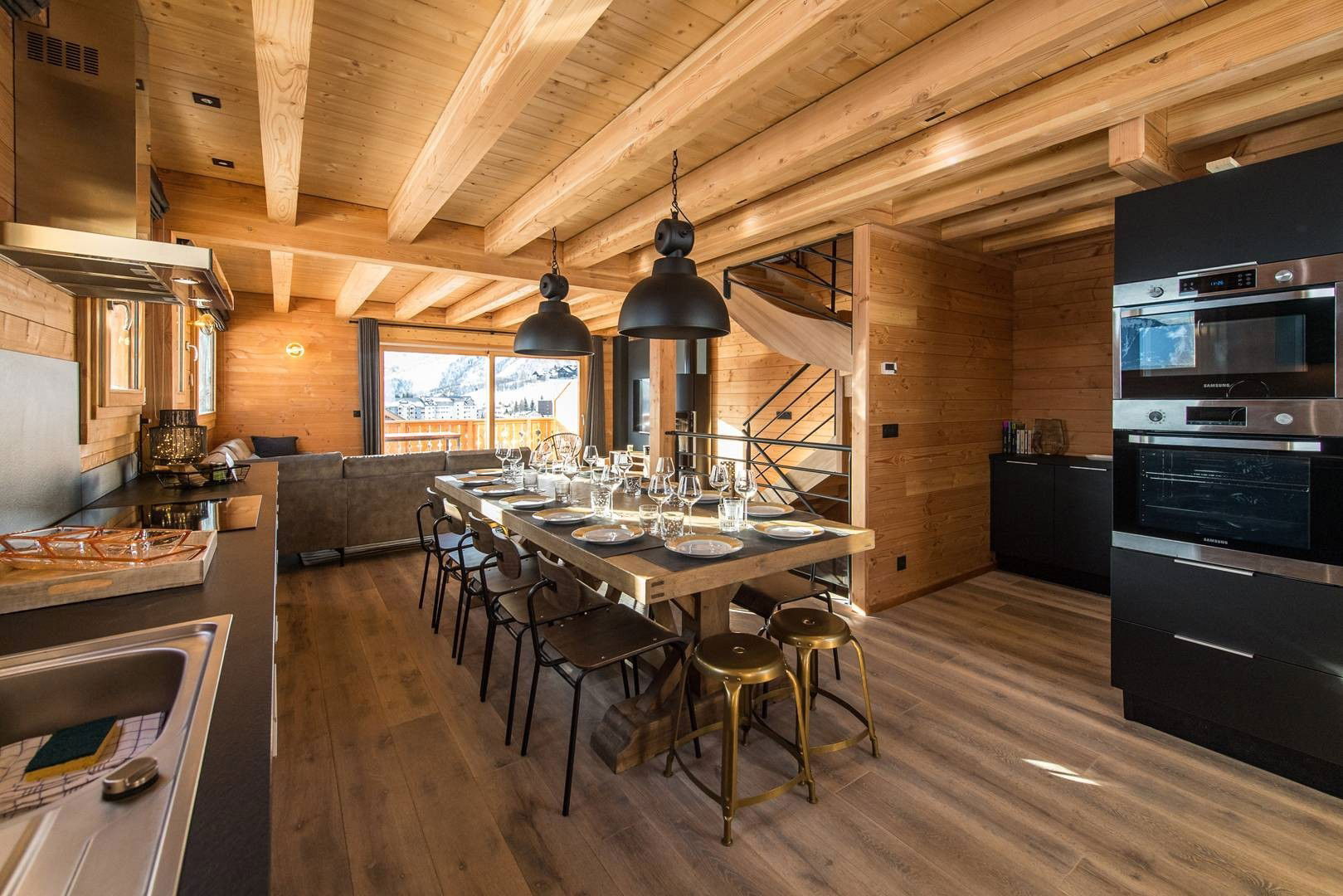 You will find a large living room opening onto a terrace and the breathtaking view of the Aiguilles d'Arves. The living room offers a lounge area, a dining room and an equipped kitchen. The kitchen is equipped with all the necessary comforts (dishwasher, induction hob, oven, microwave, ...) while the living room offers a TV area and a fireplace.