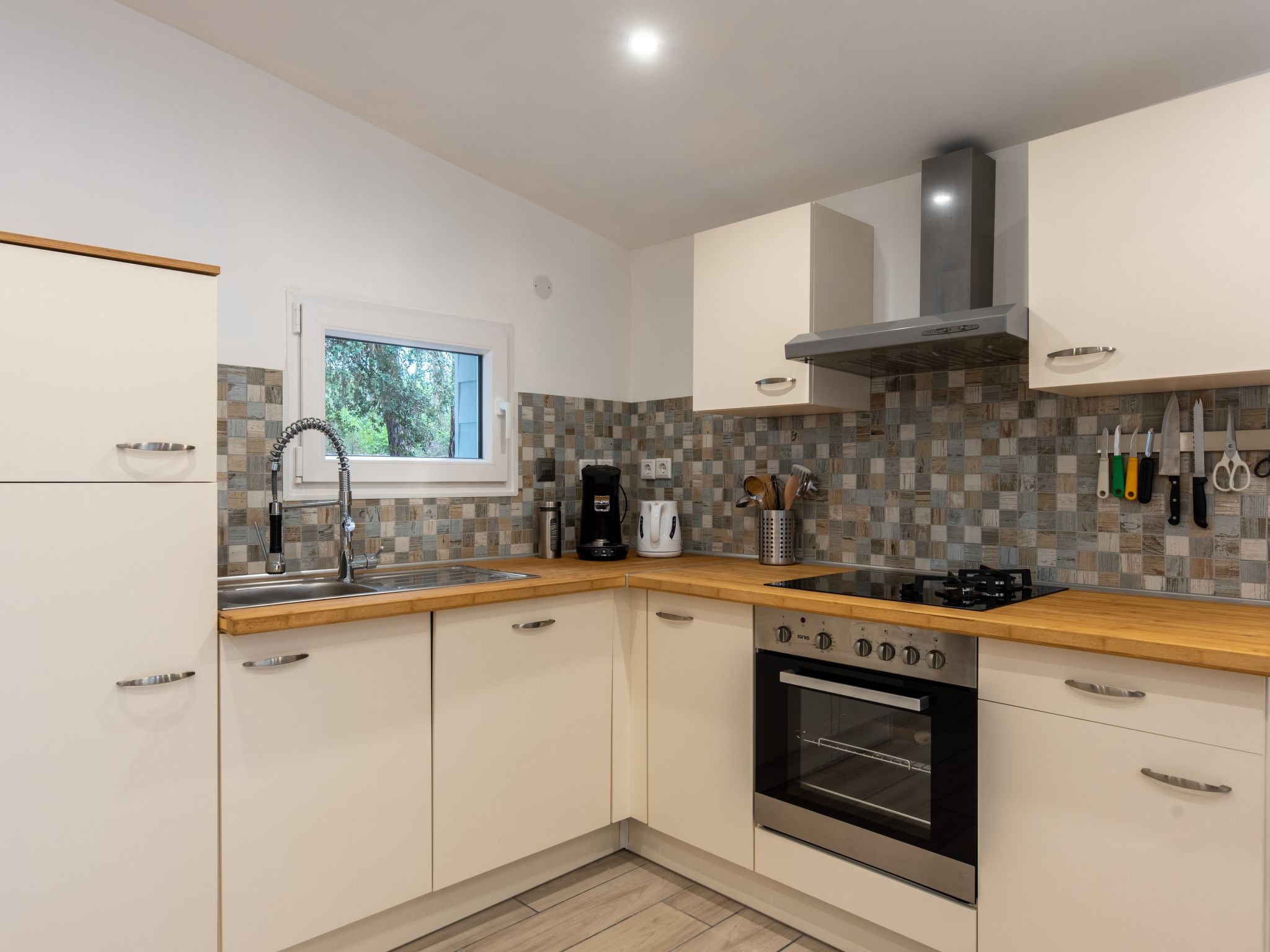 2-room cottage 40 m2. Fully renovated, comfortable and modern furnishings: living/dining room with 1 double sofabed (140 cm, length 190 cm), dining table. Exit to the terrace. 1 open room with 1 bed (160 cm, length 190 cm). Exit to the terrace. Open kitchen (4 hot plates, oven, dishwasher, kettle, electric coffee machine, Capsules for coffee machine (Senseo) extra). Shower/WC. Underfloor heating. Terrace 10 m2, large garden. Terrace furniture, electric barbecue (portable), deck chairs (2). Partial view of the lake. Facilities: washing machine, children's high chair, baby cot, hair dryer. Internet (WiFi, free). Reserved parking (1 car). Please note: non-smoking house. Smoke alarm, fire extinguisher. Offer by a private individual according to Art. 155, IV of CGI.