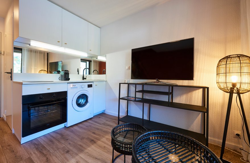 The 30m2 apartment has been completely renovated in 2020. It is composed of a kitchen open to the living room and the dining area benefits from large bay windows. You will have several storage spaces available. Upstairs: the bedroom and the bathroom with shower and washbasin accessible by a Japanese staircase as you can see in the photos.