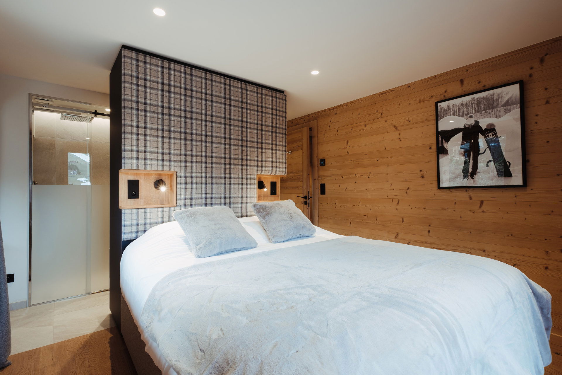 - BEDROOM (13.55 m²) : 1 DOUBLE BED (160), flat screen TV, east french window, village / mountains / nextdoor chalets view, south facing window, mountains / next door chalets, adjoing SHOWER ROOM (2.41 m²) : washbasin, walk-in shower, WC, wall heating towel dryer,