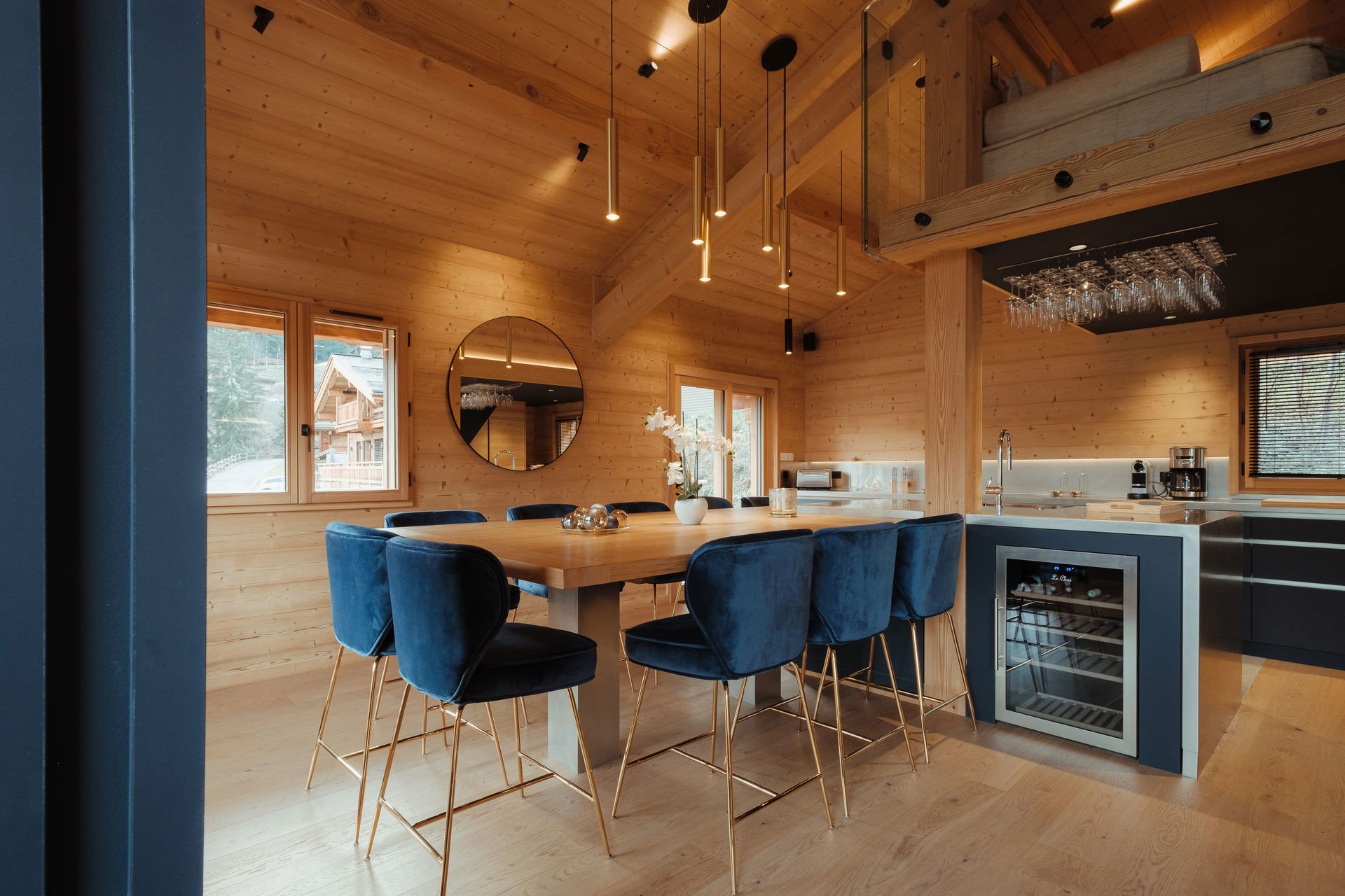 - Open plan KITCHEN : fridge + freezer (267L), INDUCTION STOVE, OVEN, MICROWAVE, 2 DISHWASHERS, WINE CELLAR, NESPRESSO coffee machine, west facing window, vegetation / next door chalets view, south facing window + south facing sliding bay window, access south/east terrace, mountains / next door chalets view.