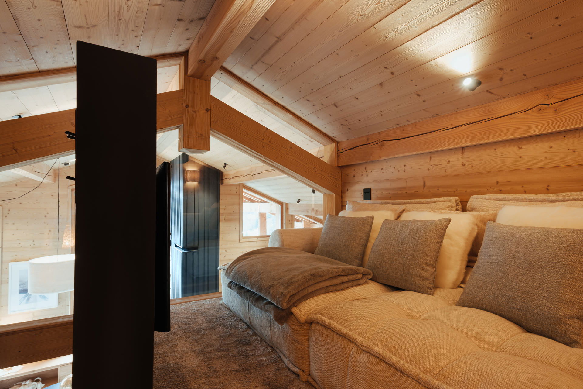 - LIVING-ROOM (55.85 m²) : FIREPLACE, flat screen TV, east facing fix bay + sliding bay window, access south/east terrace, village / mountains / next door chalets view