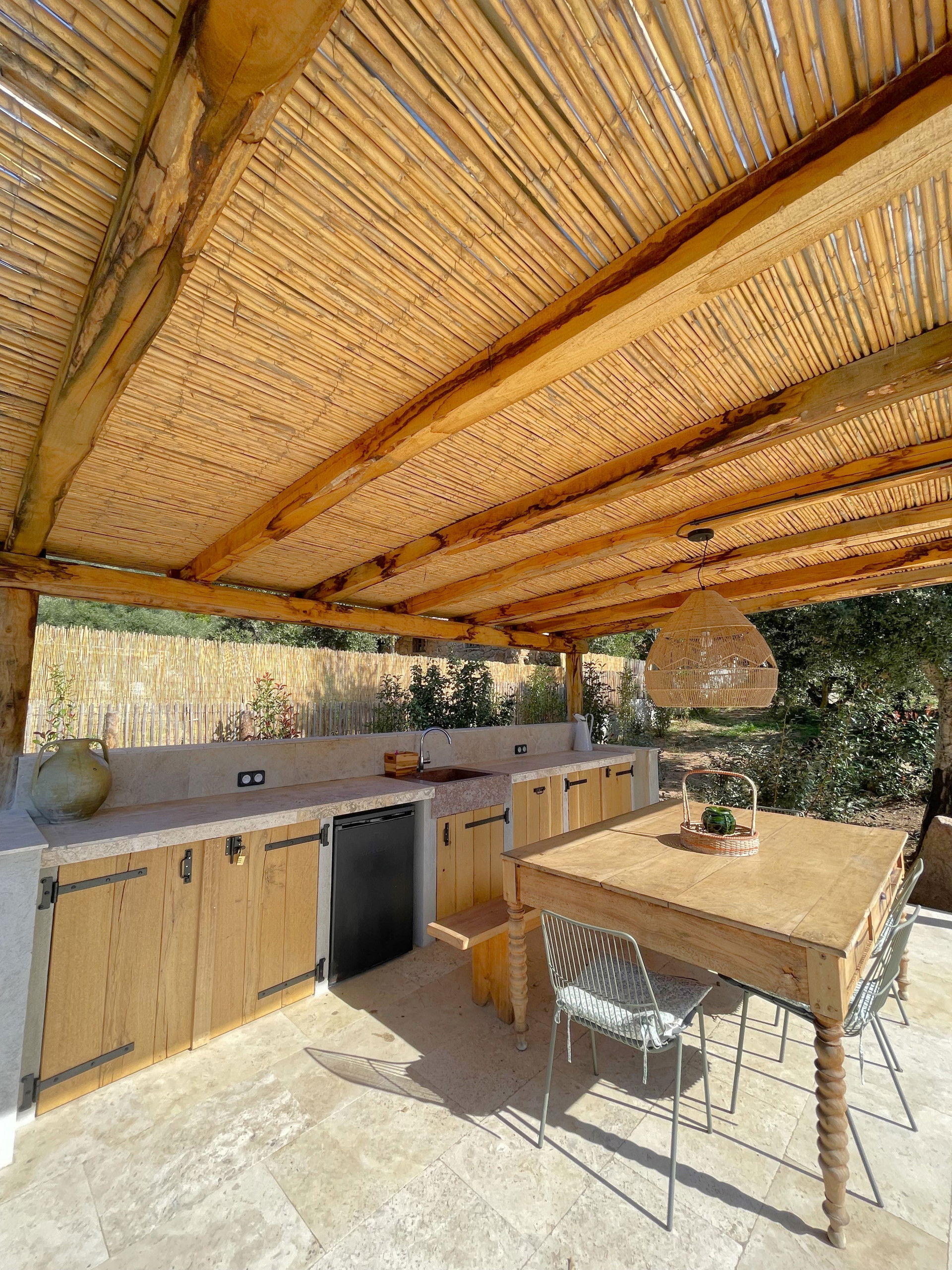 Beautiful fully furnished exterior with shaded kitchen with a refrigerator, dishwasher and electric plancha.