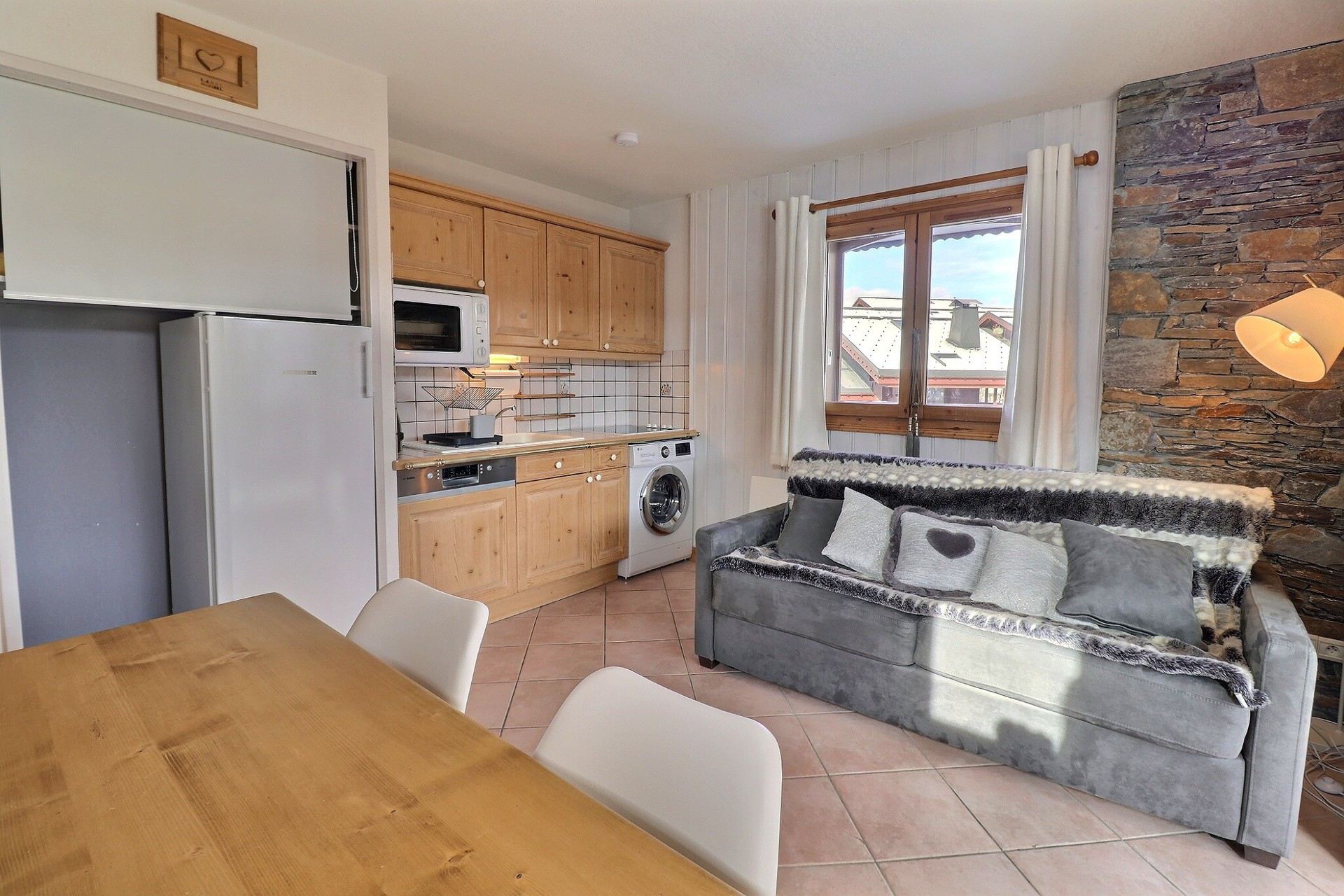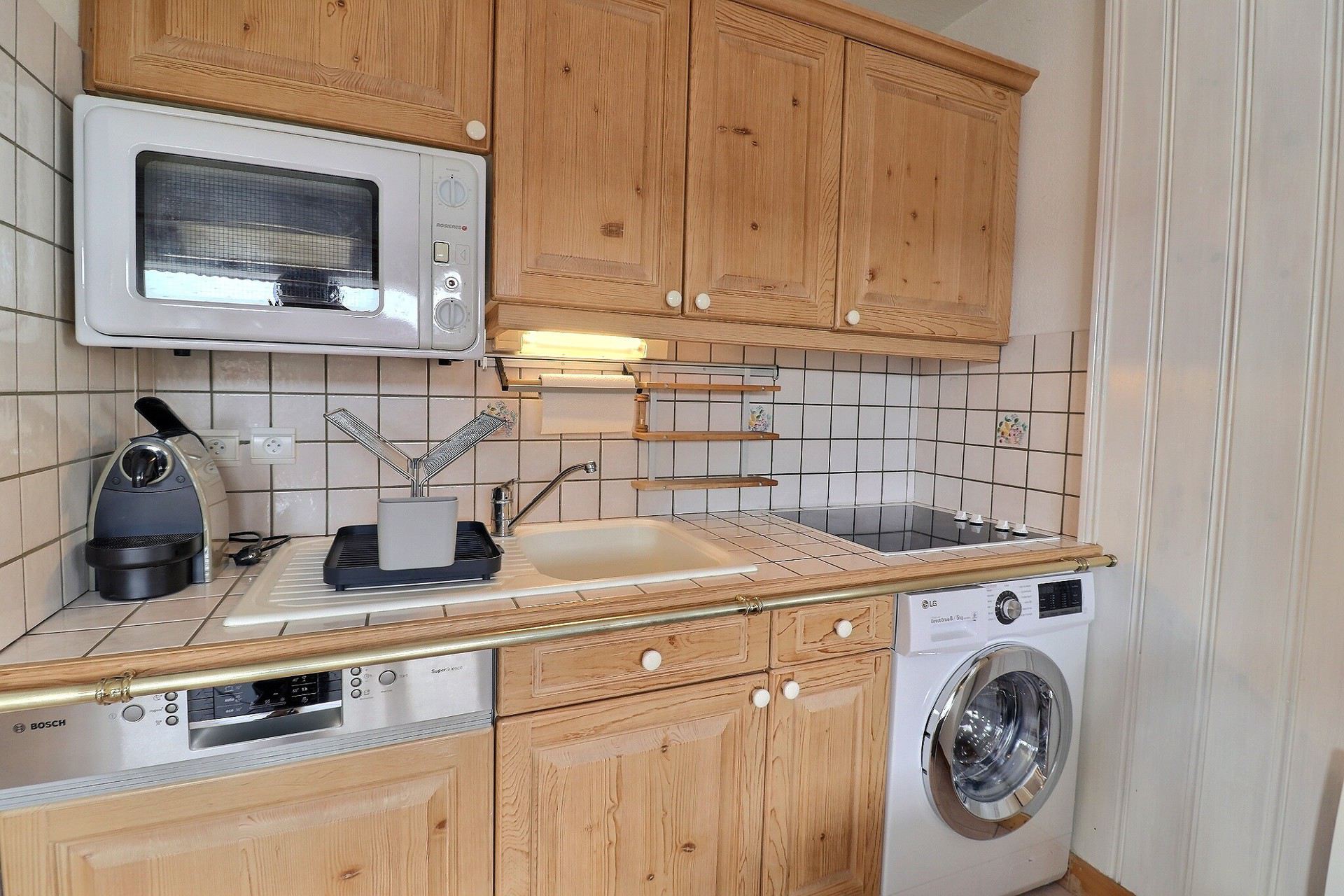 Open kitchenette : oven, fridge, dishwasher, 4 ceramic hobs, 1 Nespresso coffee machine, toaster, kettle, washing machine with dryer