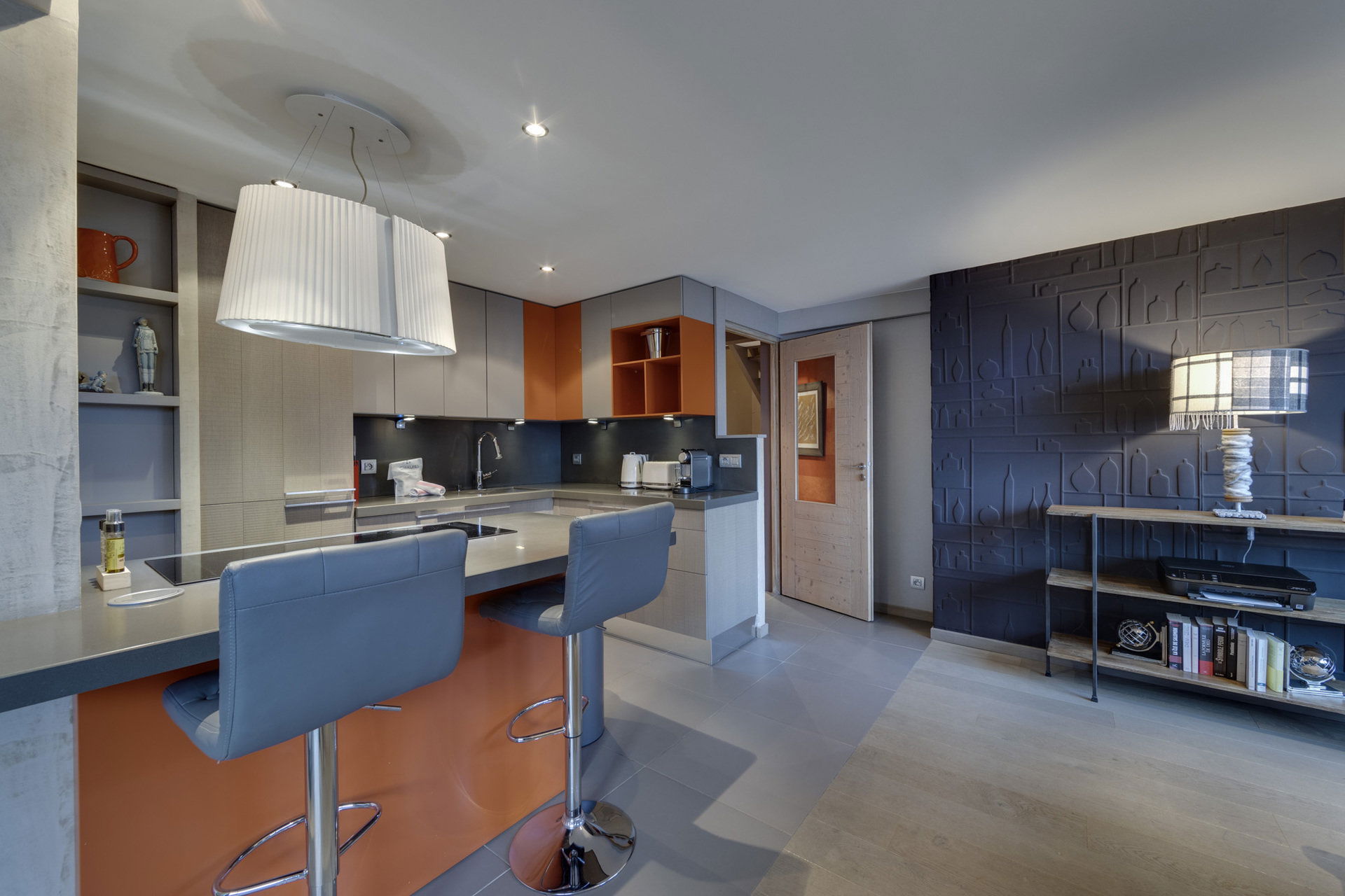 - Equipped kitchen open to the living room (2 bar chairs)