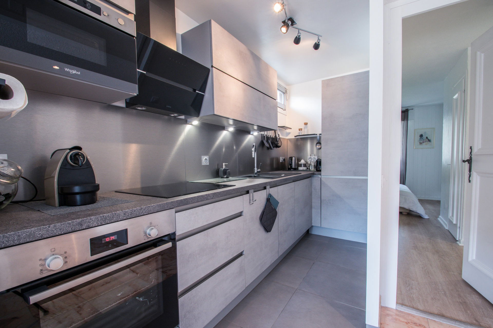 - Open kitchen equipped with oven, microwave, induction hob, hood, dishwasher, washing machine, fridge and freezer.