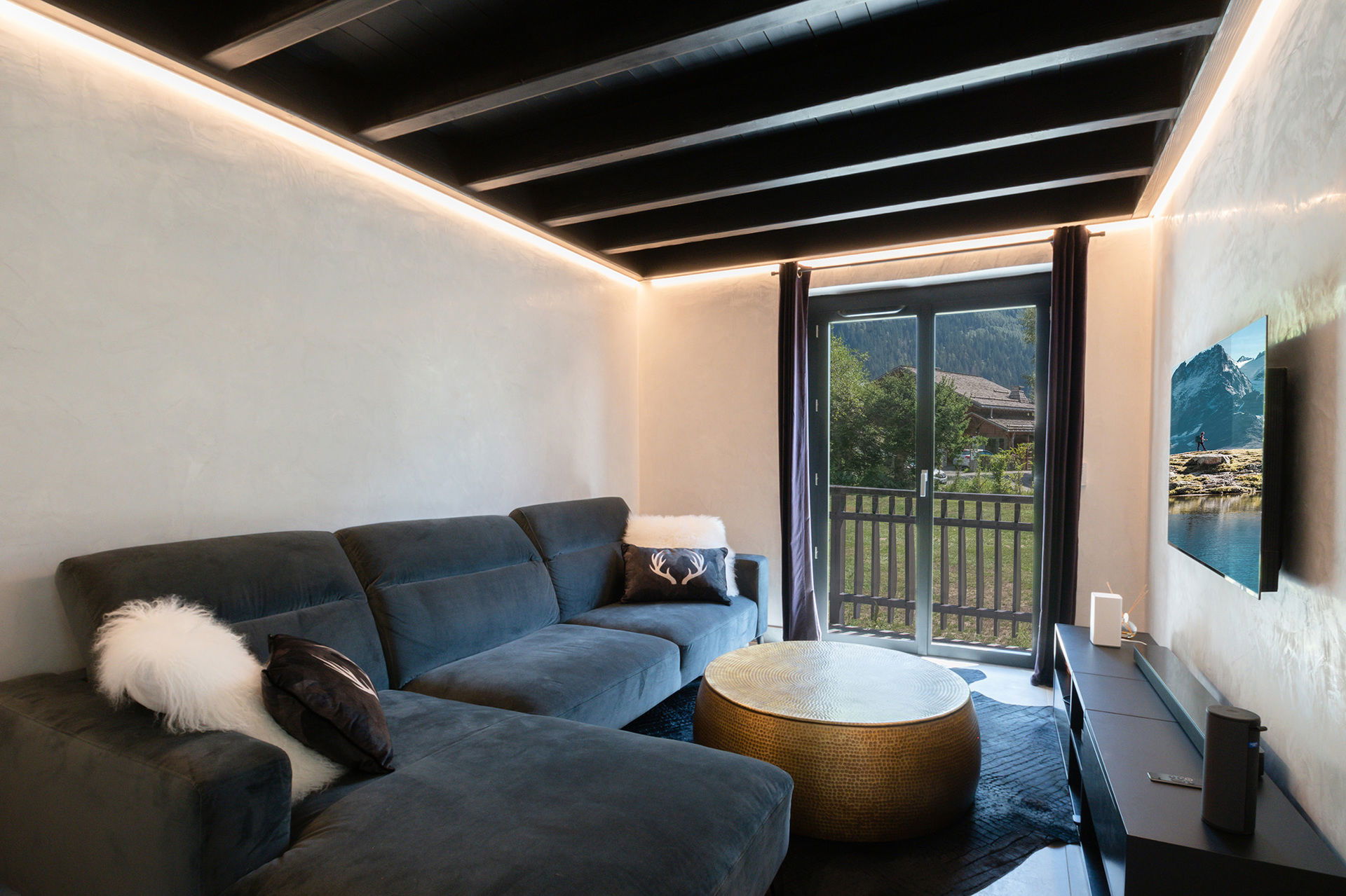 Half chalet on 3 levels of 150m², for 8 people, located in the residential area of Les Praz, 2km from the centre of Chamonix.