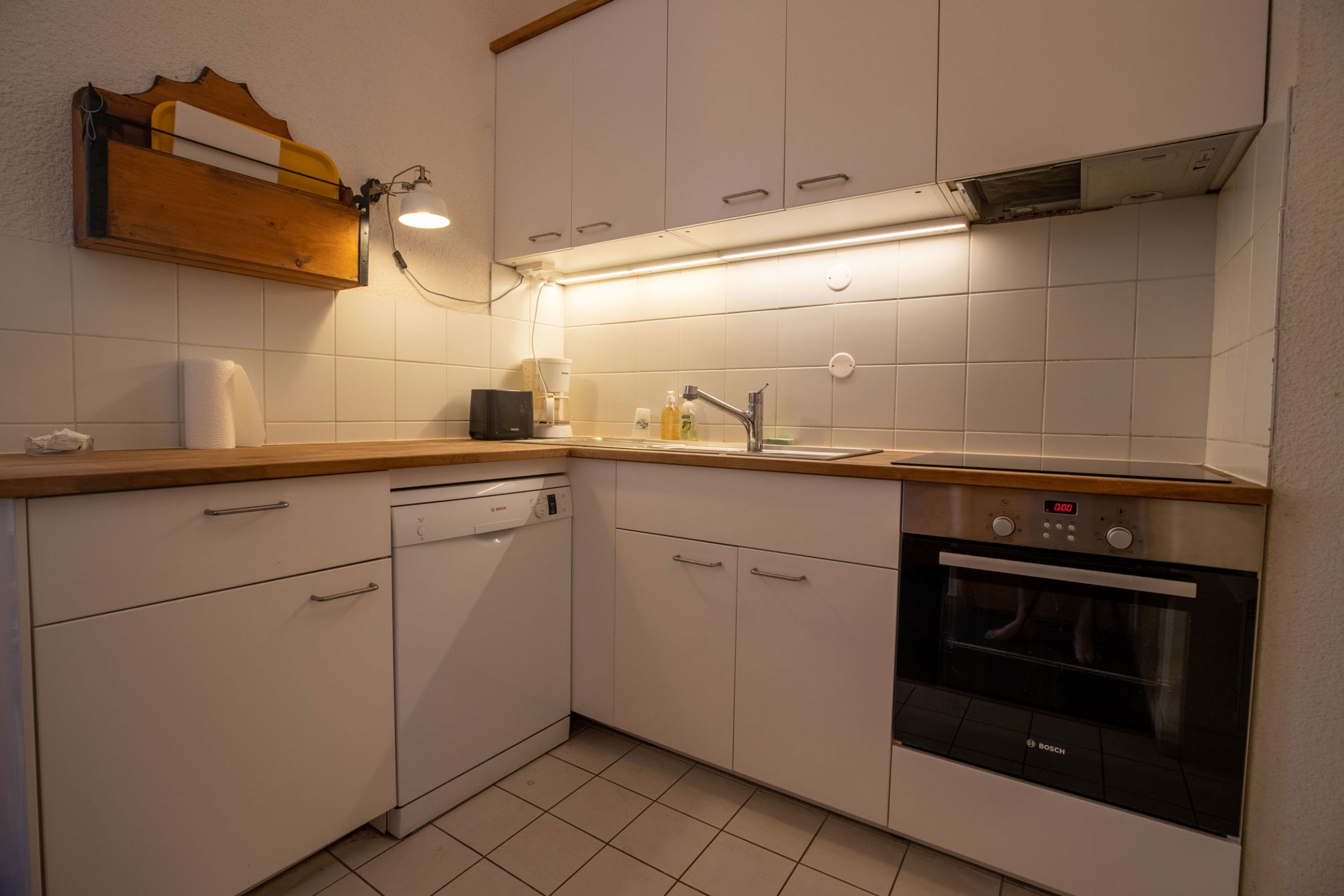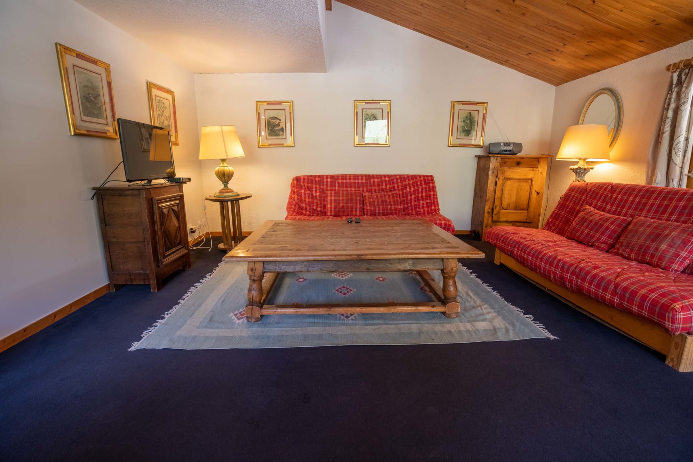 The apartment is arranged on the upper floor of a large living room with two sofas and a large dining room with high ceilings. The equipped kitchen open to the dining area. You will also find a separate toilet.