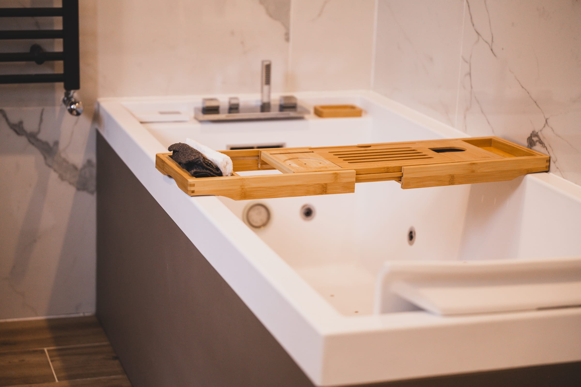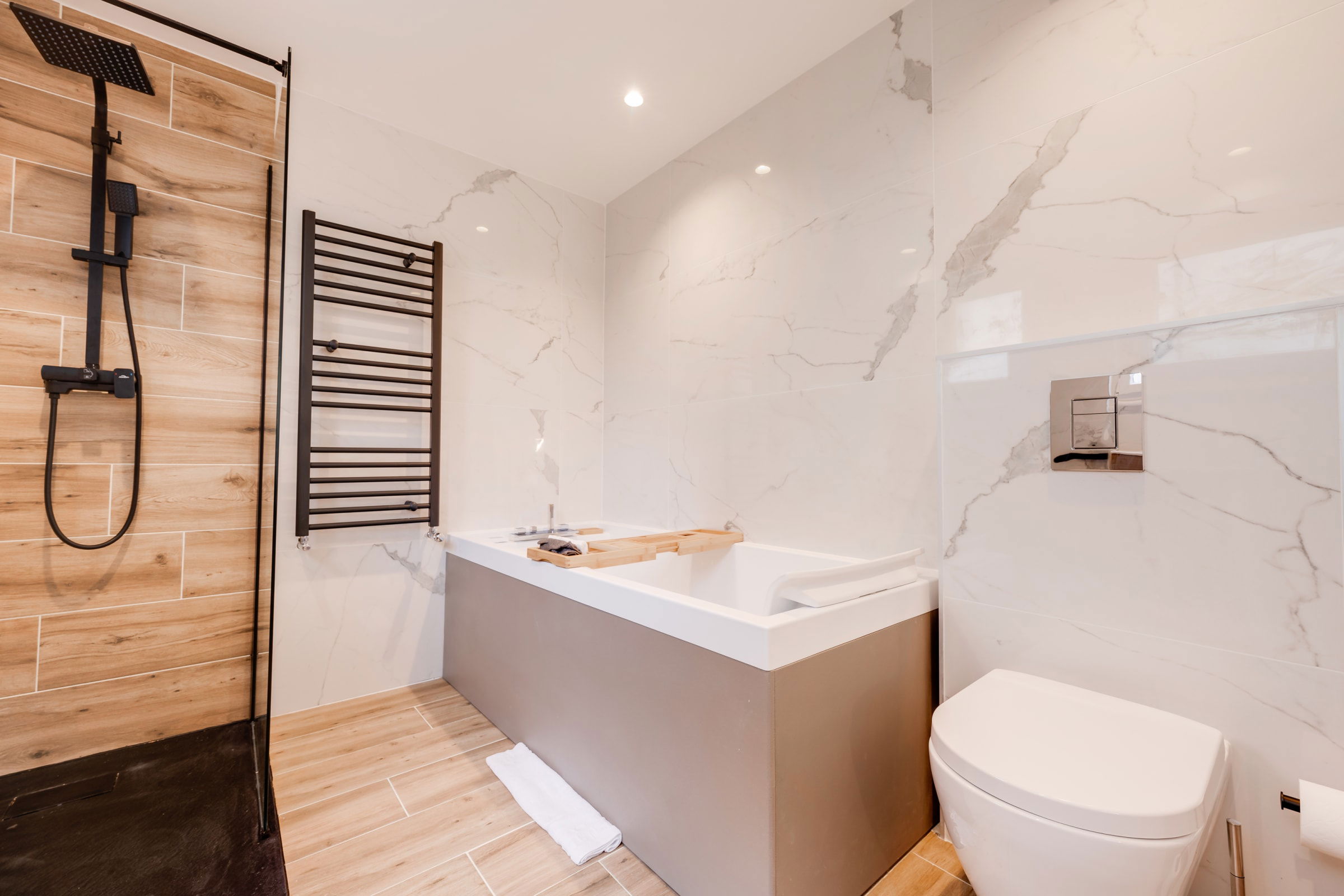 The bathroom is equipped with a shower, a whirlpool bath and a toilet.
